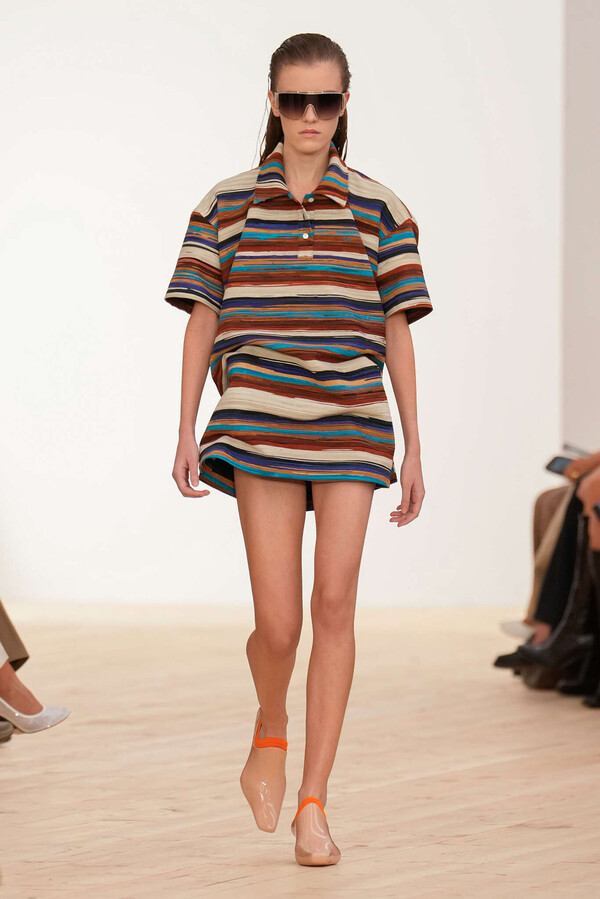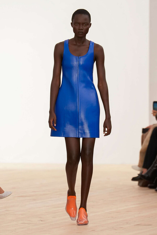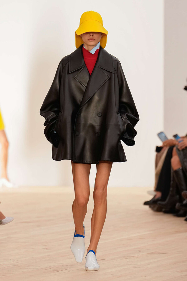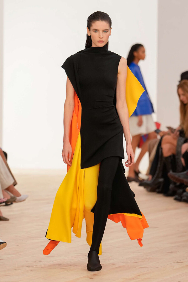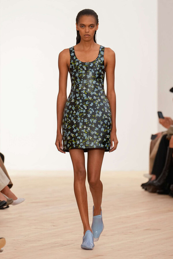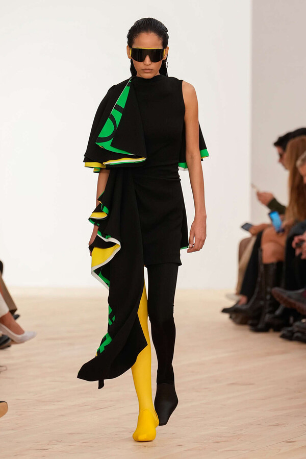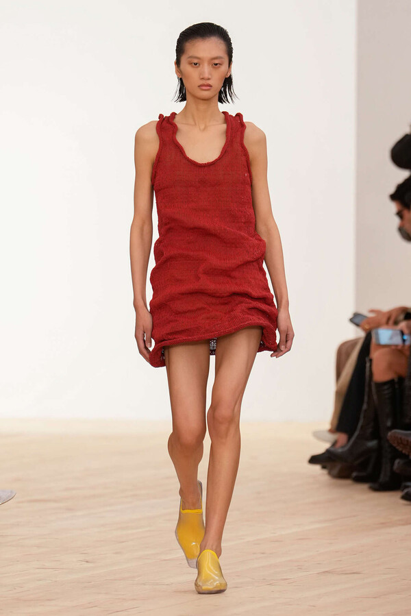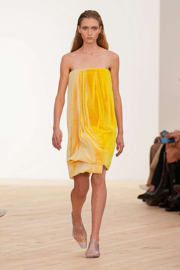 本季还引入了材质创新。其中一款风衣采用丝绸 Gore-Tex 混合面料制成;连衣裙模仿了毛巾的柔软质感,但实际上采用 3D 打印材质制成,并带有天鹅绒般的绒毛。层叠的围巾连衣裙搭配毛边荷叶边,将轻松的穿着体验与细致做工完美融合。这种触觉实验与可穿戴廓形的相互辉映,体现了 LOEWE 将工艺与科技融合,同时不失其核心手工工艺的渴望。