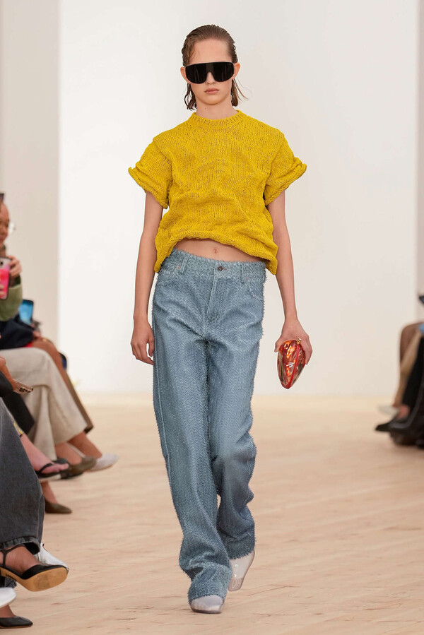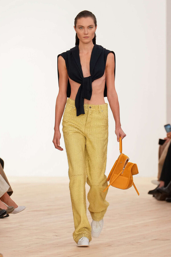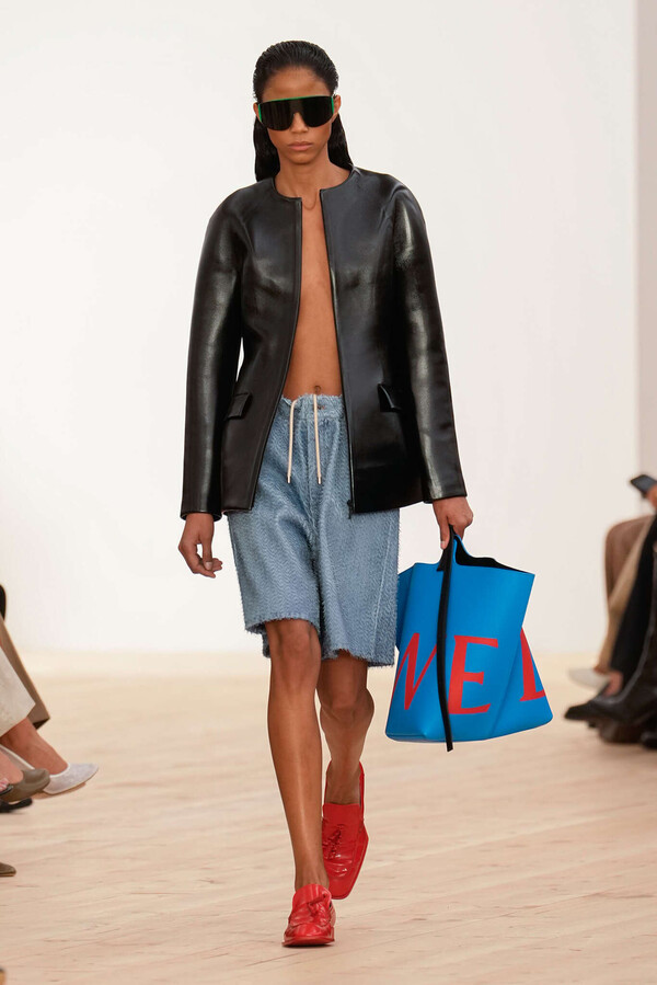 LOEWE 的 DNA——皮革以意想不到的方式被重新演绎。夹克被塑造成钟形,并采用热封光泽处理;纽扣衬衫、牛仔裤、背心则完全以皮革重塑,或打褶、喷漆,或撕碎成牛仔布的质感。甚至 T 恤也被重新构思——用皮革「纱线」编织而成,纹理被处理成富有弹性的褶皱。这些转变凸显了两位设计师对工艺的执着追求,以及特有的不羁精神。