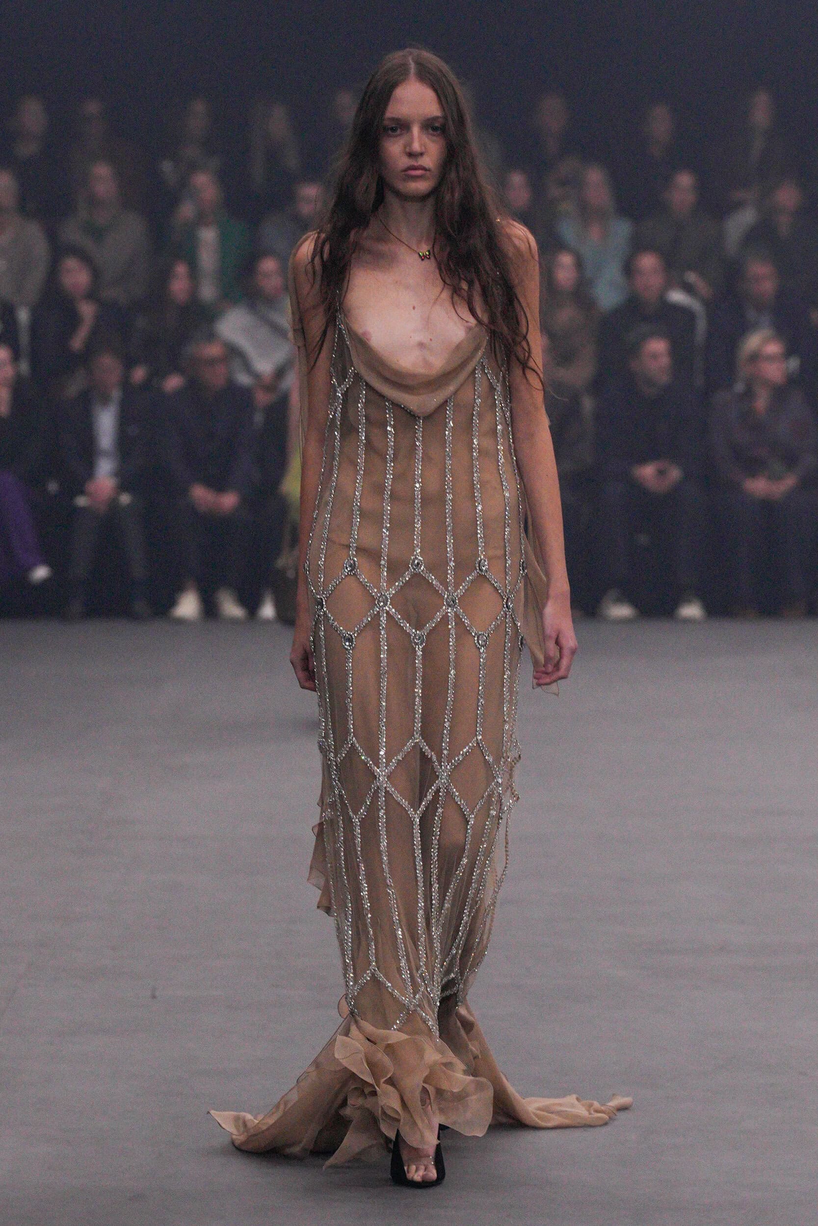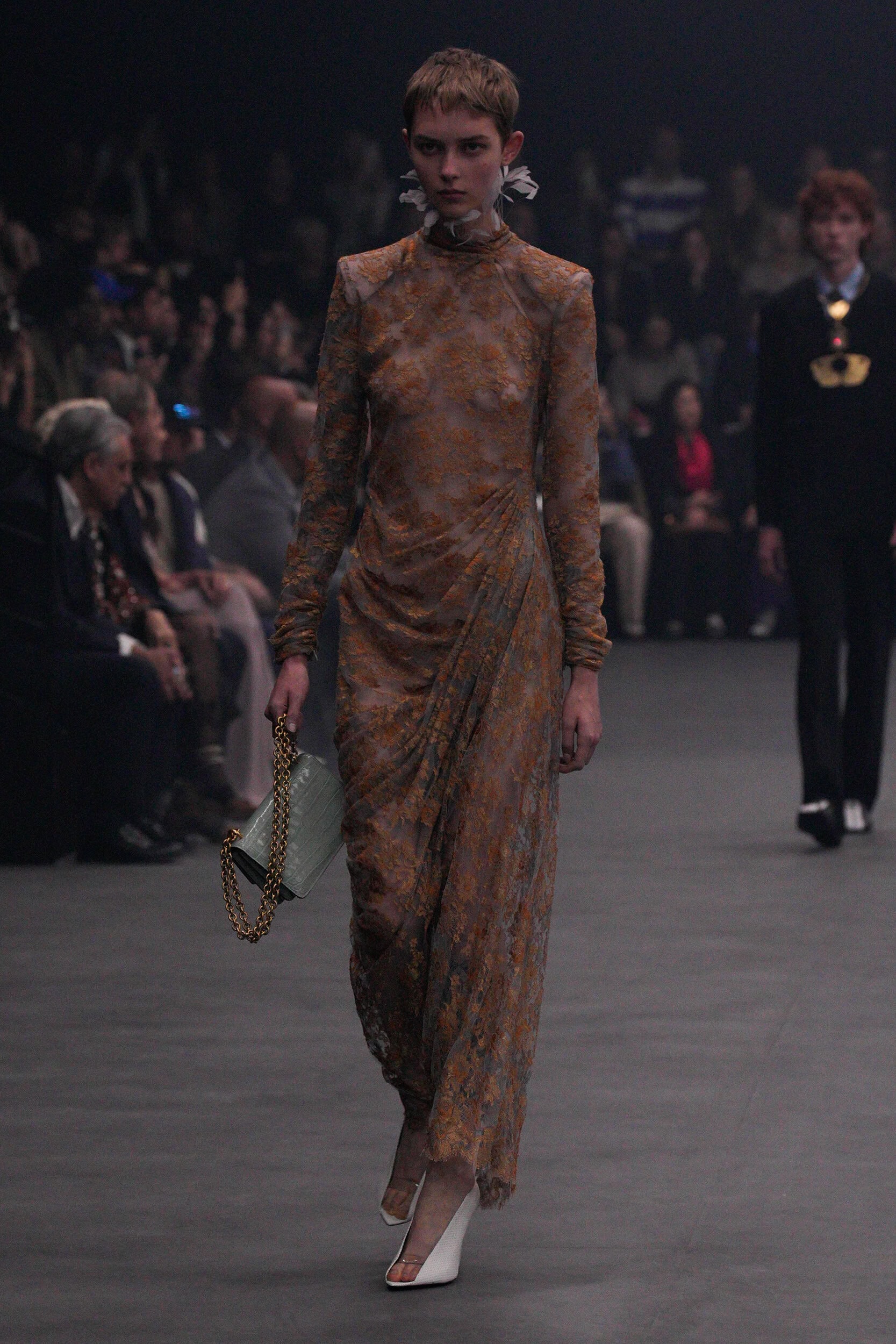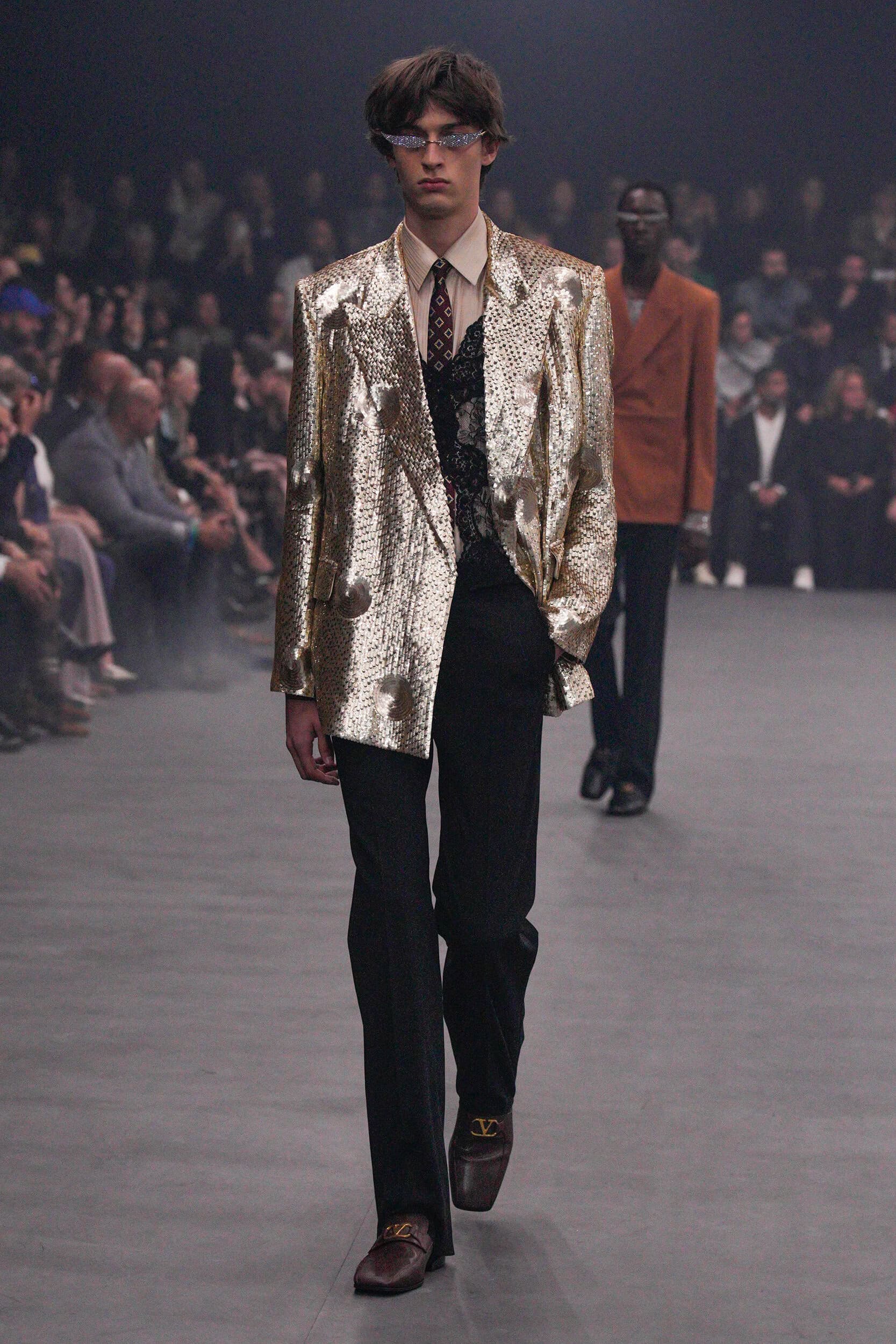 Alessandro Michele 的设计语言与 Valentino Garavani 的原始愿景注定会交汇。两位设计师都将美视为信仰——装饰是情感,工艺是道德行为。Valentino Garavani 的蕾丝和刺绣曾传递优雅,而 Alessandro Michele 赋予其象征意义、历史感与细腻关怀。从奢华到优雅,这一转变成就了如今 VALENTINO 的灵魂。色调方面,蜡烛光般的象牙白、褪色的石榴红和献祭金色等,传递了记忆,却无怀旧之感。