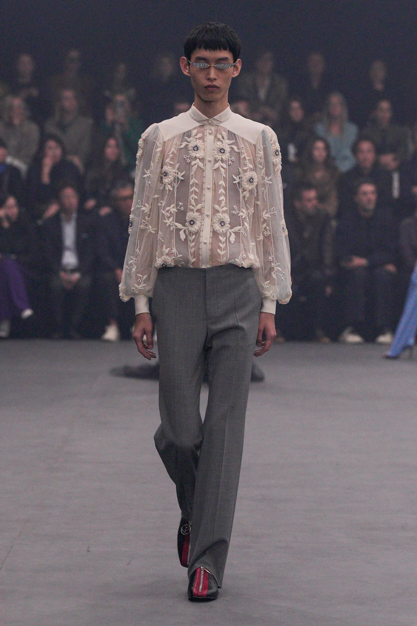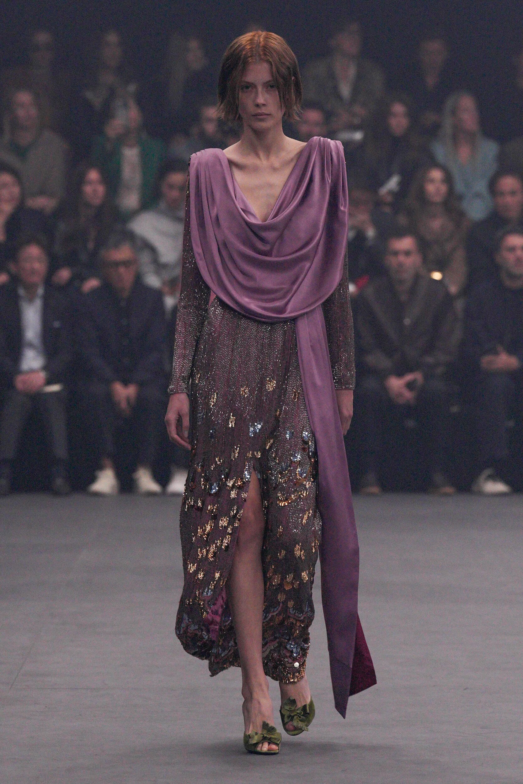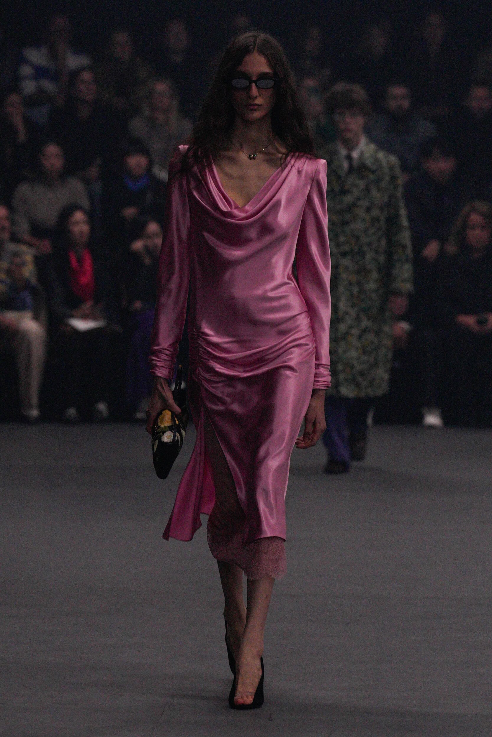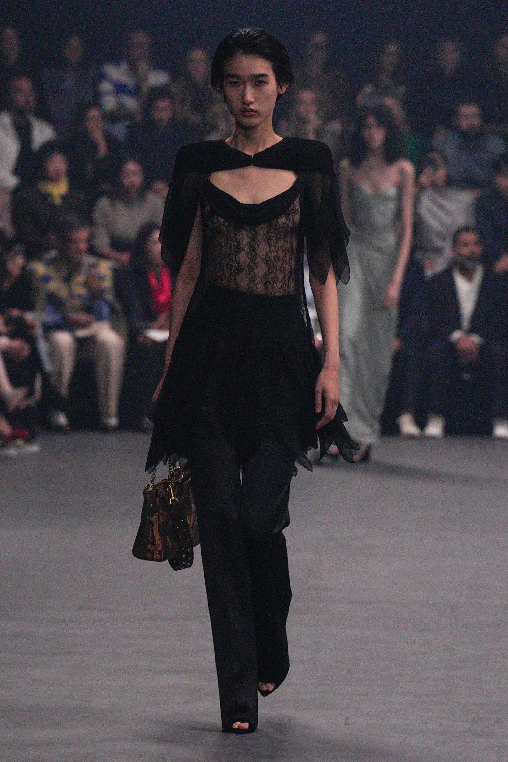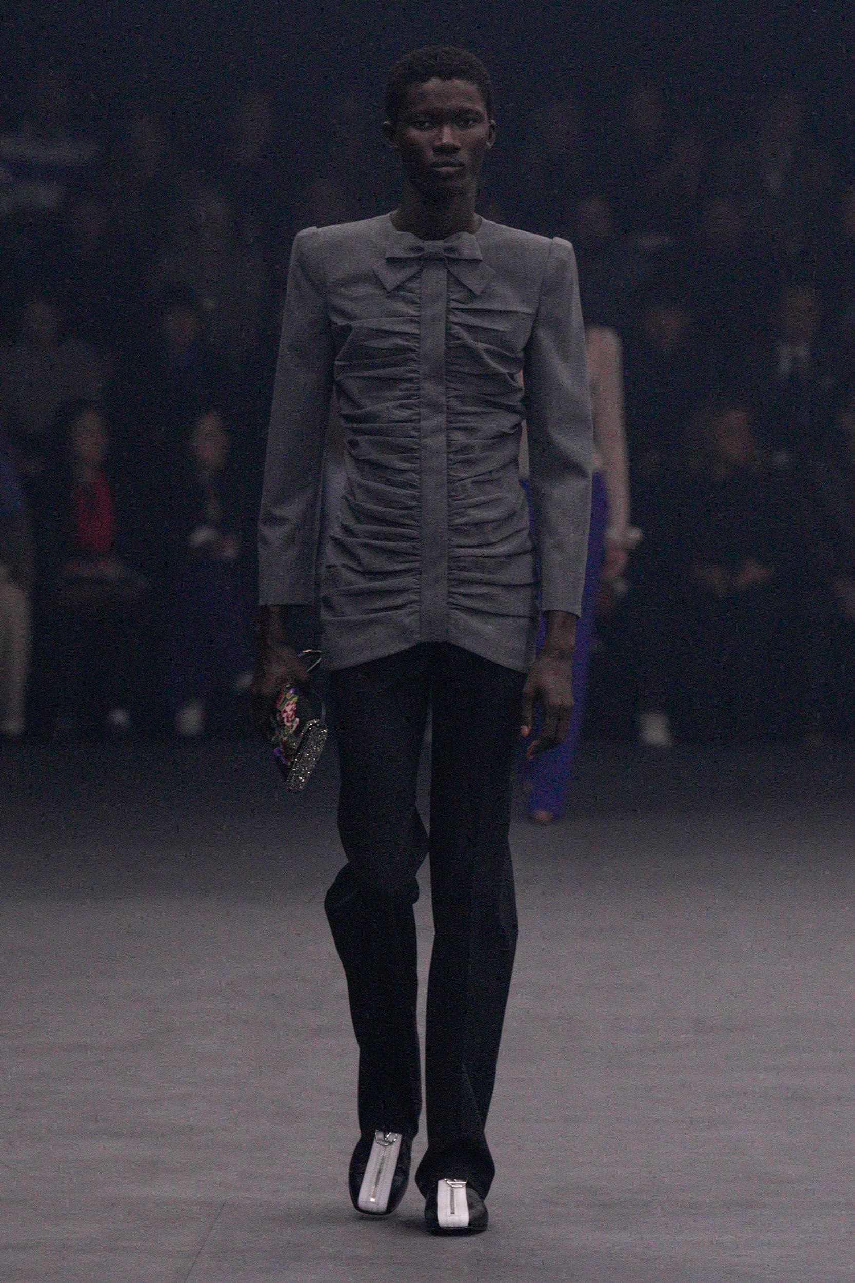 本季剪裁在低调中散发坚定的力量:偏移裁剪的晚礼服在结构化外套下滑动,蕾丝面纱与精致剪裁的西装搭配,复杂的褶皱与僧侣风格的垂坠感交织。Alessandro Michele 在工作坊中找到了共鸣——不再是神圣的,而是诗意的。这一系列似乎在轻声询问,或许时尚的真正奢华就是静心自省。