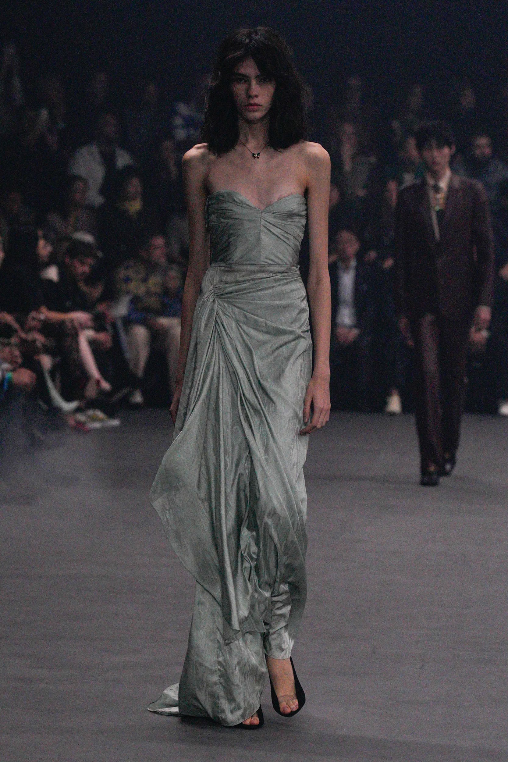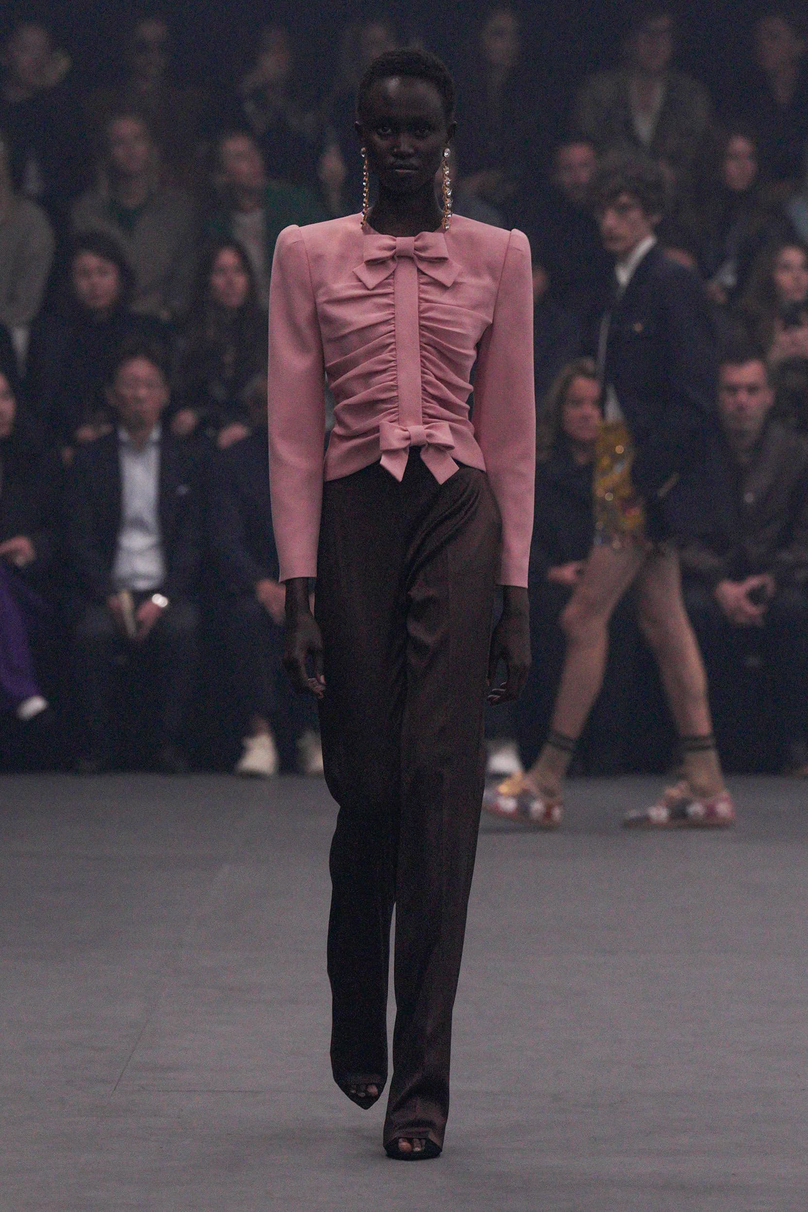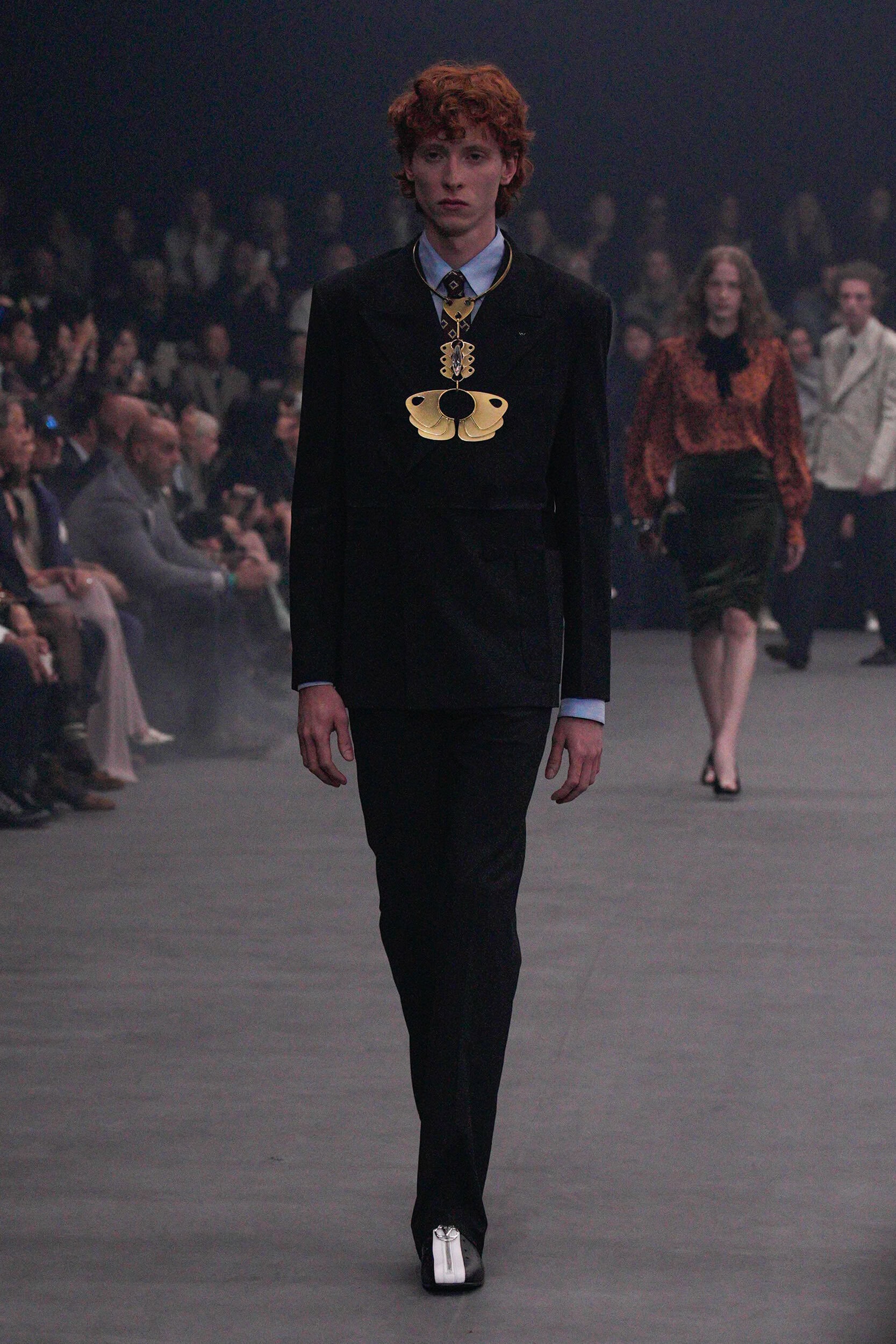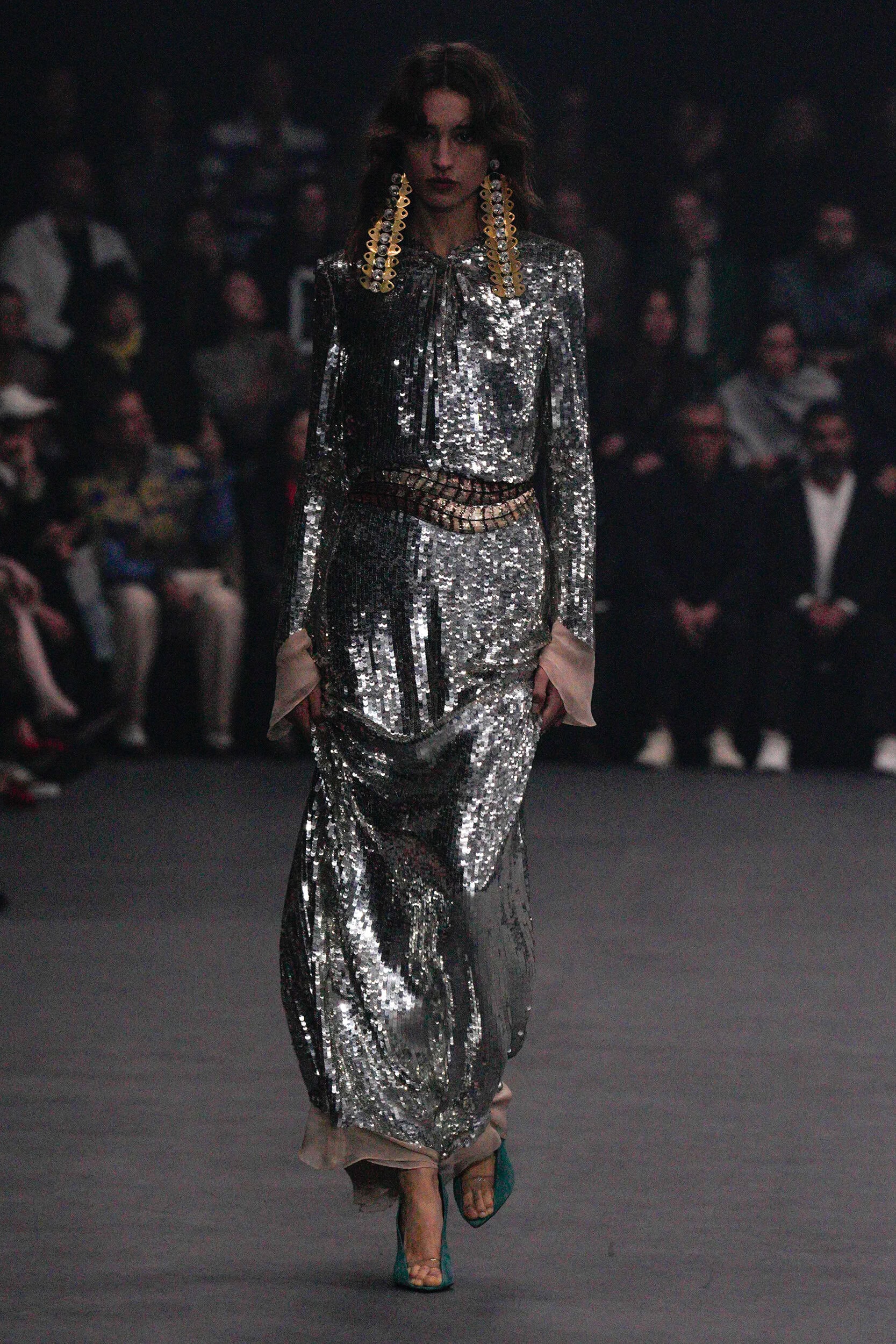 本季剪裁在低调中散发坚定的力量:偏移裁剪的晚礼服在结构化外套下滑动,蕾丝面纱与精致剪裁的西装搭配,复杂的褶皱与僧侣风格的垂坠感交织。Alessandro Michele 在工作坊中找到了共鸣——不再是神圣的,而是诗意的。这一系列似乎在轻声询问,或许时尚的真正奢华就是静心自省。