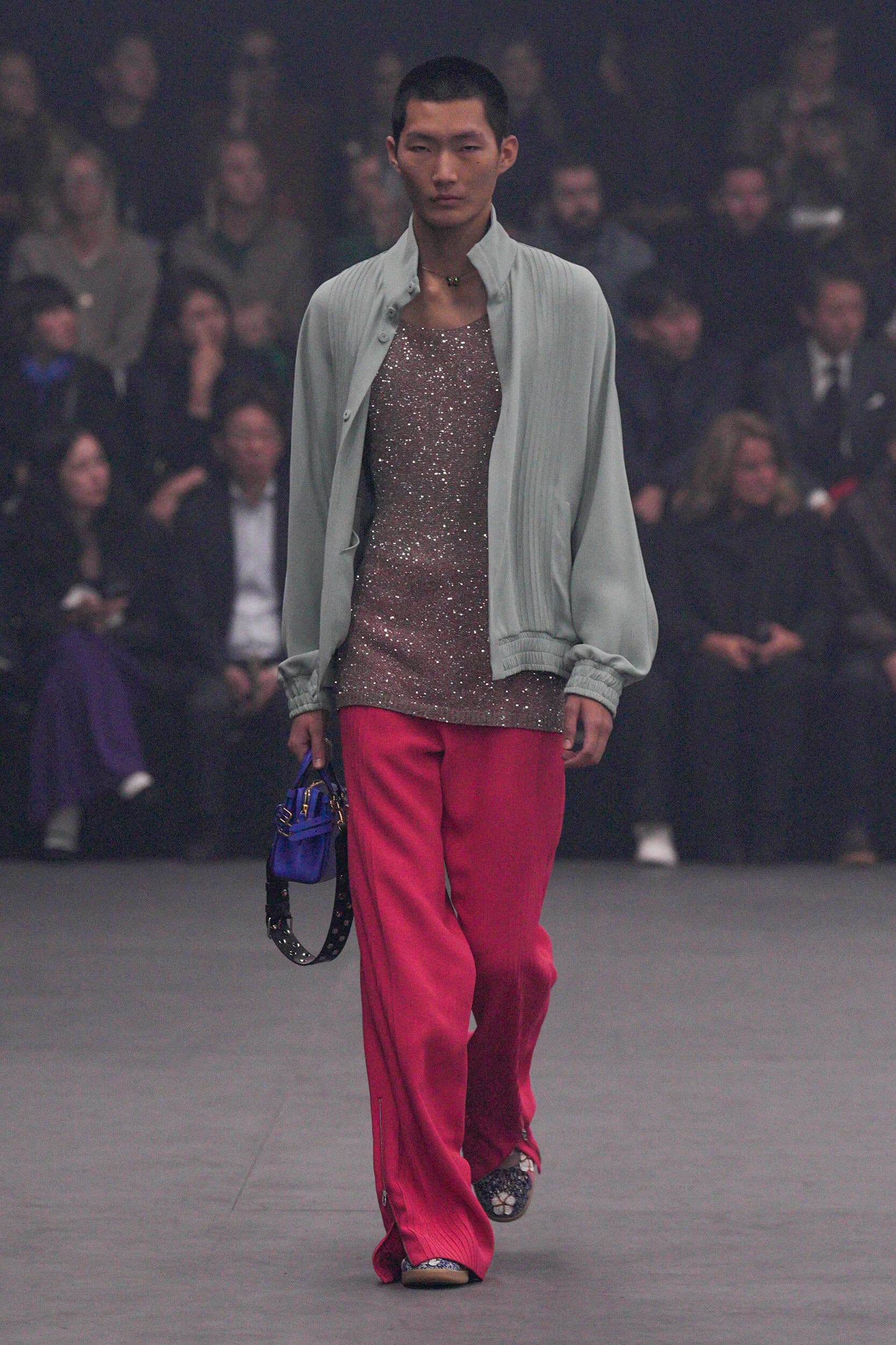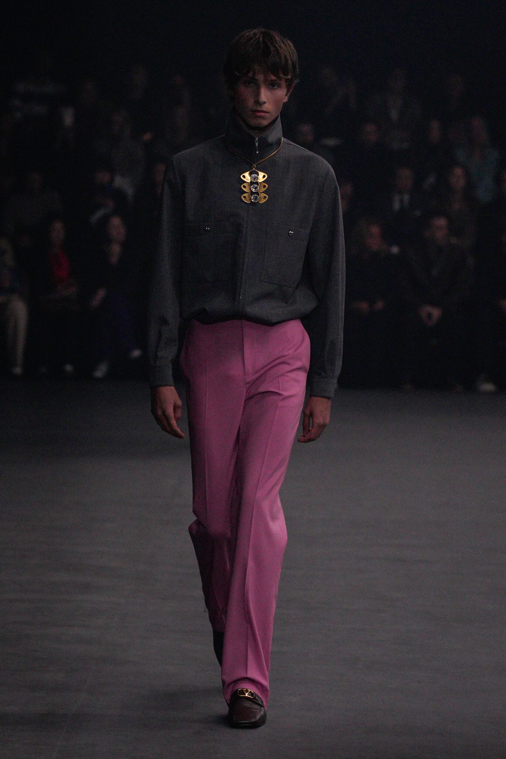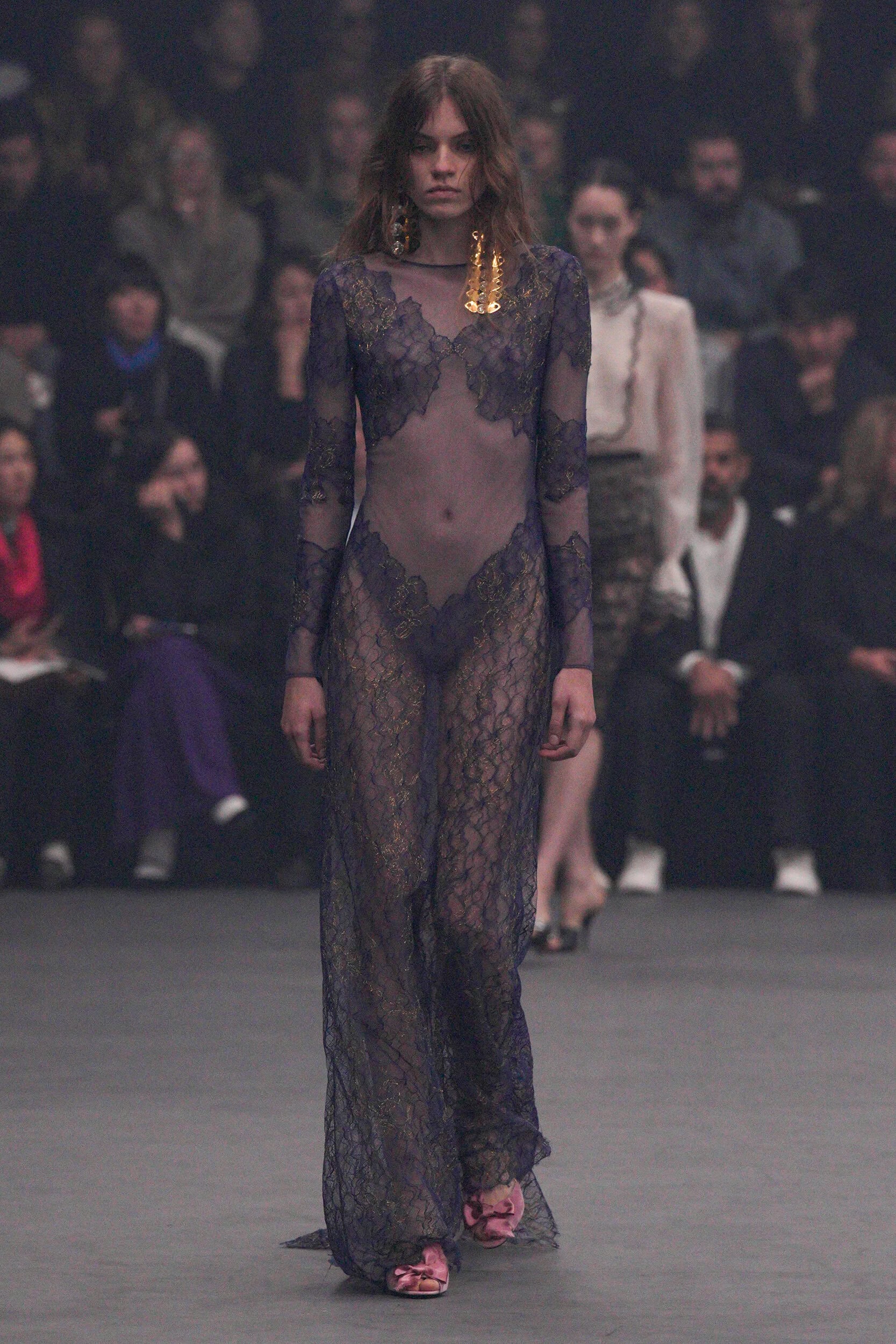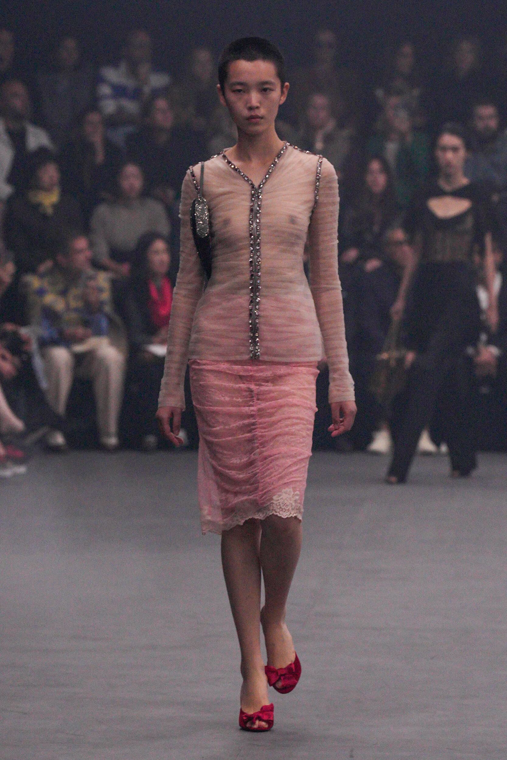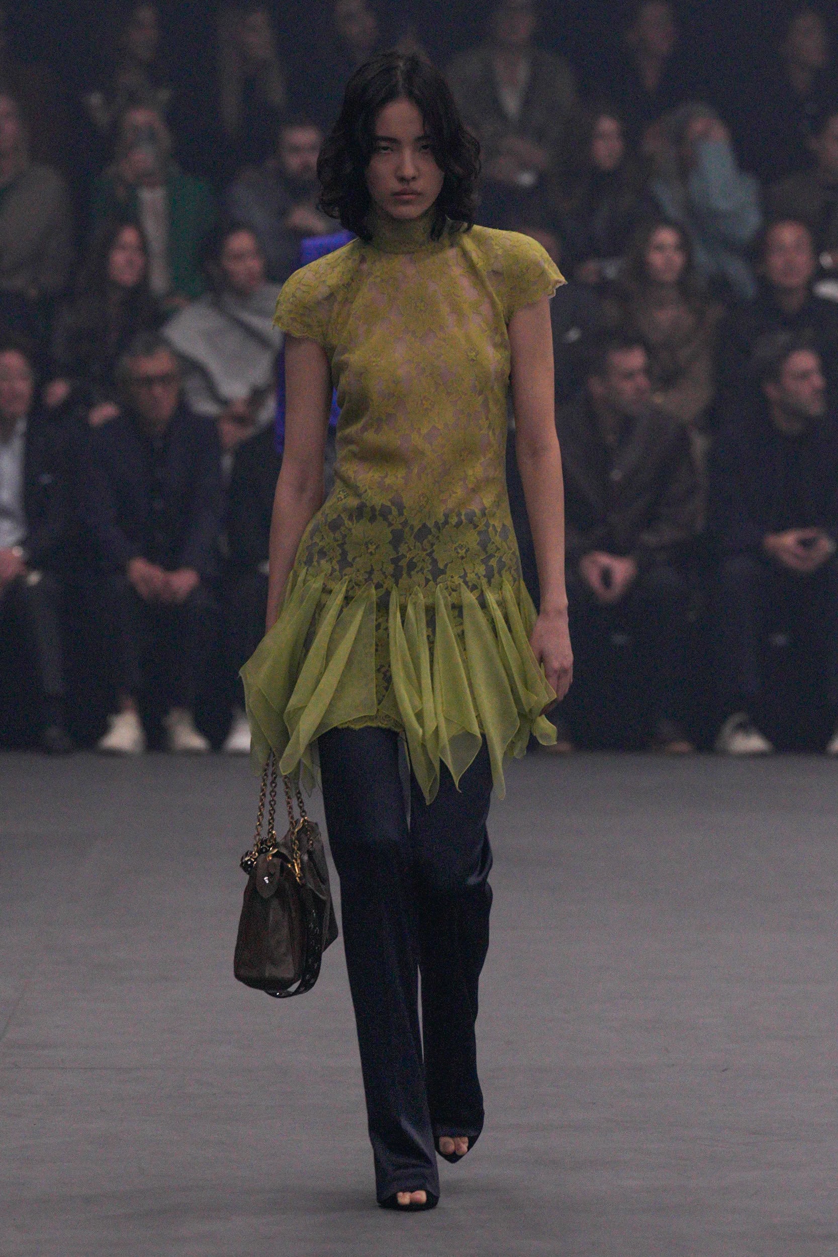 本季剪裁在低调中散发坚定的力量:偏移裁剪的晚礼服在结构化外套下滑动,蕾丝面纱与精致剪裁的西装搭配,复杂的褶皱与僧侣风格的垂坠感交织。Alessandro Michele 在工作坊中找到了共鸣——不再是神圣的,而是诗意的。这一系列似乎在轻声询问,或许时尚的真正奢华就是静心自省。