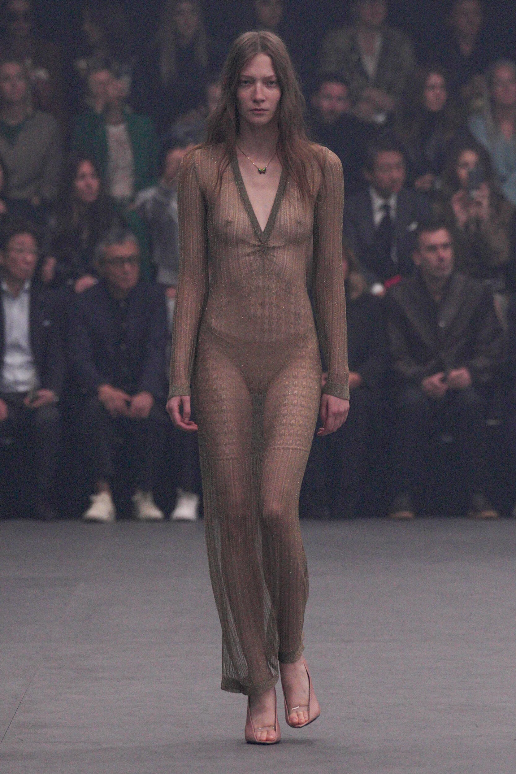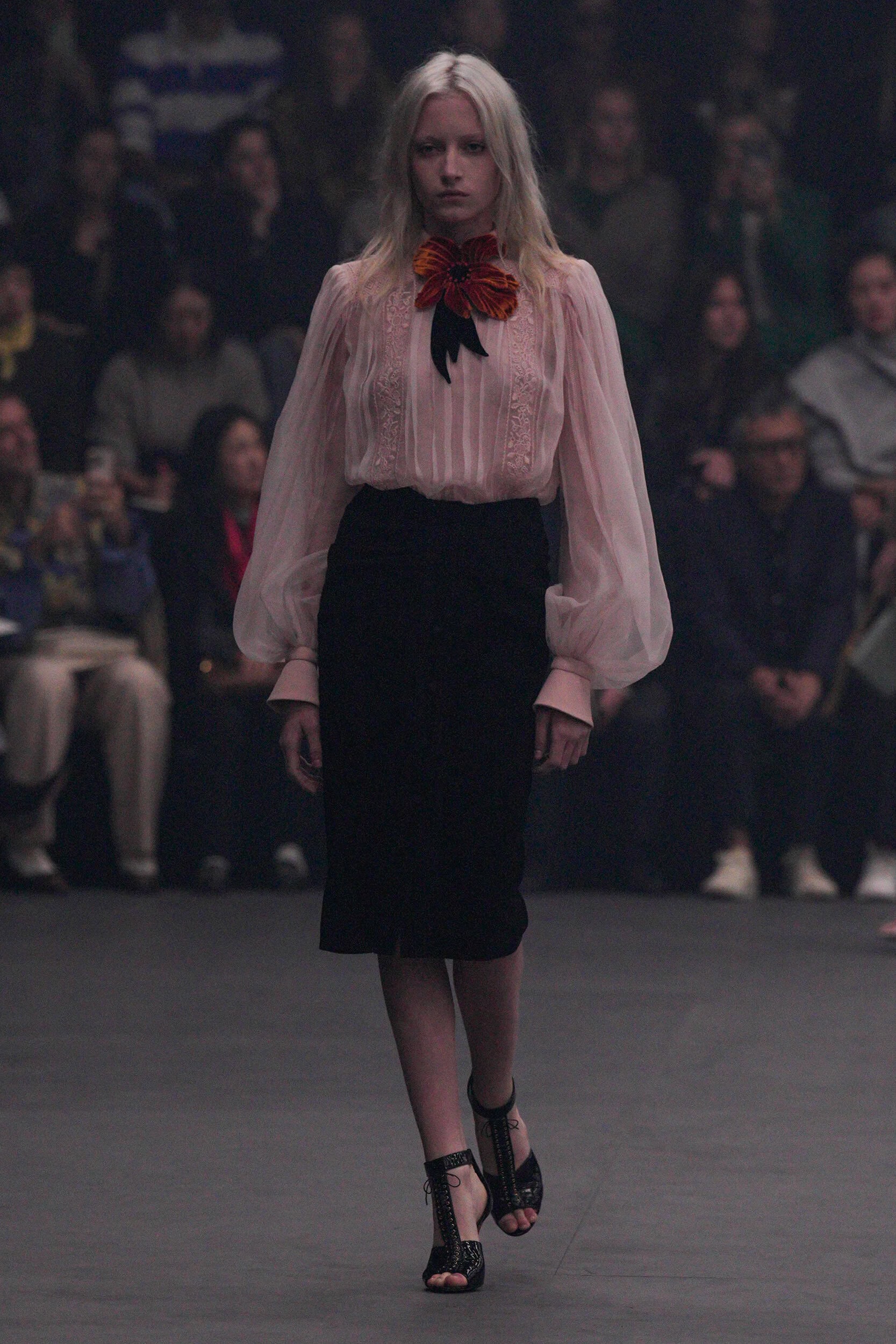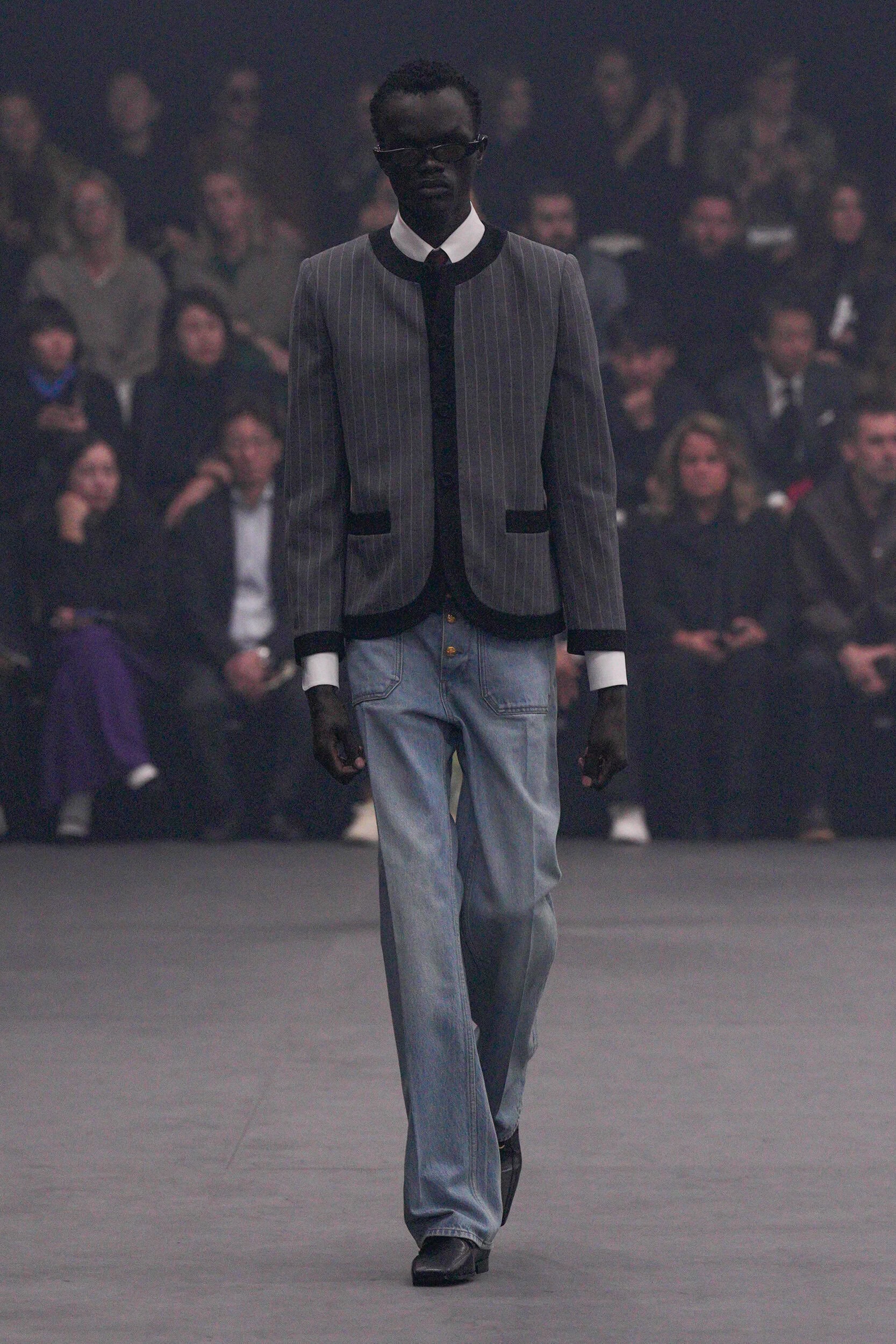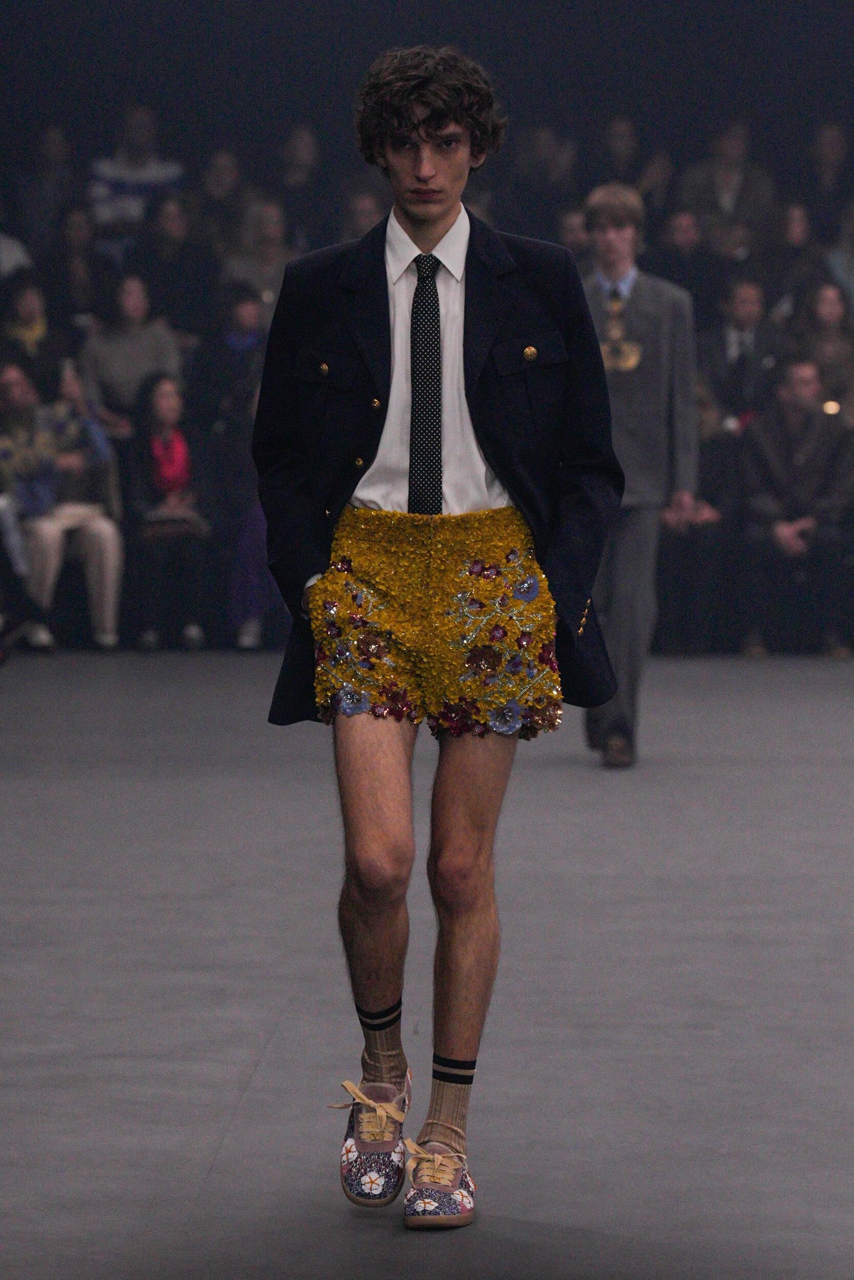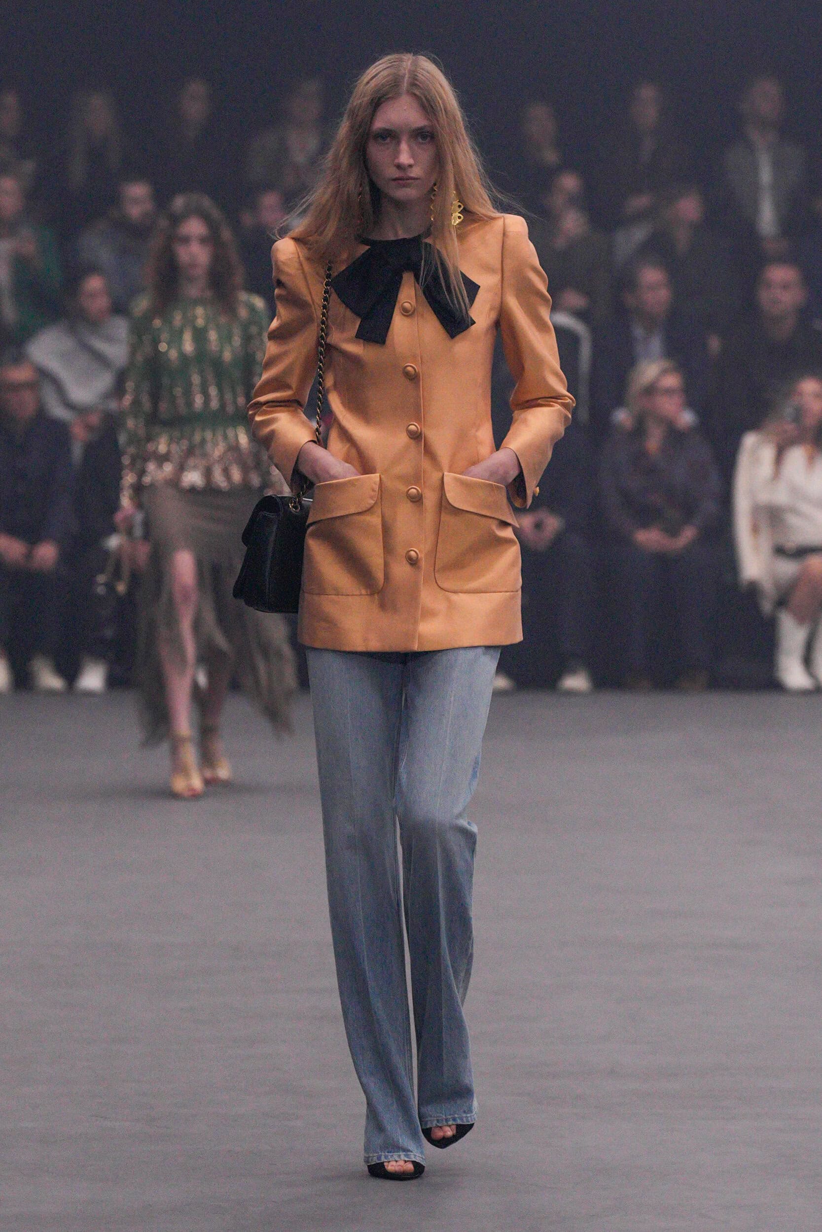 本季剪裁在低调中散发坚定的力量:偏移裁剪的晚礼服在结构化外套下滑动,蕾丝面纱与精致剪裁的西装搭配,复杂的褶皱与僧侣风格的垂坠感交织。Alessandro Michele 在工作坊中找到了共鸣——不再是神圣的,而是诗意的。这一系列似乎在轻声询问,或许时尚的真正奢华就是静心自省。