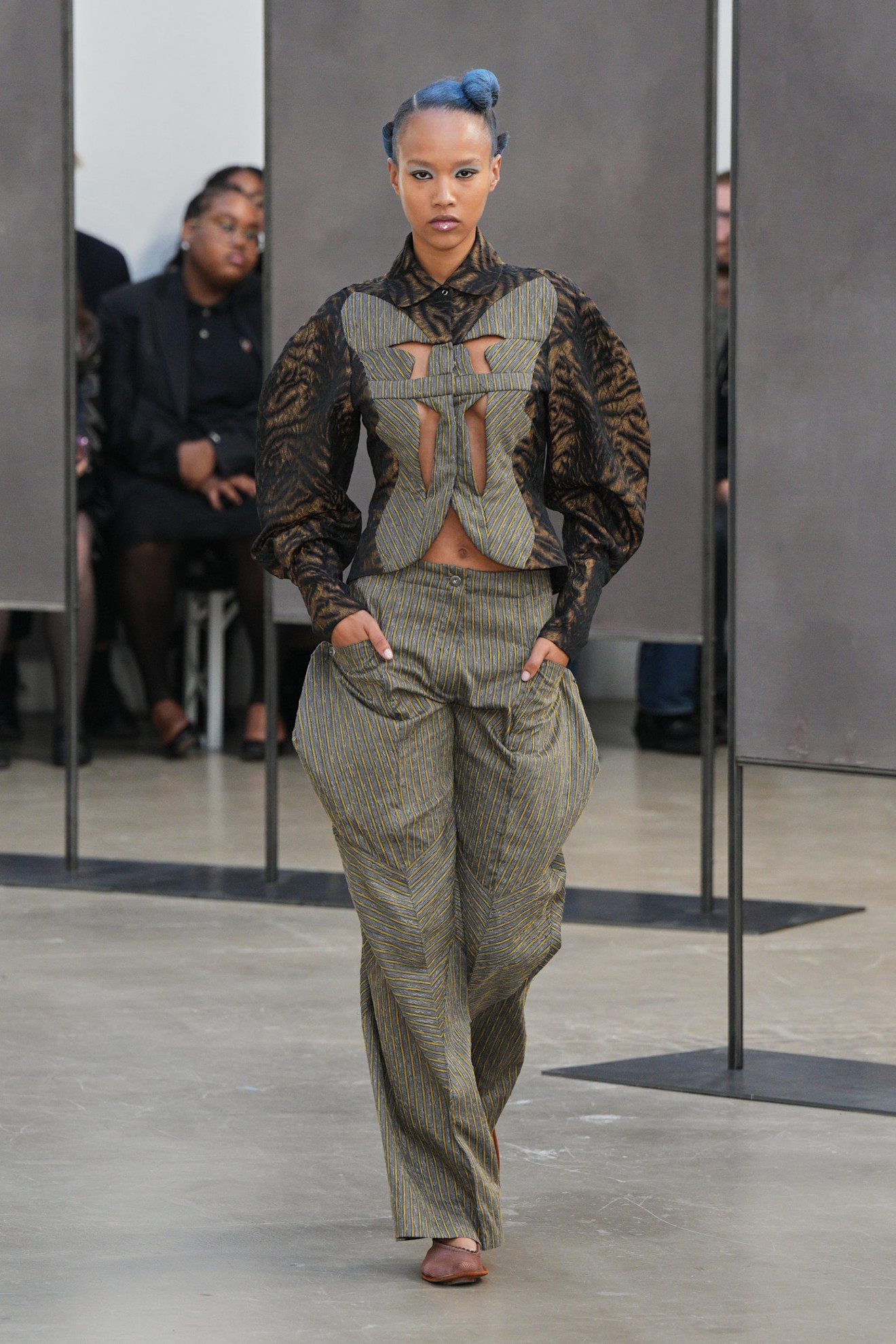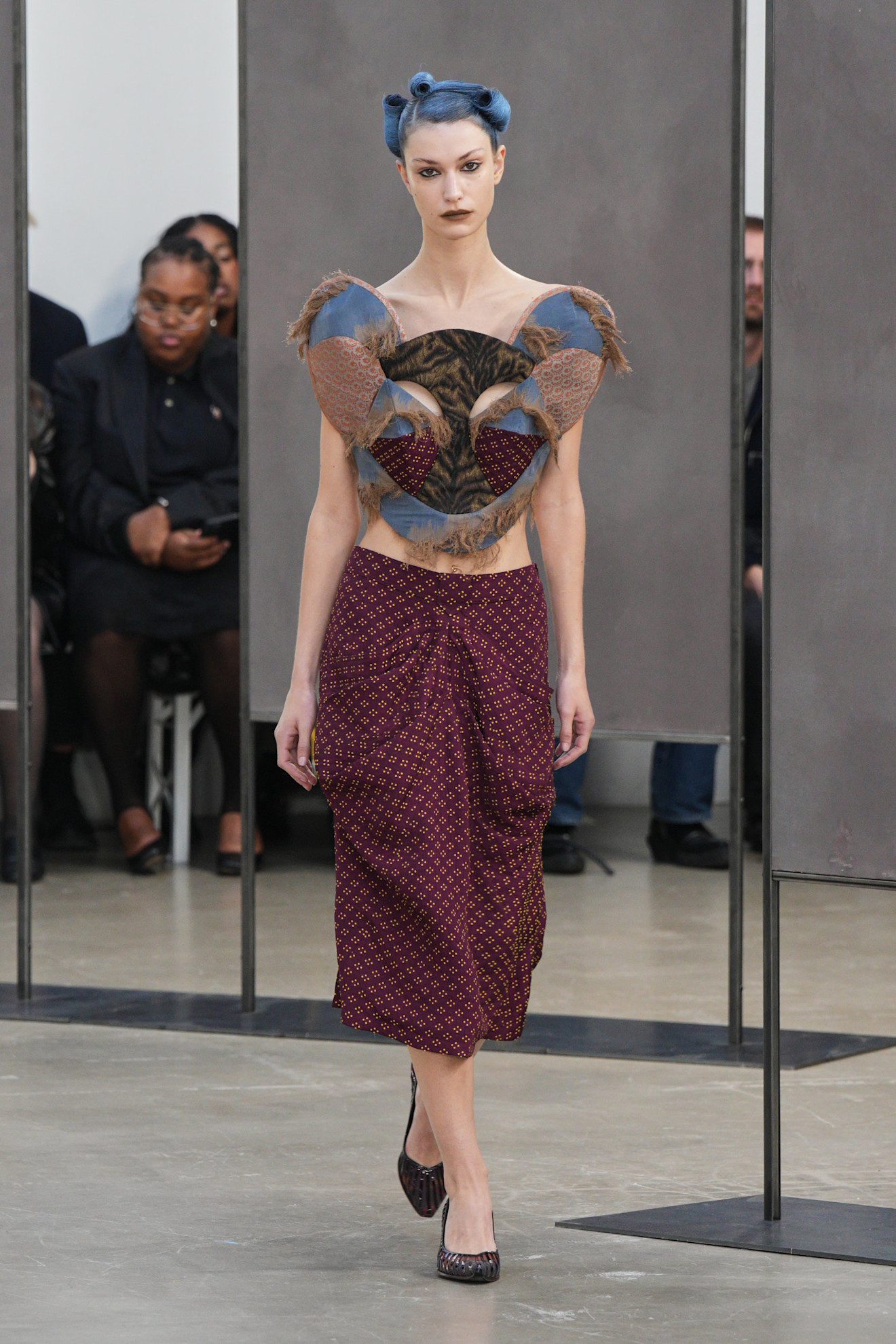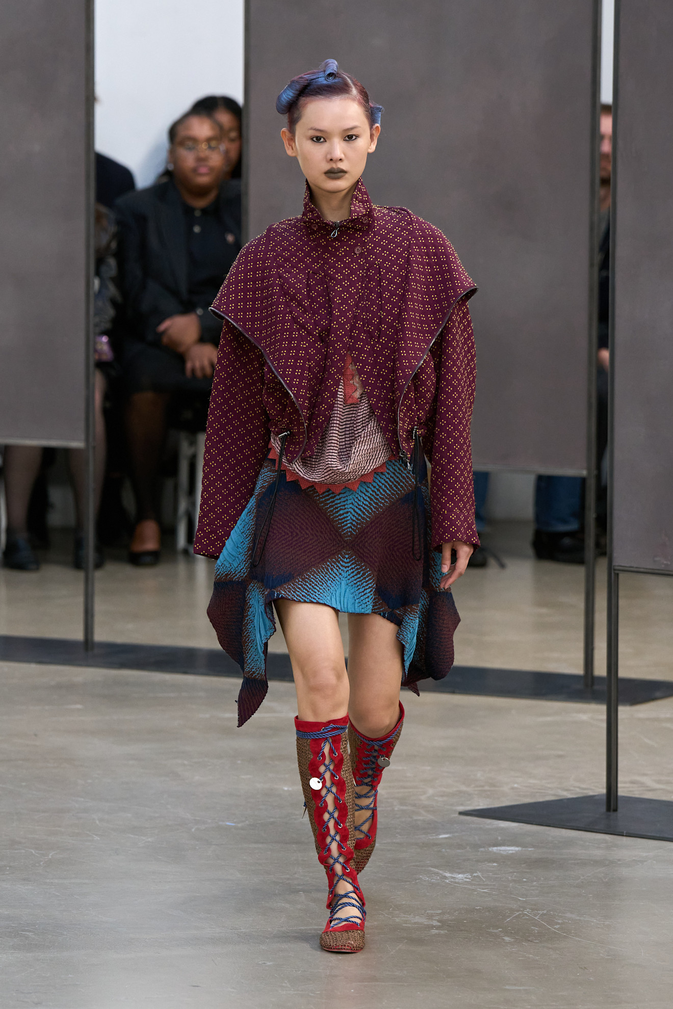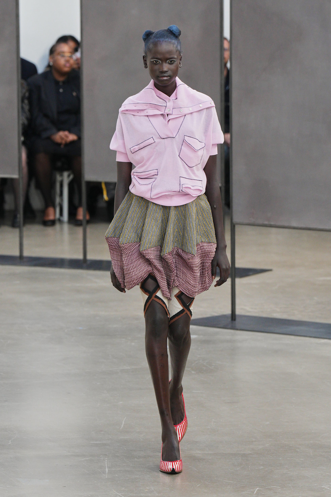 Kiko Kostadinov 2026 春夏系列于巴黎时装周发布,联合创意总监 Laura 与 Deanna Fanning 以女性视角深入探索女性气质,通过标志性的建筑感廓形挑战传统设计语言。本季从画家 Christina Ramberg 描绘女性身体的块状解剖图案与导演 Lina Wertmüller 的 1970 年代电影中汲取灵感。系列呈现如盔甲般的矩形胸衣、未来感裙撑与露出腹部的胸甲,搭配低腰垂坠裙与薄纱针织,在结构性的保护感与柔和肌肤展露间取得平衡。手绘锯齿图案经意大利工坊转化为棉质印花,男装面料厂生产的条纹与提花材质赋予女装锋利轮廓。披肩领套装、落肩夹克与超大贴袋注入复古色彩,呼应 Wertmüller 镜头下女性充满可能性的时代。Fanning 姐妹以此强调「女性应自我定义 femininity」,在沙漏曲线与个性表达之间实现对话。为延续品牌理念,Kiko Kostadinov 首家欧洲 boutique 将于 11 月中旬于伦敦开幕。