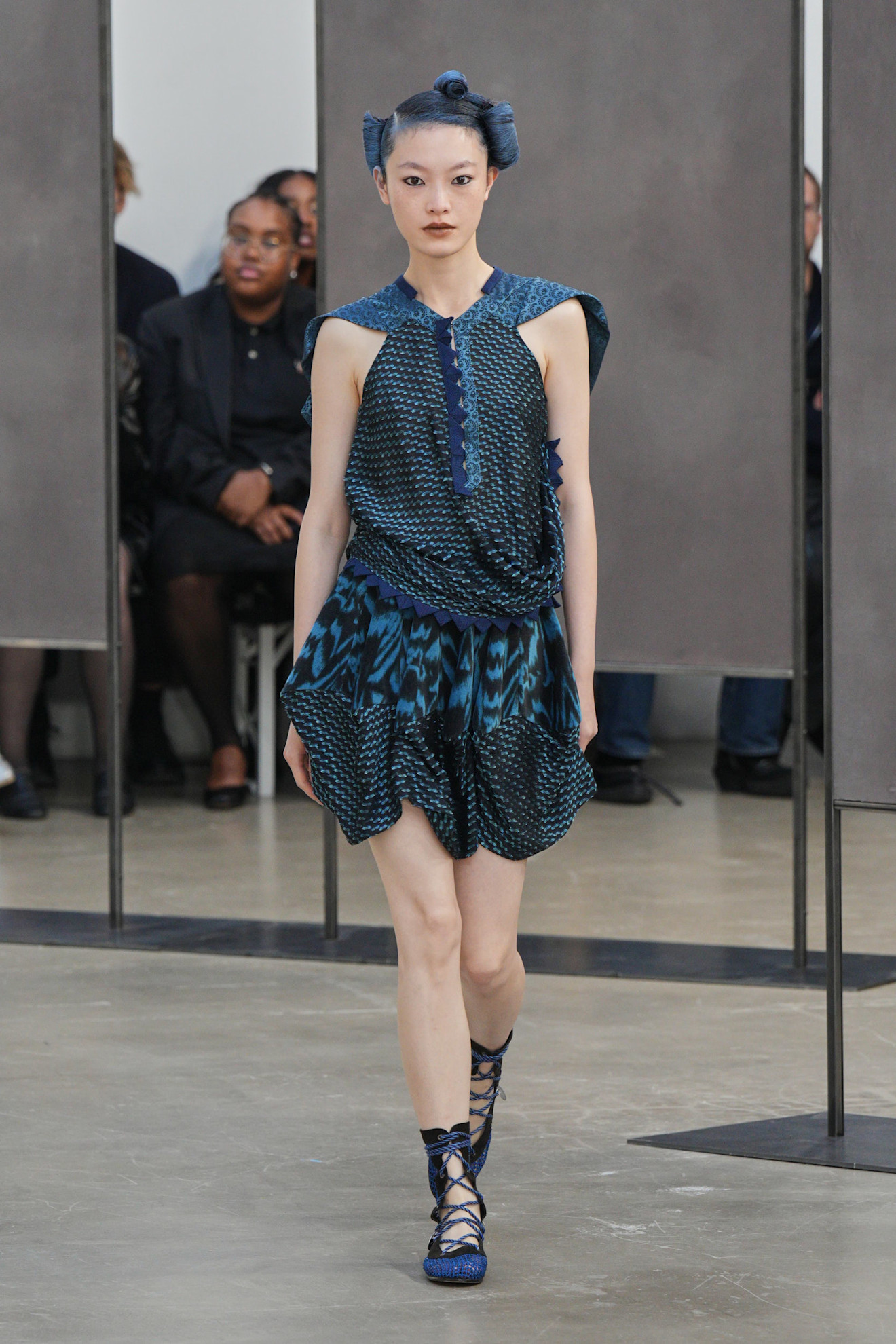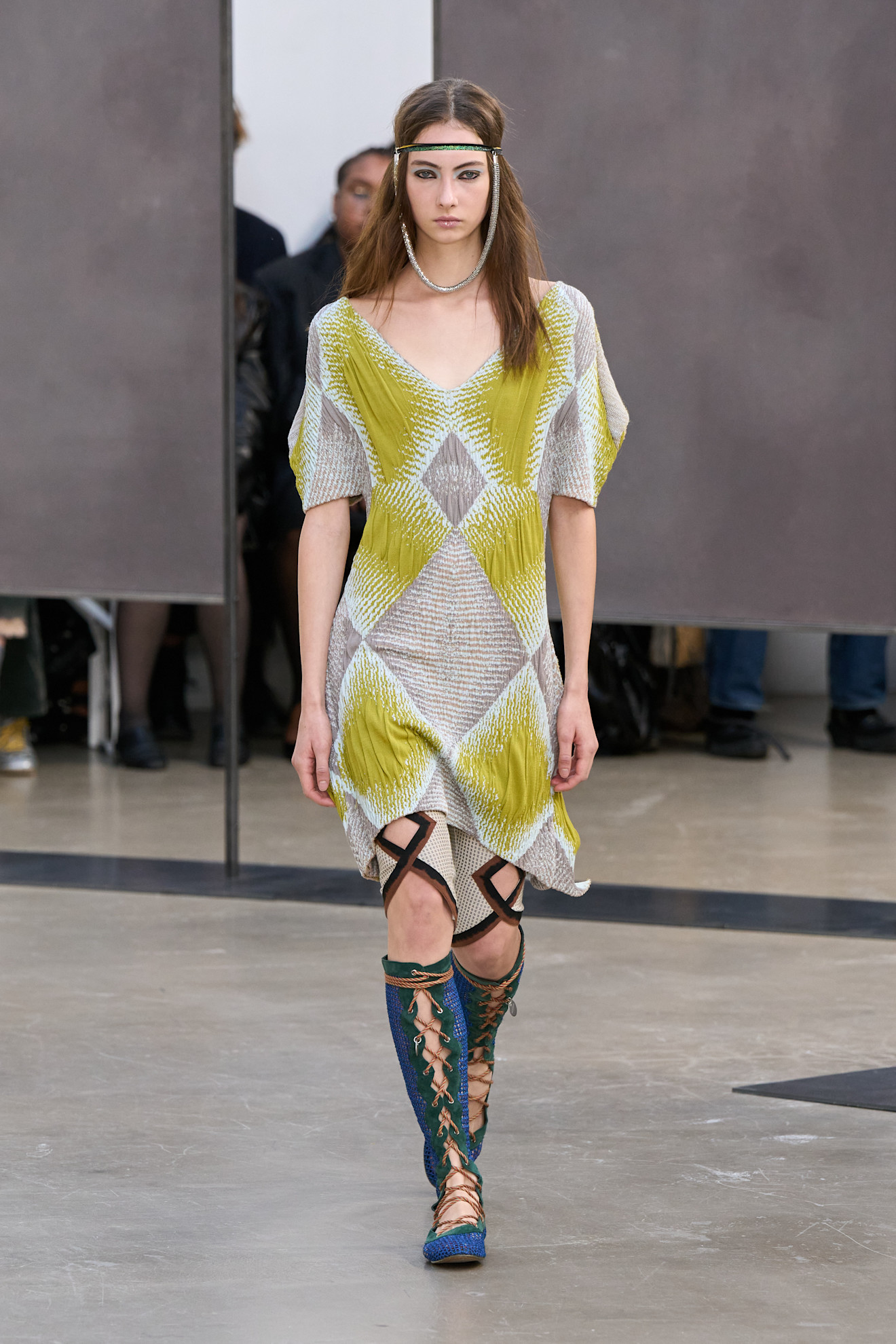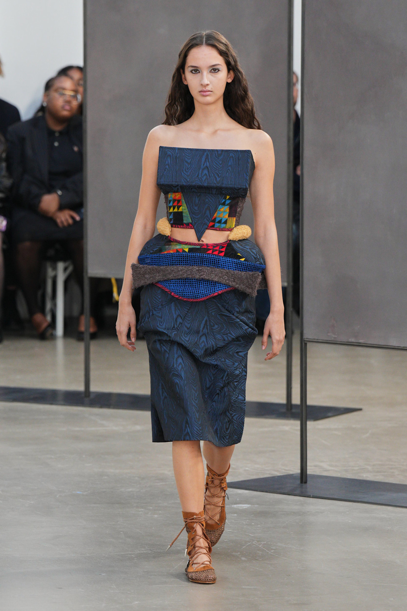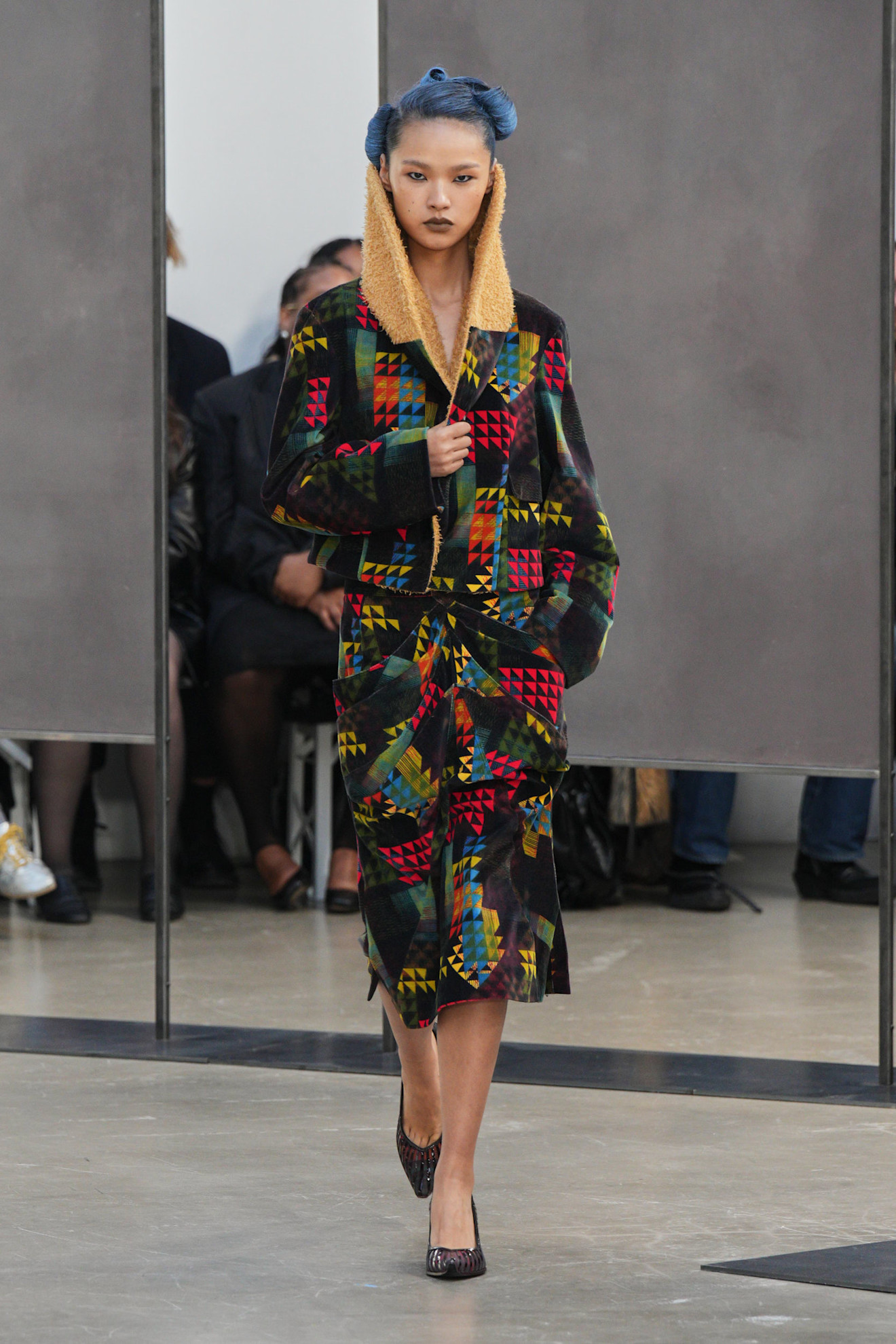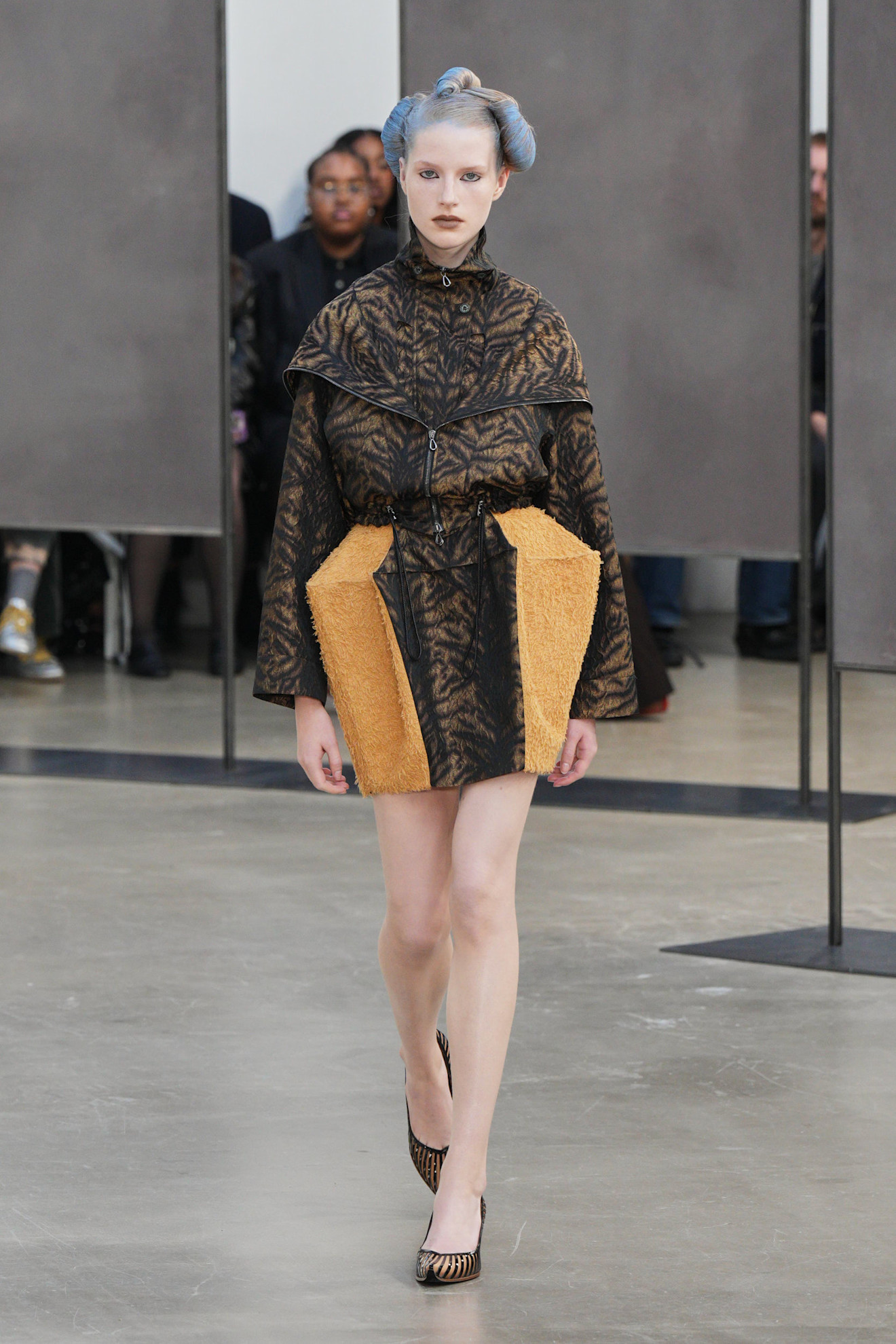 Kiko Kostadinov 2026 春夏系列于巴黎时装周发布,联合创意总监 Laura 与 Deanna Fanning 以女性视角深入探索女性气质,通过标志性的建筑感廓形挑战传统设计语言。本季从画家 Christina Ramberg 描绘女性身体的块状解剖图案与导演 Lina Wertmüller 的 1970 年代电影中汲取灵感。系列呈现如盔甲般的矩形胸衣、未来感裙撑与露出腹部的胸甲,搭配低腰垂坠裙与薄纱针织,在结构性的保护感与柔和肌肤展露间取得平衡。手绘锯齿图案经意大利工坊转化为棉质印花,男装面料厂生产的条纹与提花材质赋予女装锋利轮廓。披肩领套装、落肩夹克与超大贴袋注入复古色彩,呼应 Wertmüller 镜头下女性充满可能性的时代。Fanning 姐妹以此强调「女性应自我定义 femininity」,在沙漏曲线与个性表达之间实现对话。为延续品牌理念,Kiko Kostadinov 首家欧洲 boutique 将于 11 月中旬于伦敦开幕。