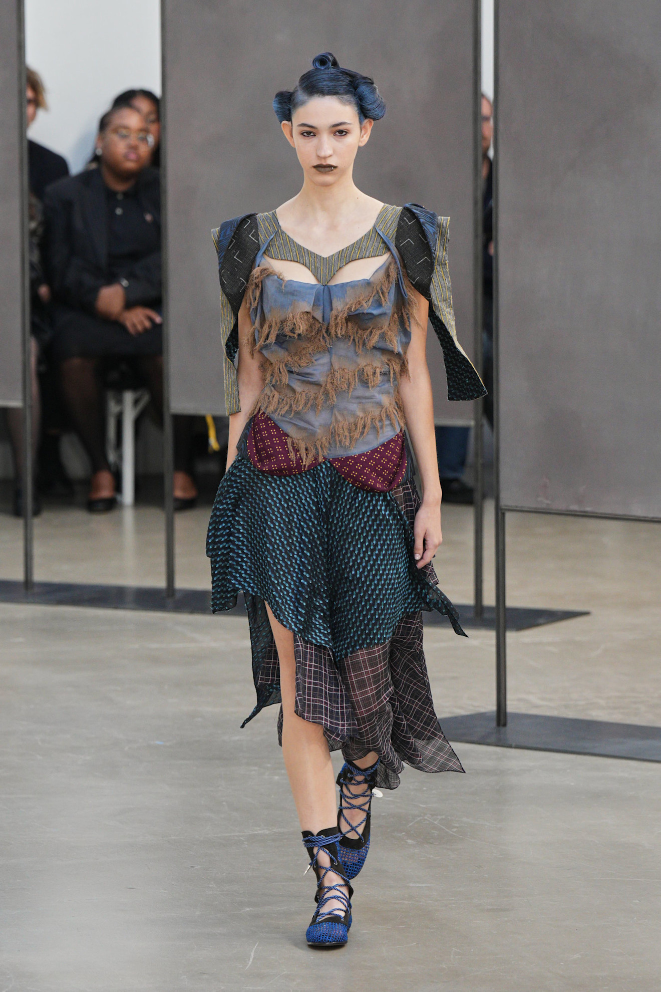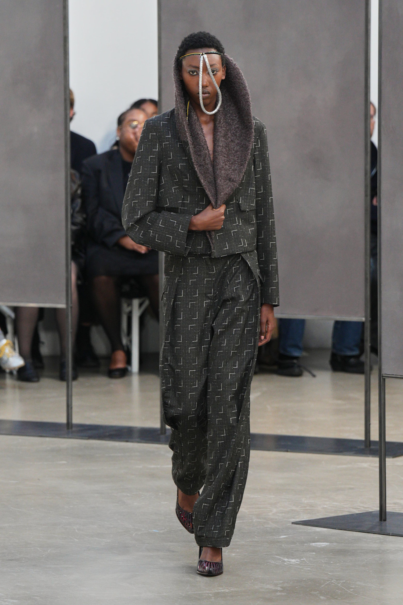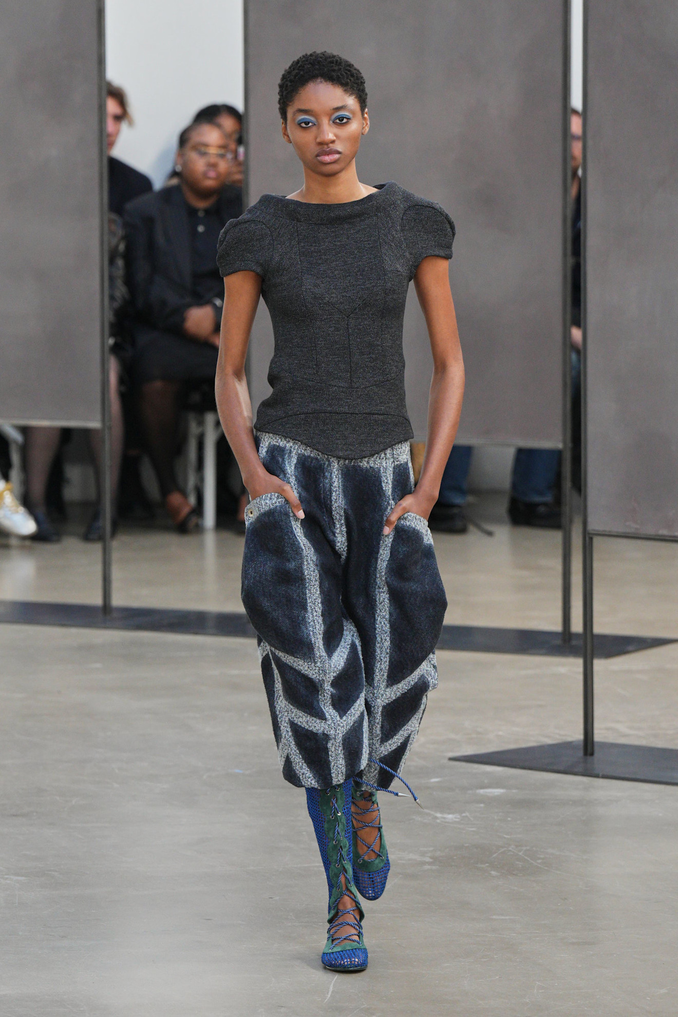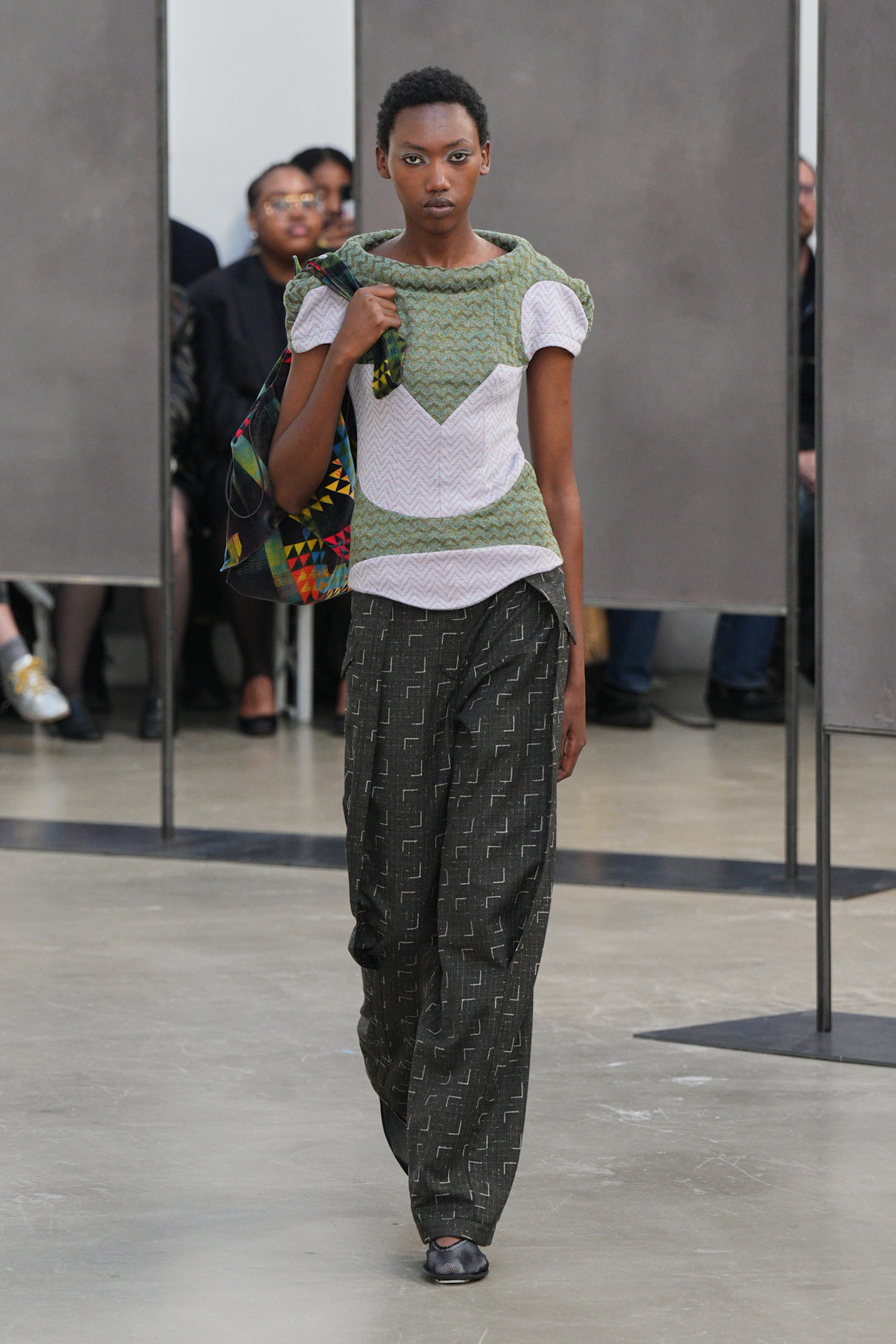 Kiko Kostadinov 2026 春夏系列于巴黎时装周发布,联合创意总监 Laura 与 Deanna Fanning 以女性视角深入探索女性气质,通过标志性的建筑感廓形挑战传统设计语言。本季从画家 Christina Ramberg 描绘女性身体的块状解剖图案与导演 Lina Wertmüller 的 1970 年代电影中汲取灵感。系列呈现如盔甲般的矩形胸衣、未来感裙撑与露出腹部的胸甲,搭配低腰垂坠裙与薄纱针织,在结构性的保护感与柔和肌肤展露间取得平衡。手绘锯齿图案经意大利工坊转化为棉质印花,男装面料厂生产的条纹与提花材质赋予女装锋利轮廓。披肩领套装、落肩夹克与超大贴袋注入复古色彩,呼应 Wertmüller 镜头下女性充满可能性的时代。Fanning 姐妹以此强调「女性应自我定义 femininity」,在沙漏曲线与个性表达之间实现对话。为延续品牌理念,Kiko Kostadinov 首家欧洲 boutique 将于 11 月中旬于伦敦开幕。