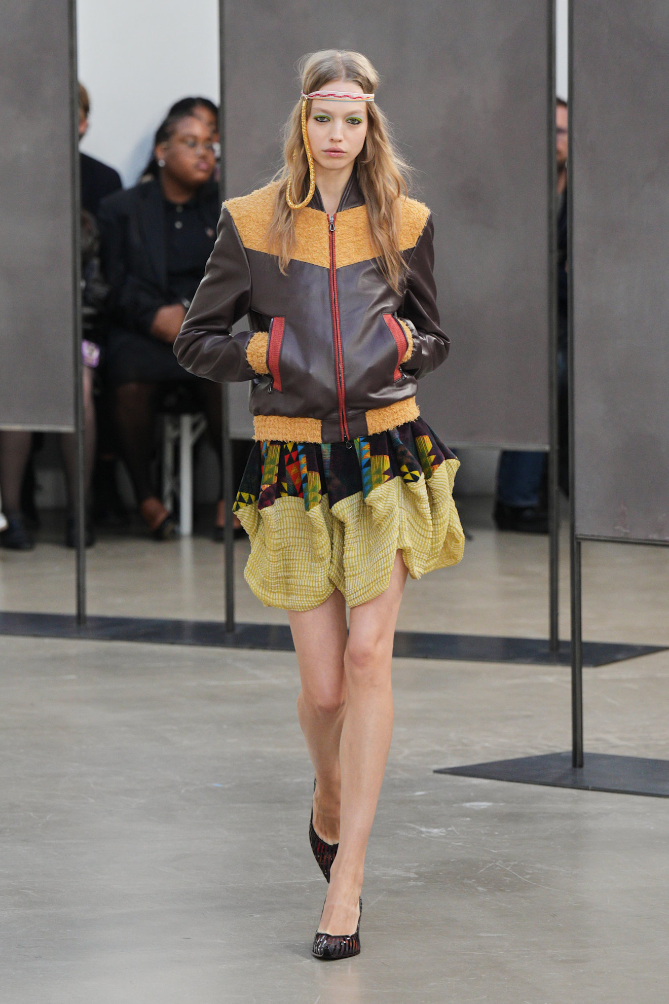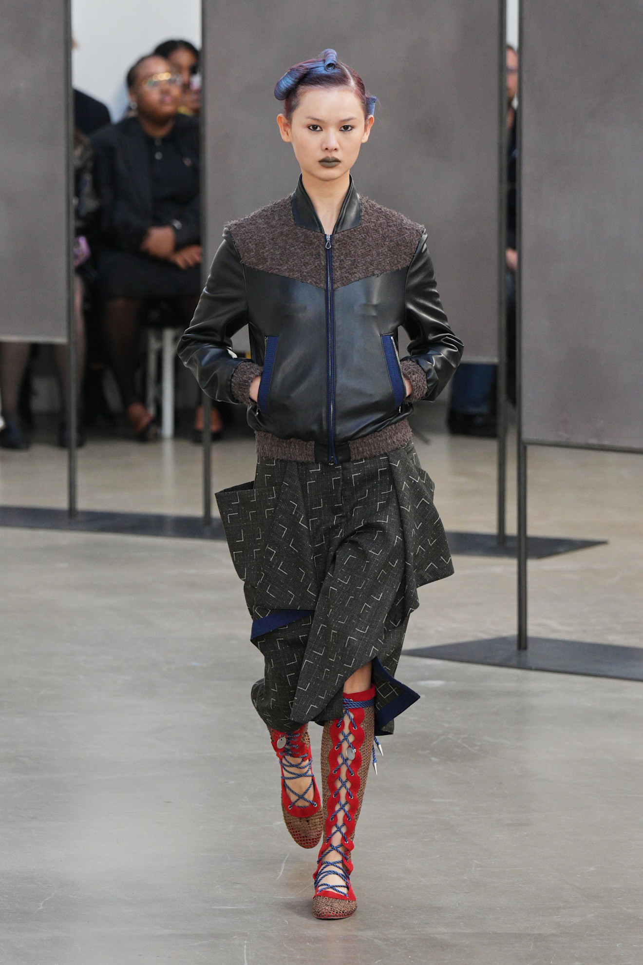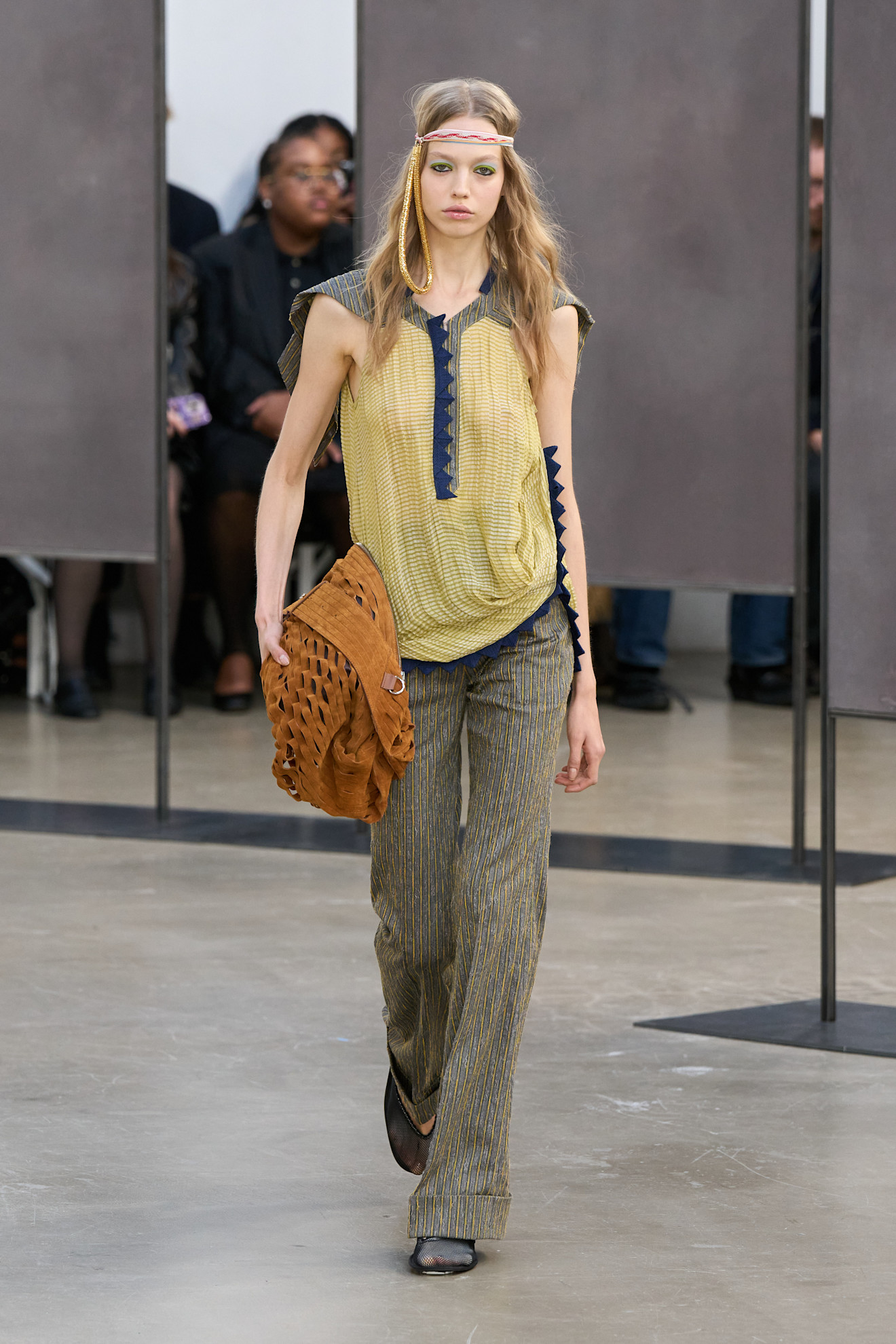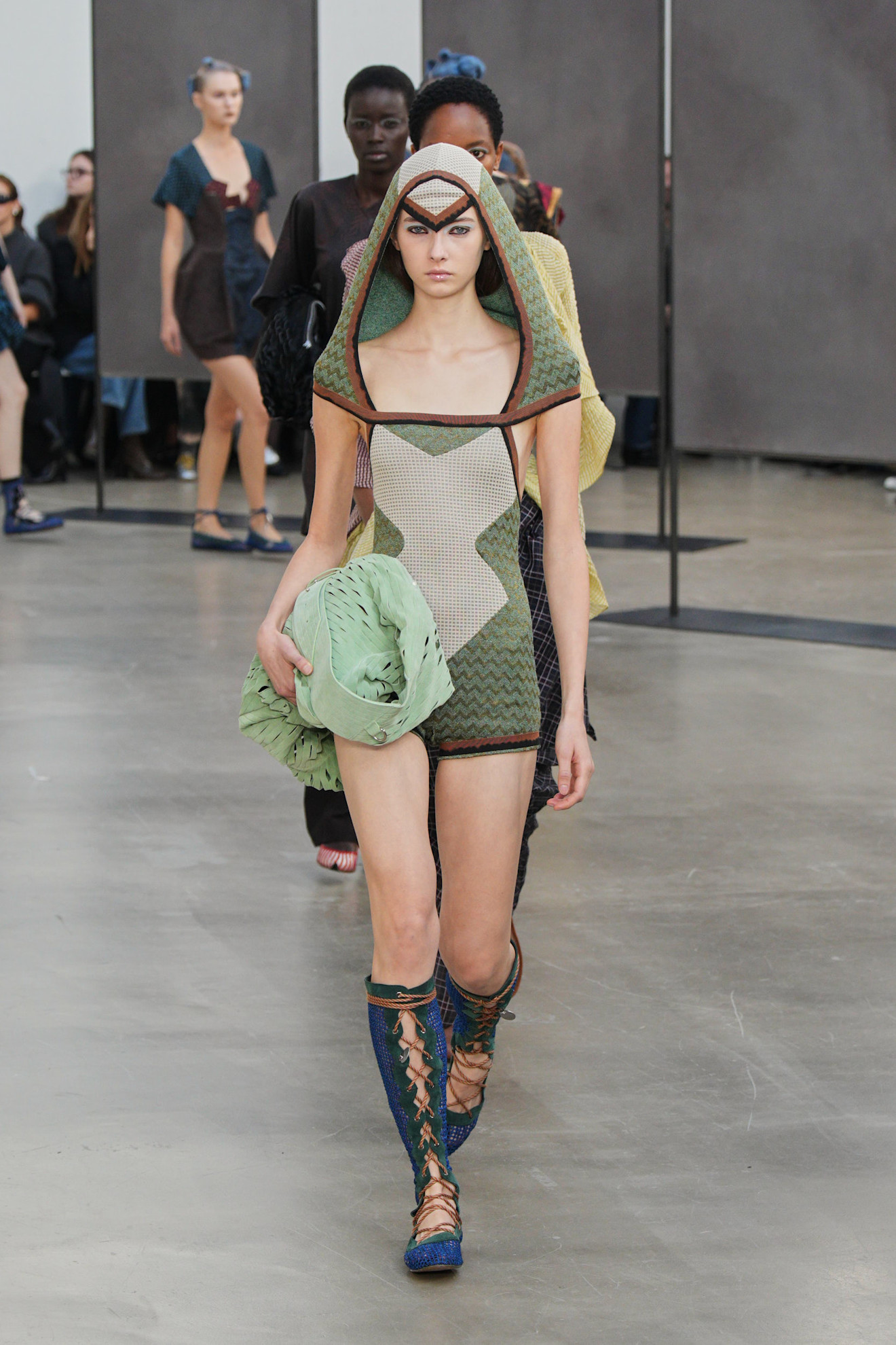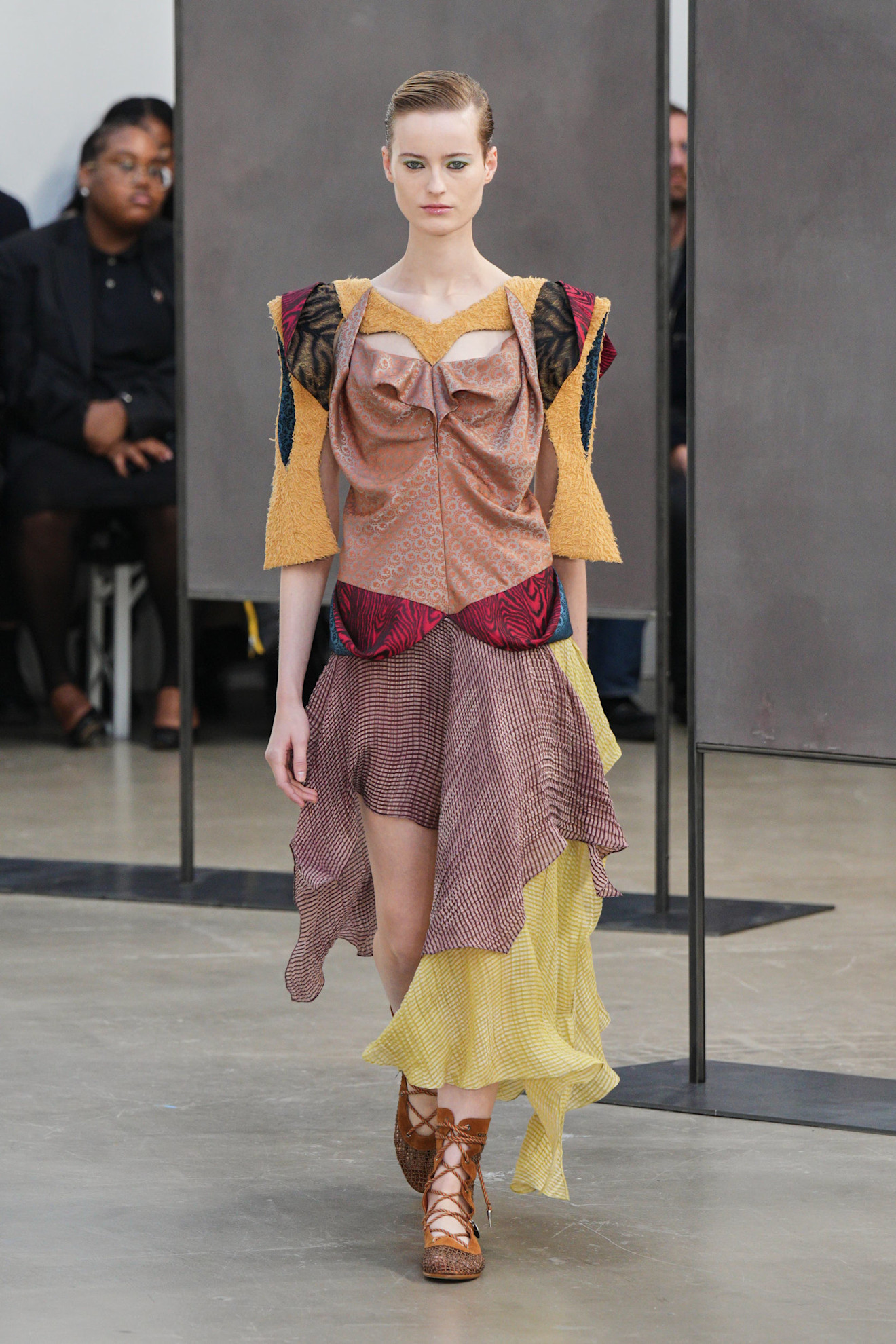 Kiko Kostadinov 2026 春夏系列于巴黎时装周发布,联合创意总监 Laura 与 Deanna Fanning 以女性视角深入探索女性气质,通过标志性的建筑感廓形挑战传统设计语言。本季从画家 Christina Ramberg 描绘女性身体的块状解剖图案与导演 Lina Wertmüller 的 1970 年代电影中汲取灵感。系列呈现如盔甲般的矩形胸衣、未来感裙撑与露出腹部的胸甲,搭配低腰垂坠裙与薄纱针织,在结构性的保护感与柔和肌肤展露间取得平衡。手绘锯齿图案经意大利工坊转化为棉质印花,男装面料厂生产的条纹与提花材质赋予女装锋利轮廓。披肩领套装、落肩夹克与超大贴袋注入复古色彩,呼应 Wertmüller 镜头下女性充满可能性的时代。Fanning 姐妹以此强调「女性应自我定义 femininity」,在沙漏曲线与个性表达之间实现对话。为延续品牌理念,Kiko Kostadinov 首家欧洲 boutique 将于 11 月中旬于伦敦开幕。