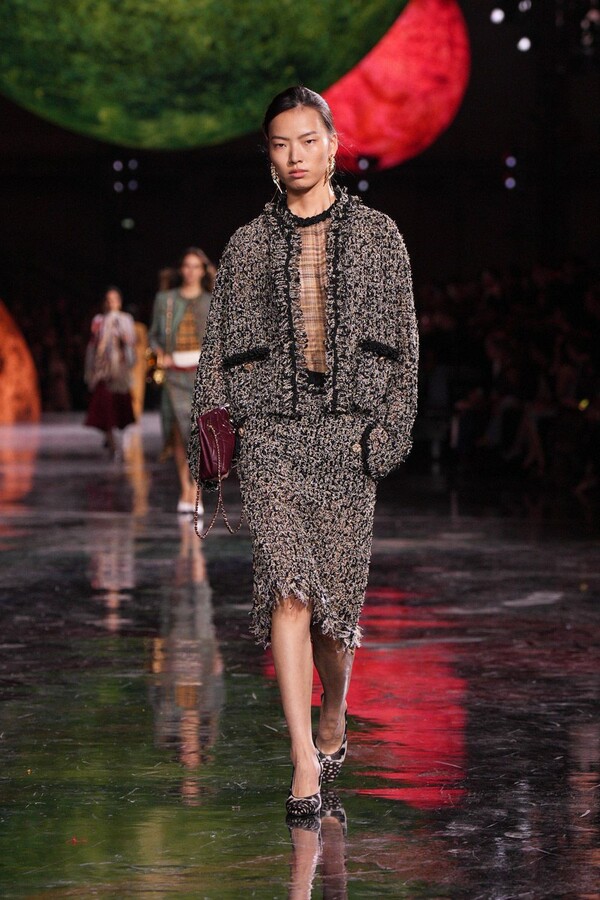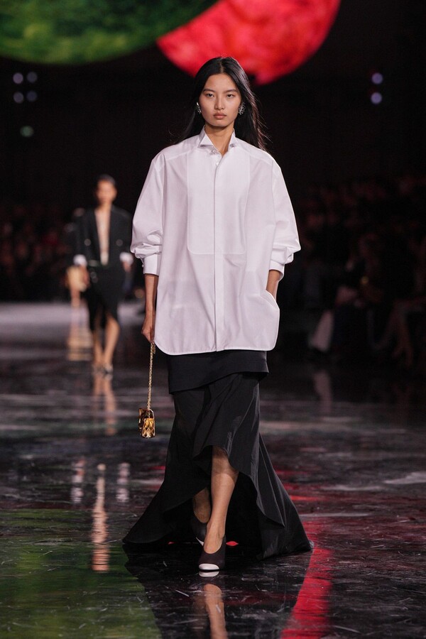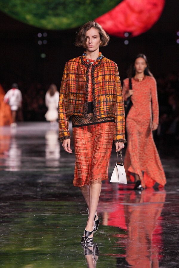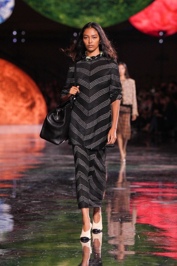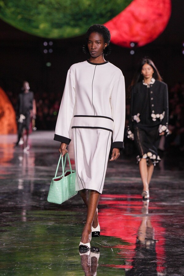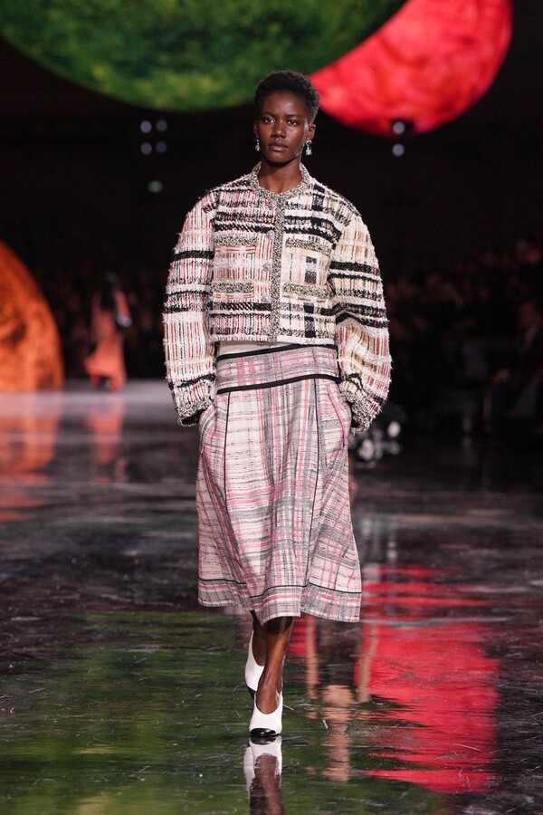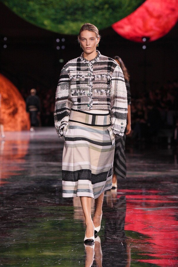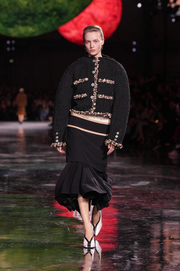 Matthieu Blazy 的设计手法现代、精准、且毫不费力地保持了平衡。他手下的 CHANEL 更少关注视觉盛宴,而是更注重动感、舒适和触感。他重新审视了 Coco chanel 早期的叛逆姿态——对男装的挪用、对针织的热爱、对刻板的拒绝,并将其转化为一种既扎实又鲜活的语言。开场的九分裤装自信而剪裁清晰,灵感源自 Matthieu Blazy 自身的剪裁实验,而与 Charvet 合作开发的利落纽扣衬衫在下摆饰有精致的链条——致敬了品牌的隐秘工艺。