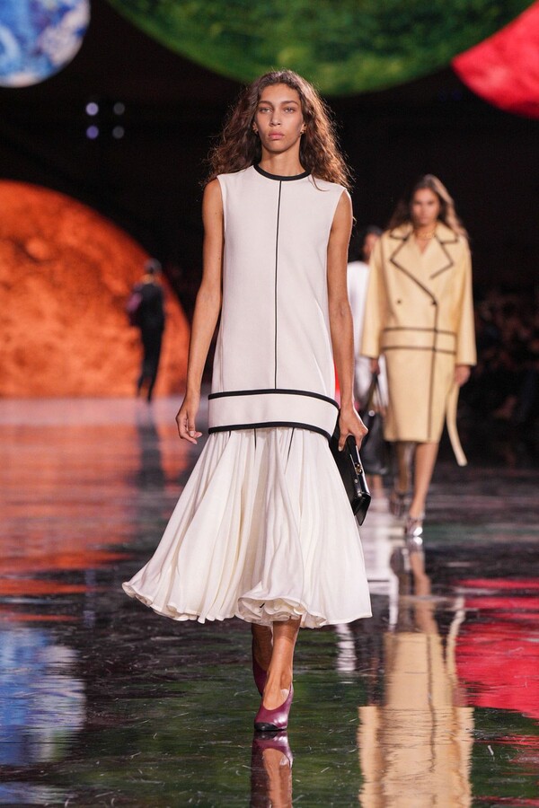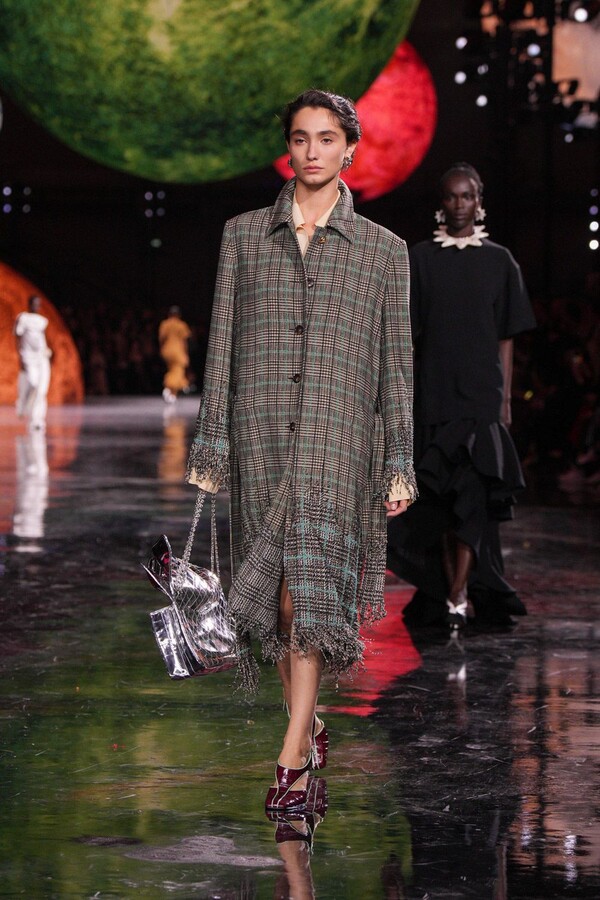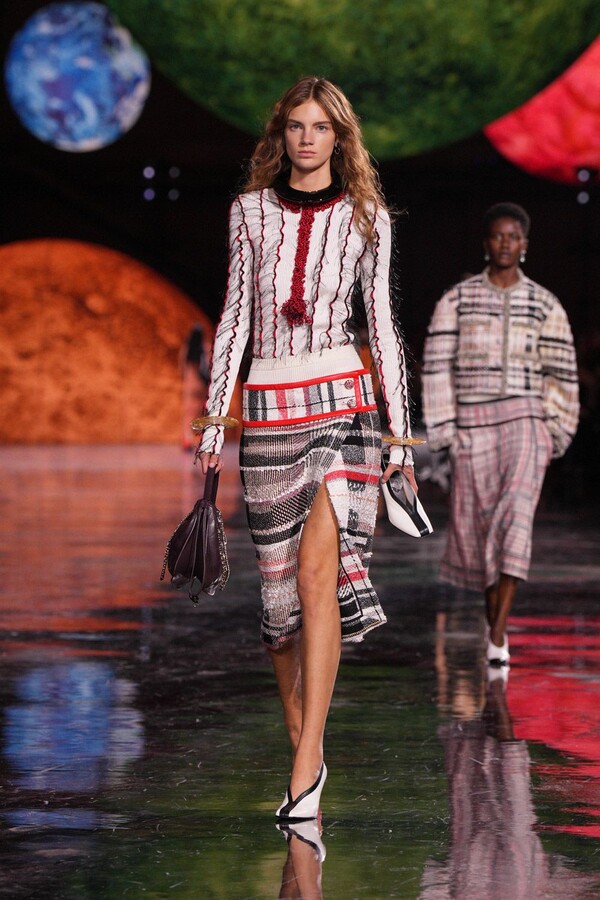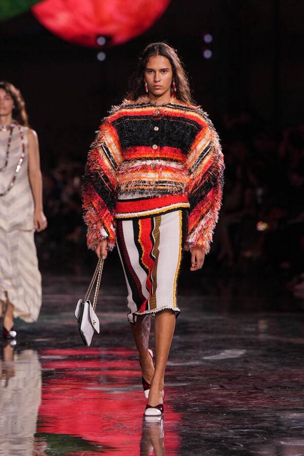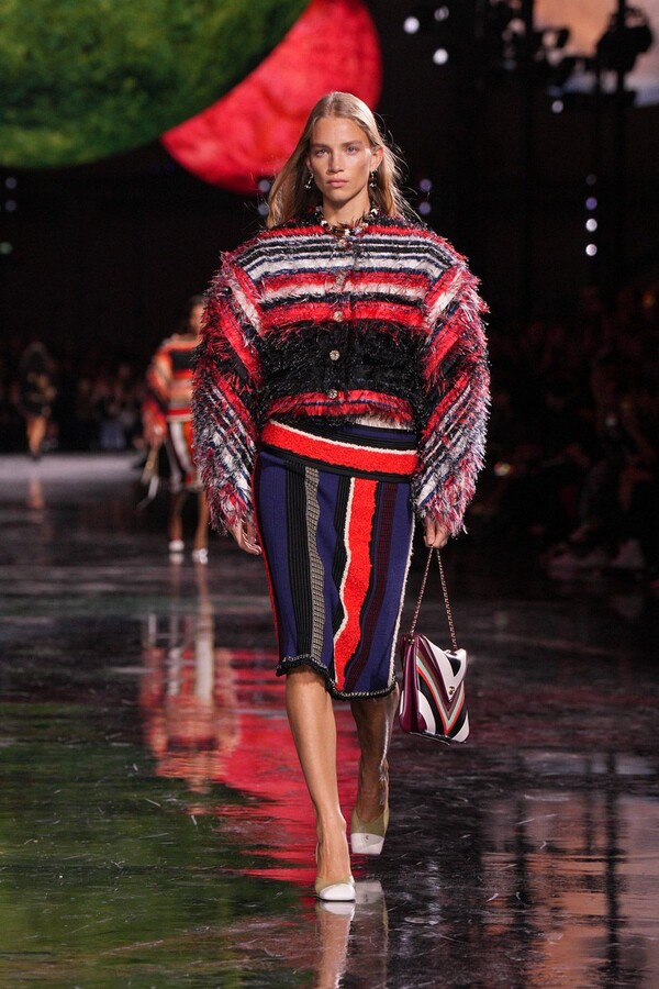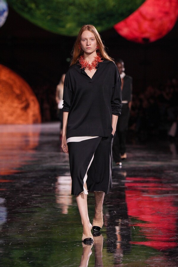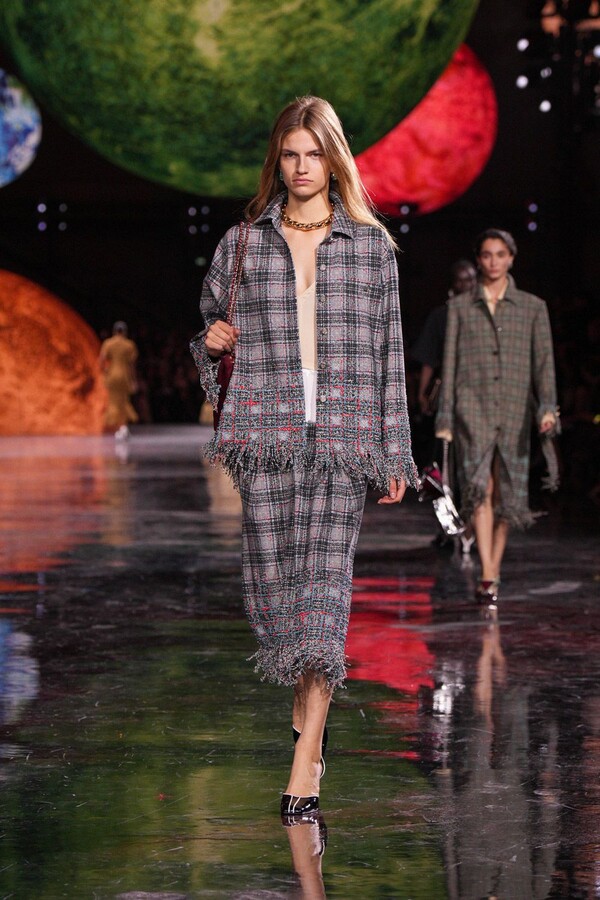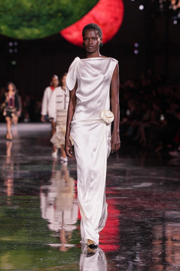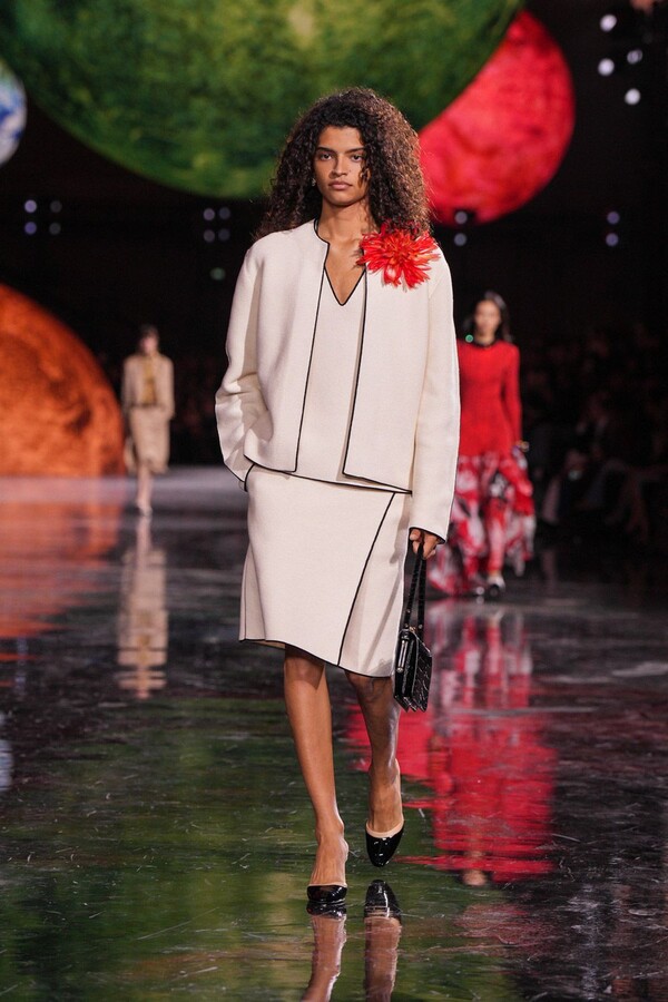 Matthieu Blazy 的设计手法现代、精准、且毫不费力地保持了平衡。他手下的 CHANEL 更少关注视觉盛宴,而是更注重动感、舒适和触感。他重新审视了 Coco chanel 早期的叛逆姿态——对男装的挪用、对针织的热爱、对刻板的拒绝,并将其转化为一种既扎实又鲜活的语言。开场的九分裤装自信而剪裁清晰,灵感源自 Matthieu Blazy 自身的剪裁实验,而与 Charvet 合作开发的利落纽扣衬衫在下摆饰有精致的链条——致敬了品牌的隐秘工艺。