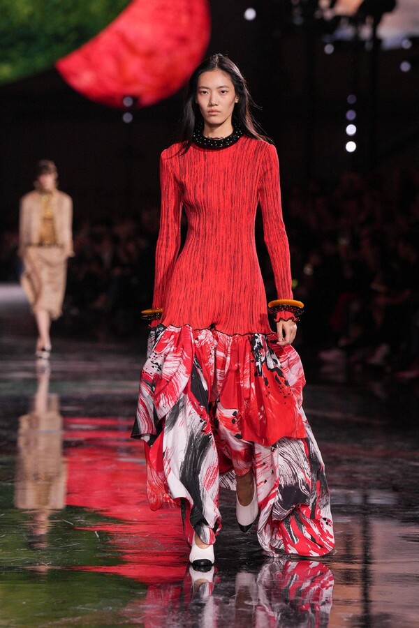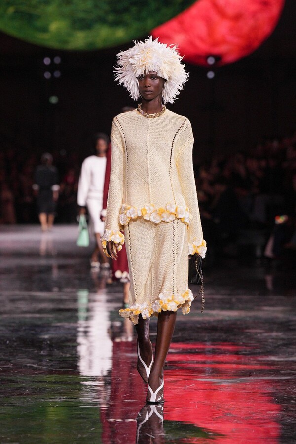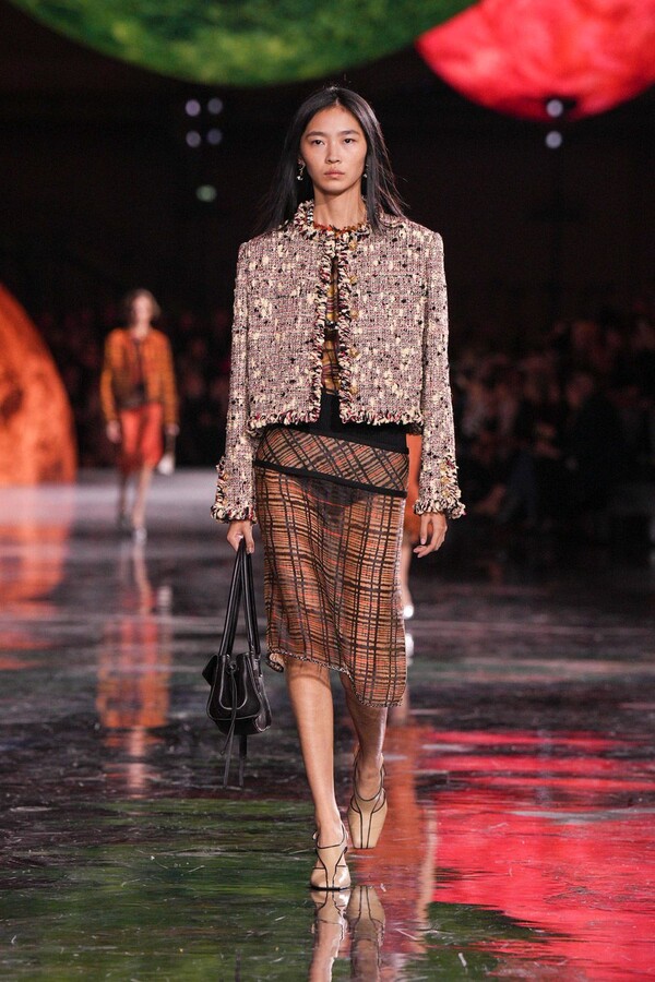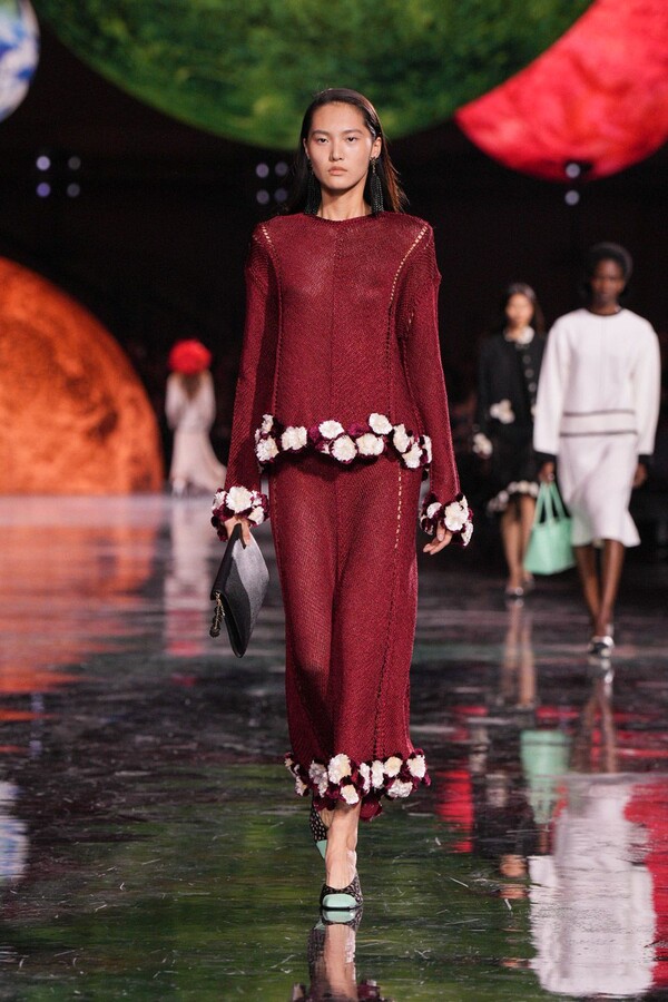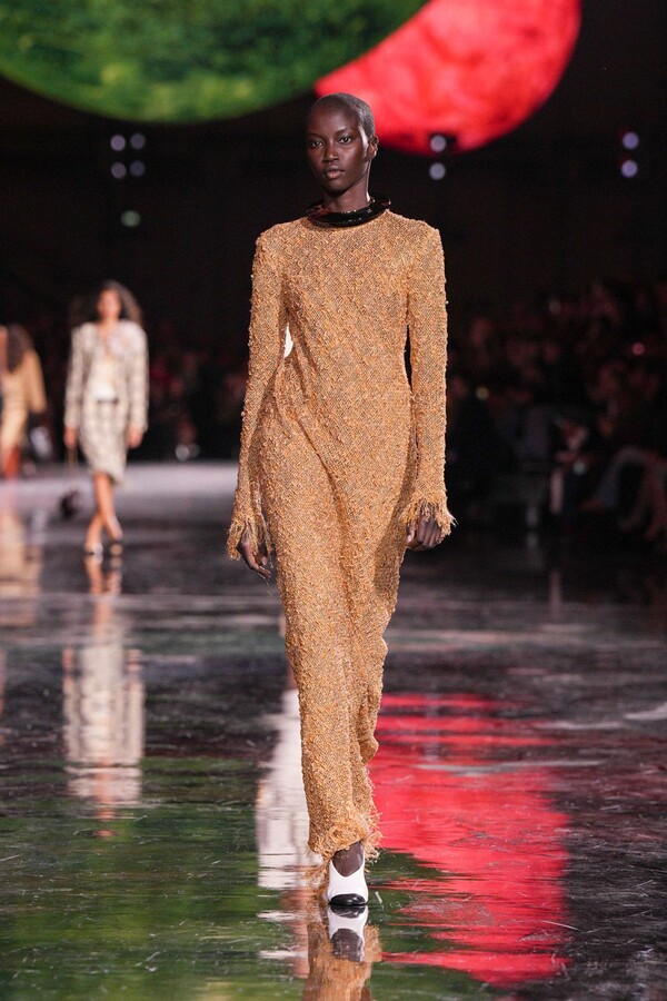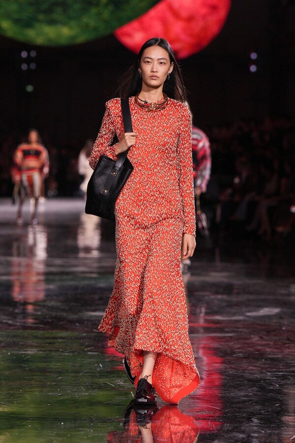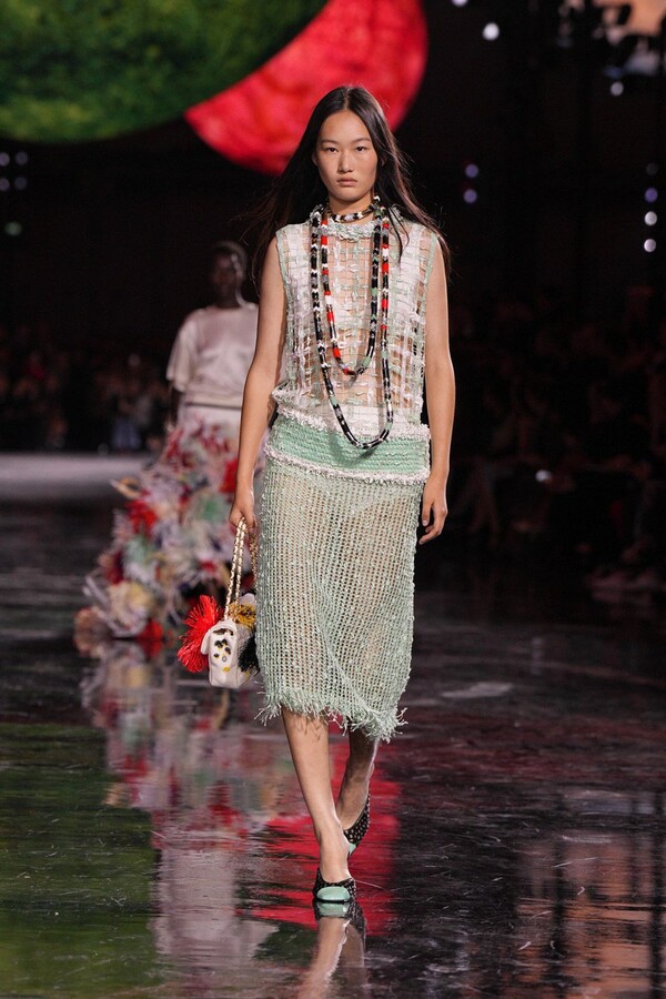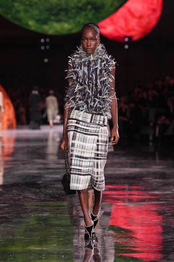 Matthieu Blazy 在 BOTTEGA VENETA 时期标志性的材质创新亦有体现。通常僵硬而拘谨的粗花呢被摒弃了传统,粘胶混纺赋予了其流畅的质感与新的活力。针织 V 领搭配裹身裙,裙摆处刺绣山茶花熠熠生辉,唤起一种务实的优雅。这些服装是为了运动、呼吸和居住而设计的——在曾经将精致与完美等同起来的 CHANEL,这是一场静悄悄的变革。