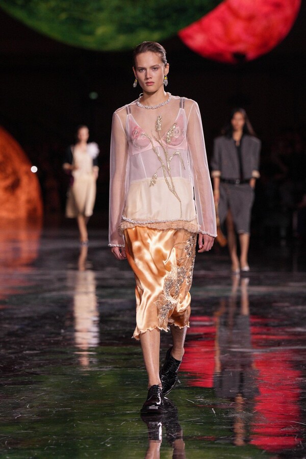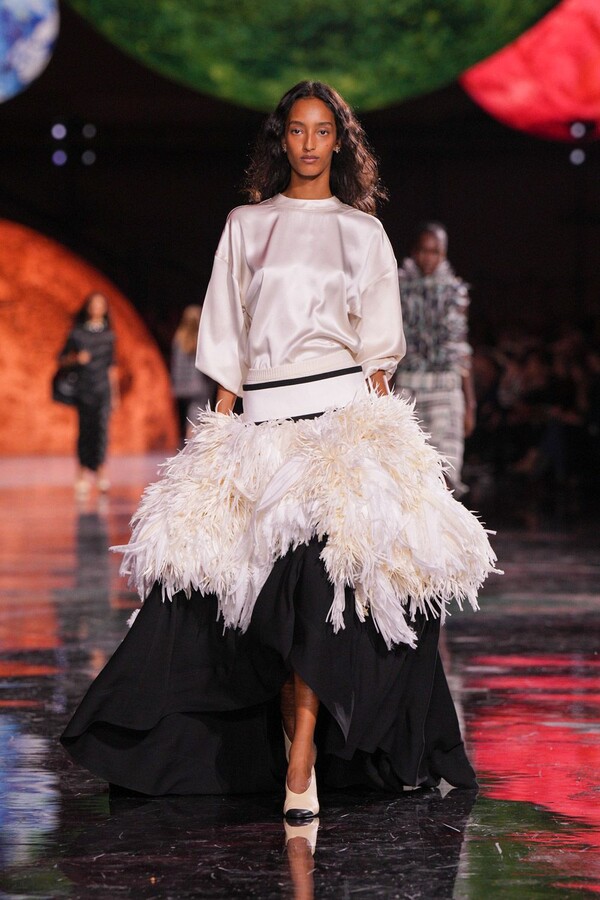 整场秀以新旧元素的流畅融合收尾:缎面 T 恤掖进羽毛裙摆,轻盈的廓形随每一步飘动,重新诠释的包头鞋鞋底闪耀着光芒。Matthieu Blazy 的 CHANEL 重新将不完美视为美,将时间的痕迹视为价值的象征。