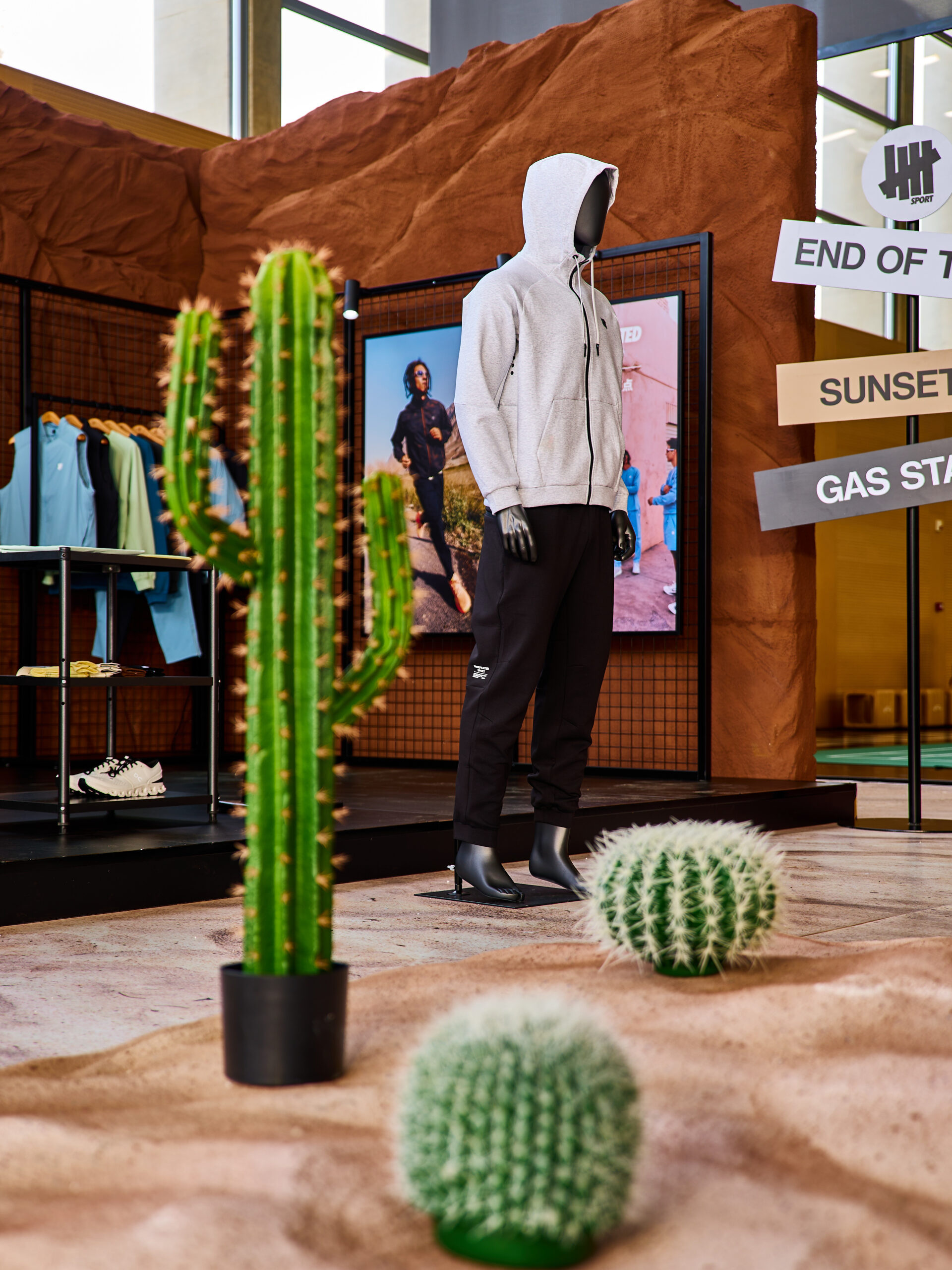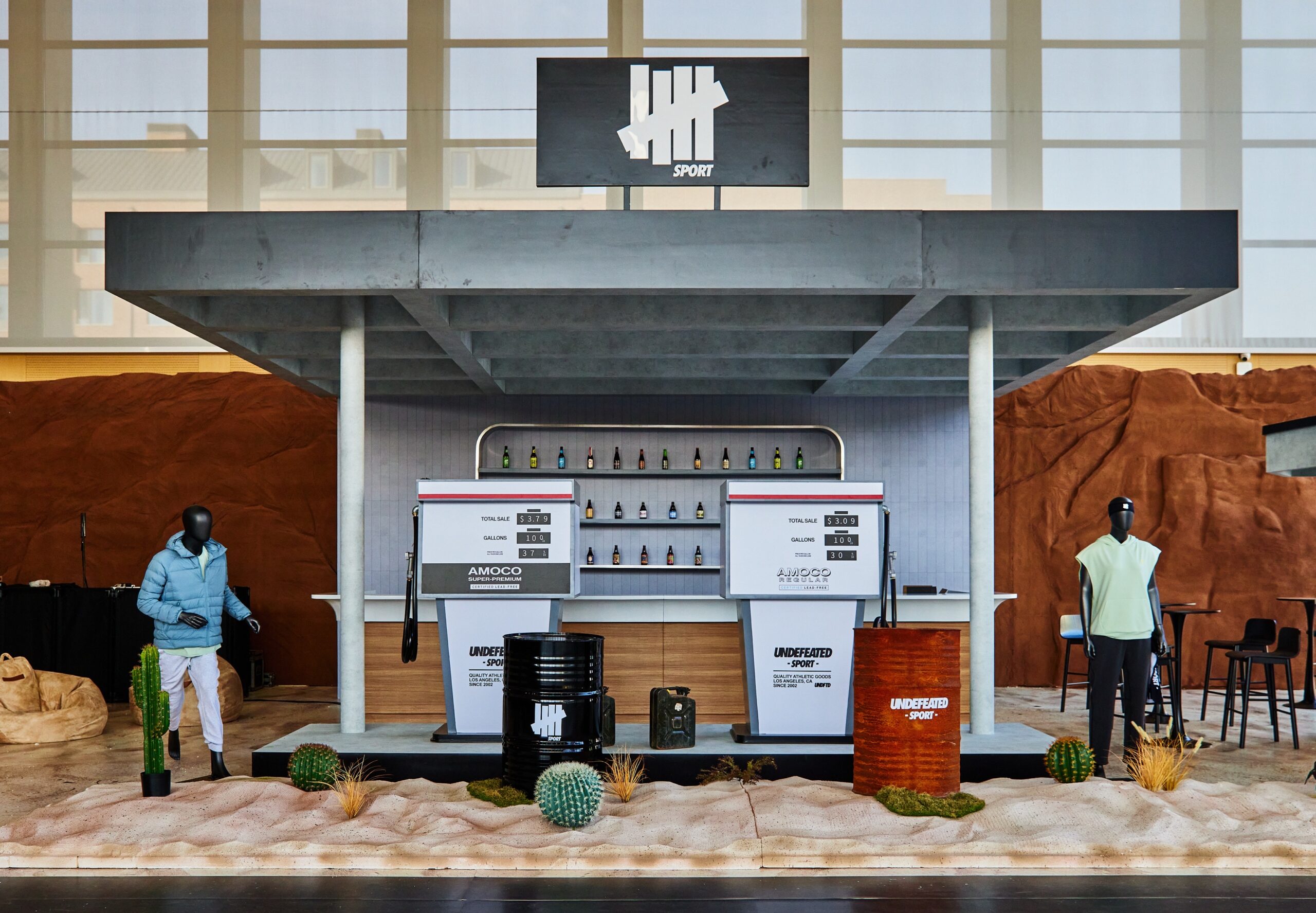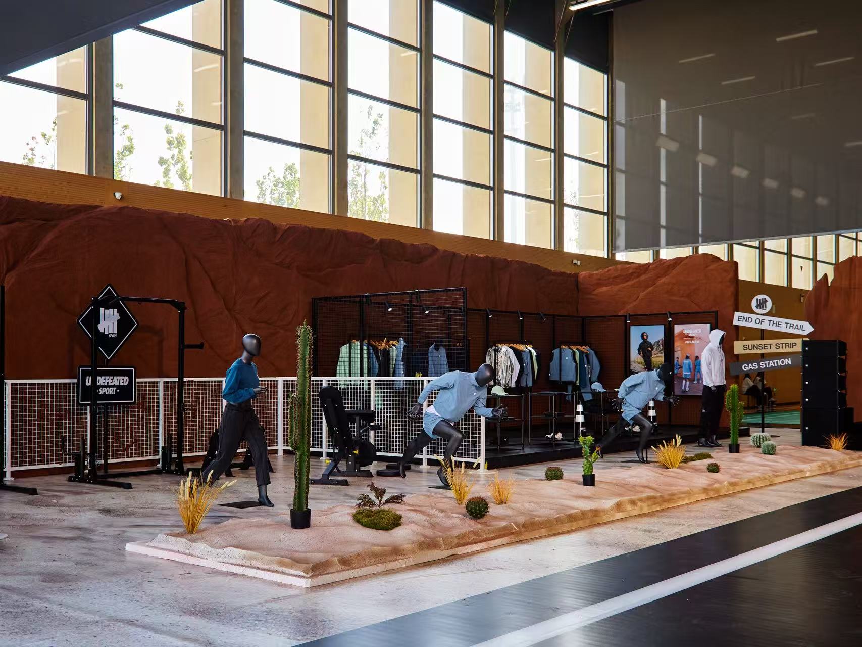「街头即赛点」主题活动首站率先落地阿那亚雀跃镇,将 UNDEFEATED SPORTS CENTER 打造成一个充满美国西部风格的沉浸式空间。现场采用大量沙石作为主视觉元素,仙人掌等热带植物在红岩背景下交错点缀,营造出粗犷而自由的自然氛围。更具巧思的是,场馆特别设立了以加油站为灵感的水吧区域,将实用功能与场景美学相结合,让参与者在运动挑战中获得仿佛置身沙漠公路旅程的体验。