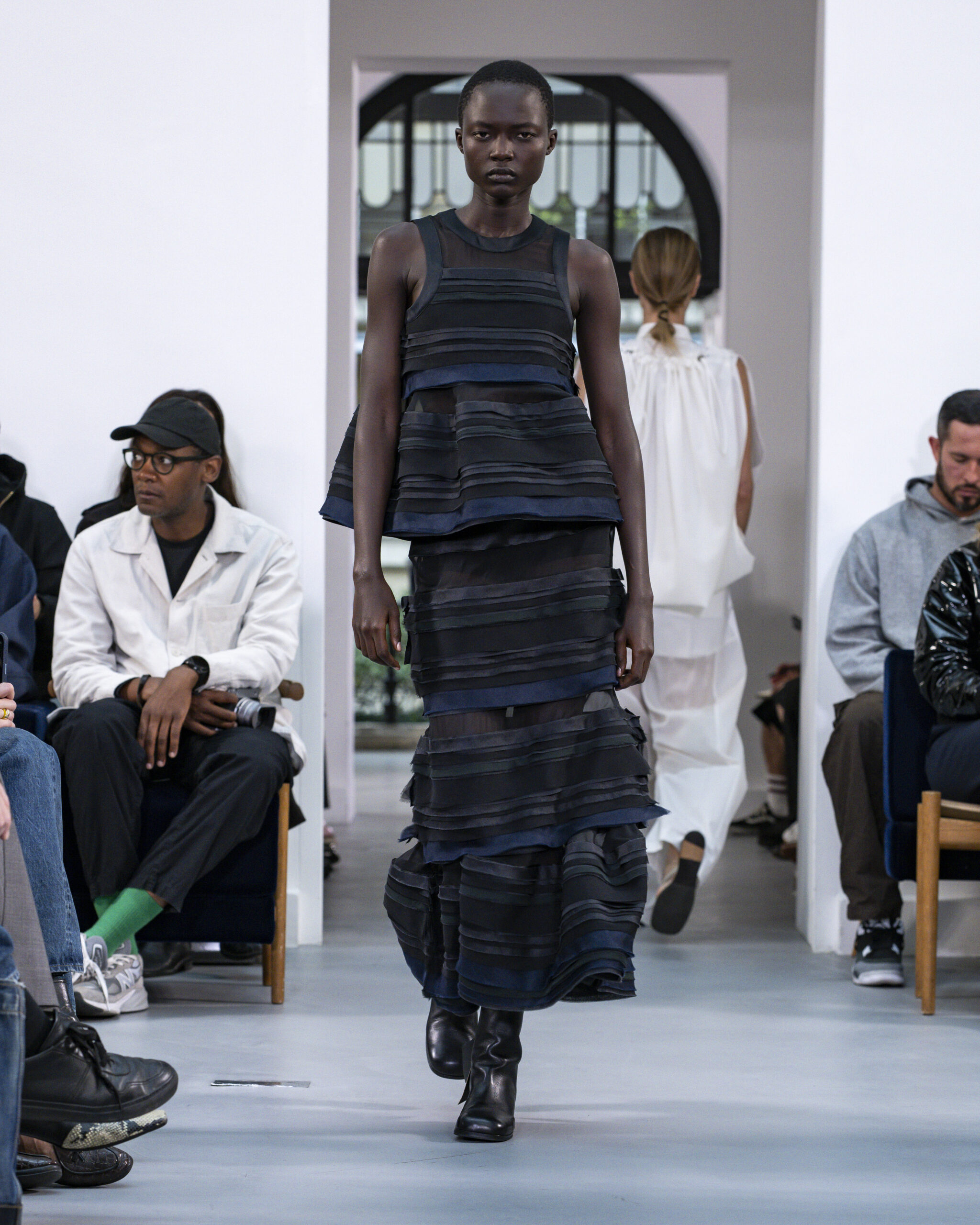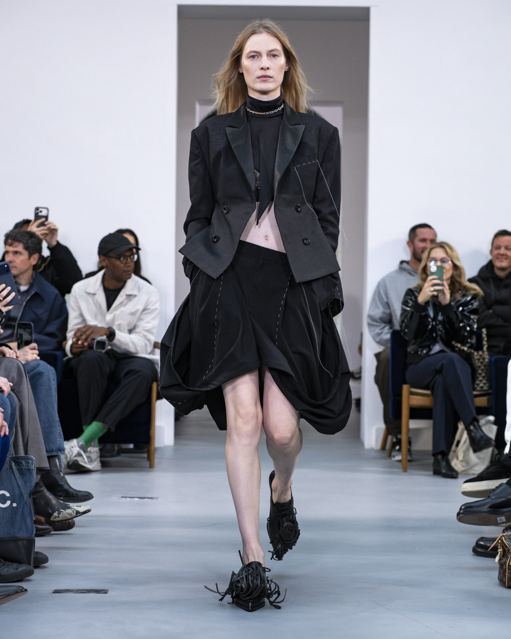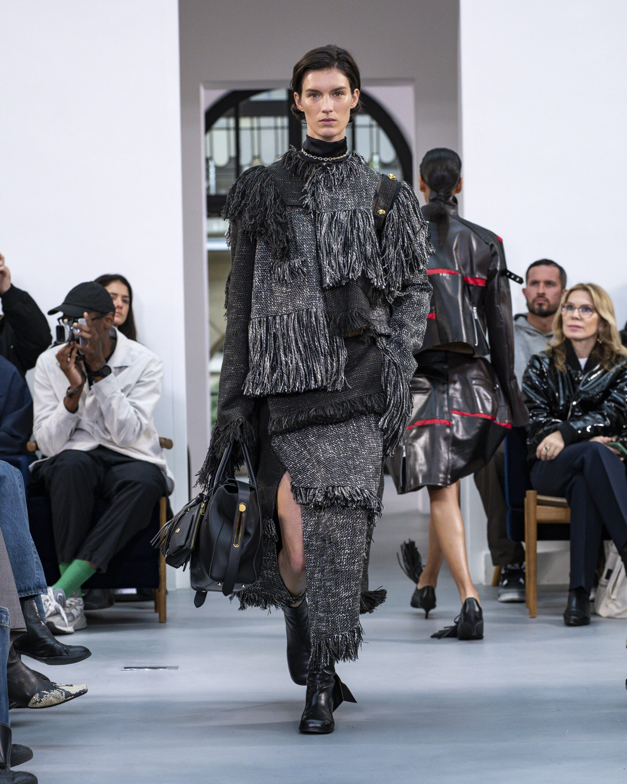 设计师持续深入探索廓形与比例:肩垫经过重构和叠加,化作褶饰装点燕尾服外套;解构后的翻领与隐约可见的内搭丝质衬衫相称无间。粗花呢面料被拆解成流苏,如瀑倾泻。羊绒连帽衫摇身变成荷叶边连衣裙。衬衫、燕尾服与半裙融为一体。最具实用性的牛仔面料经过层层堆叠,尽显亮眼格调。鞋履延续设计主题,以夸张流苏点缀,摇曳生姿。
