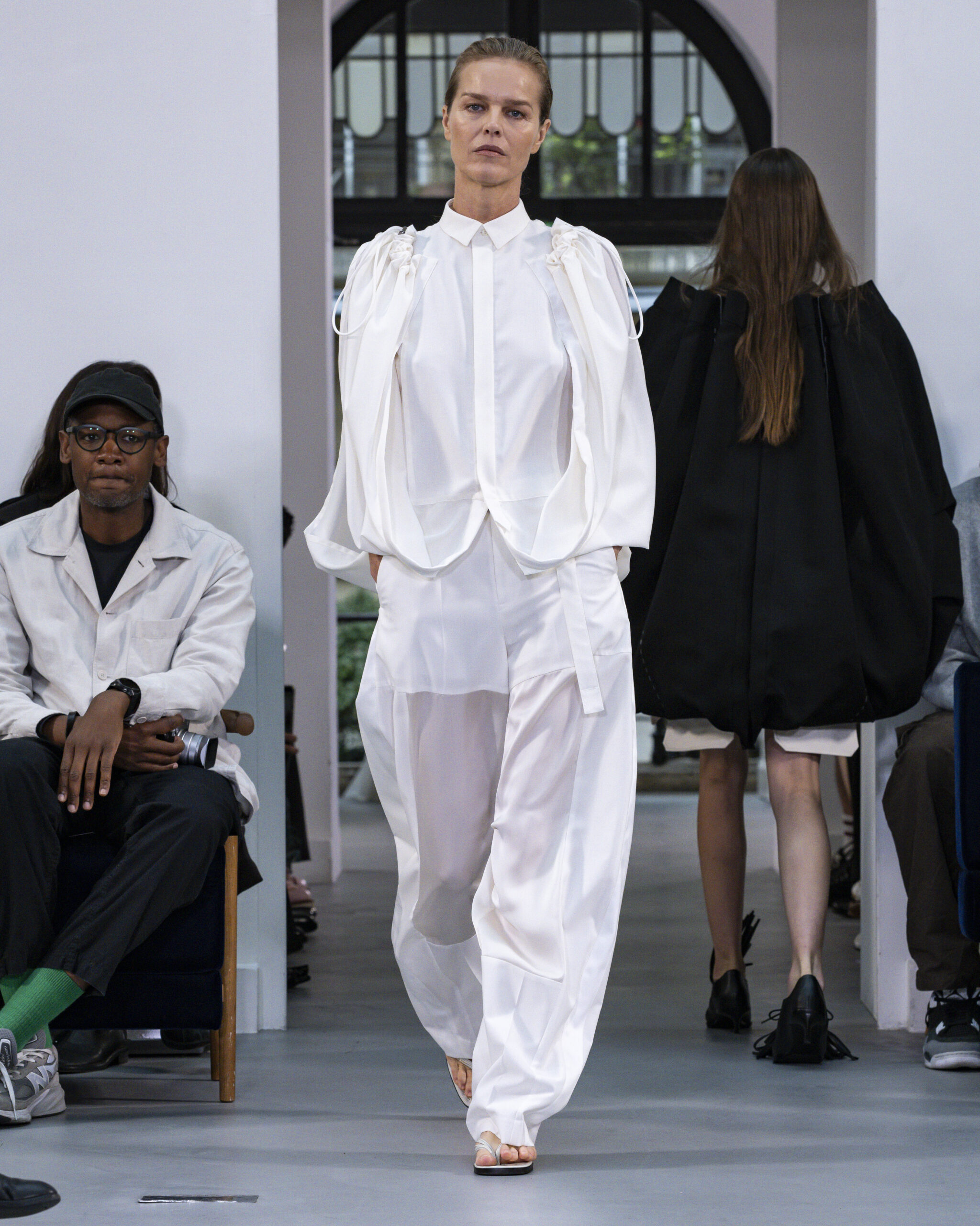 看似繁复的结构,源自最为基础和熟悉的服装原型与材质。设计师运用标志性的混搭设计,将经典廓形拆解重组,创造出契合穿衣者的灵动新意,可随心变化。基于经典着装,玩转「翻折」概念,全新的立体廓形焕发新生。工装裤管向上翻折成蓬松半裙,背心则上翻成衬衫。燕尾服长裤经过剪裁,化作茧形斗篷。