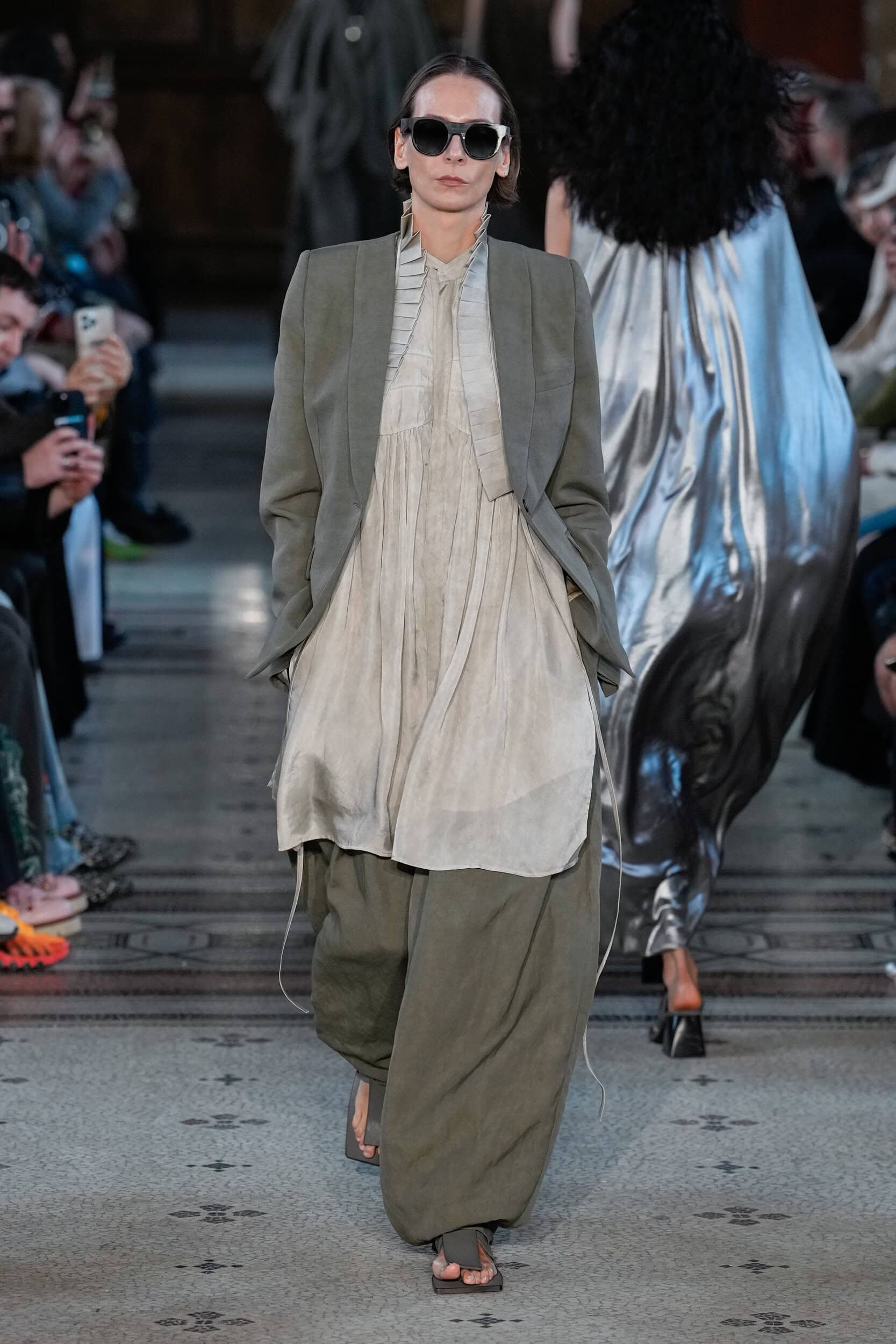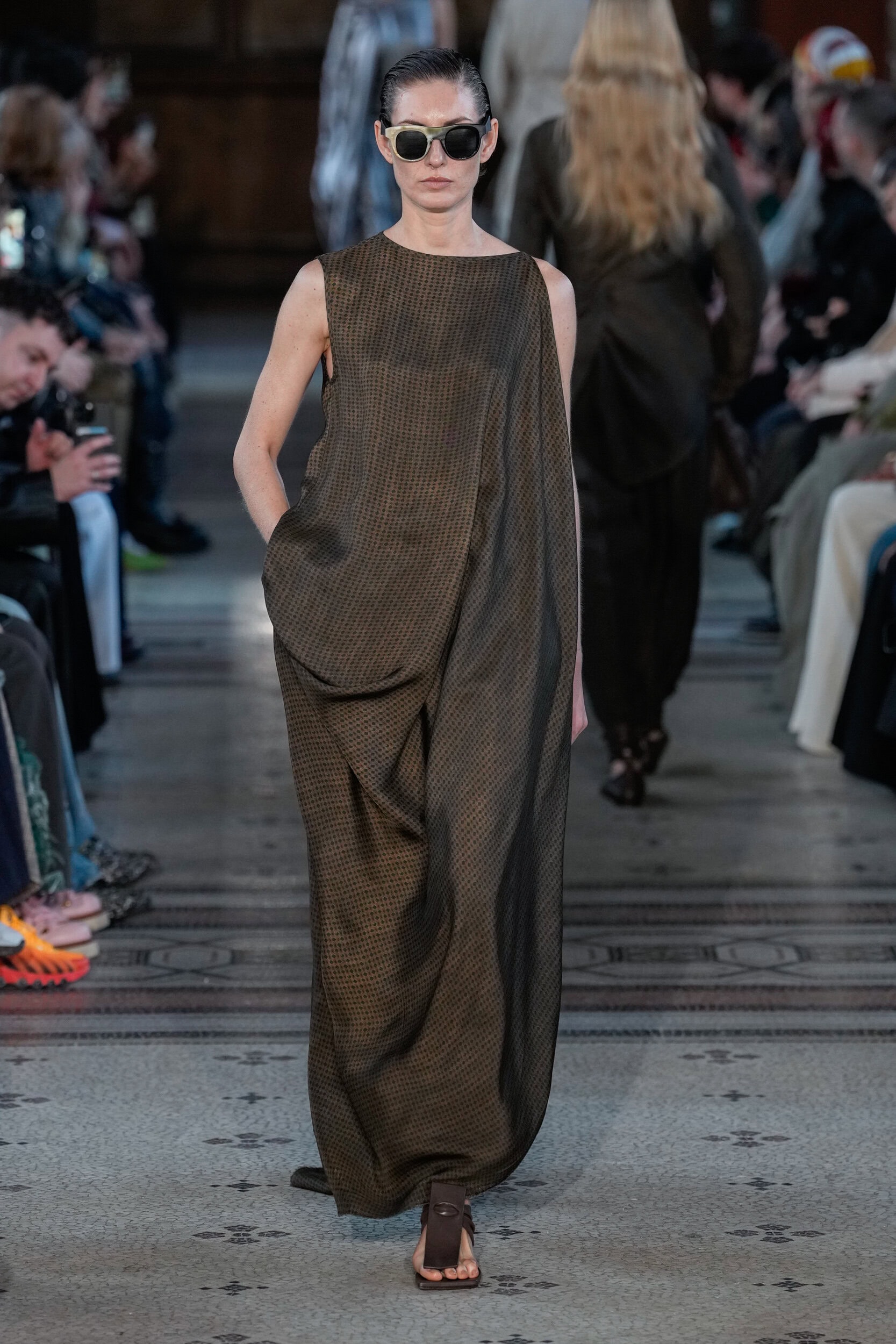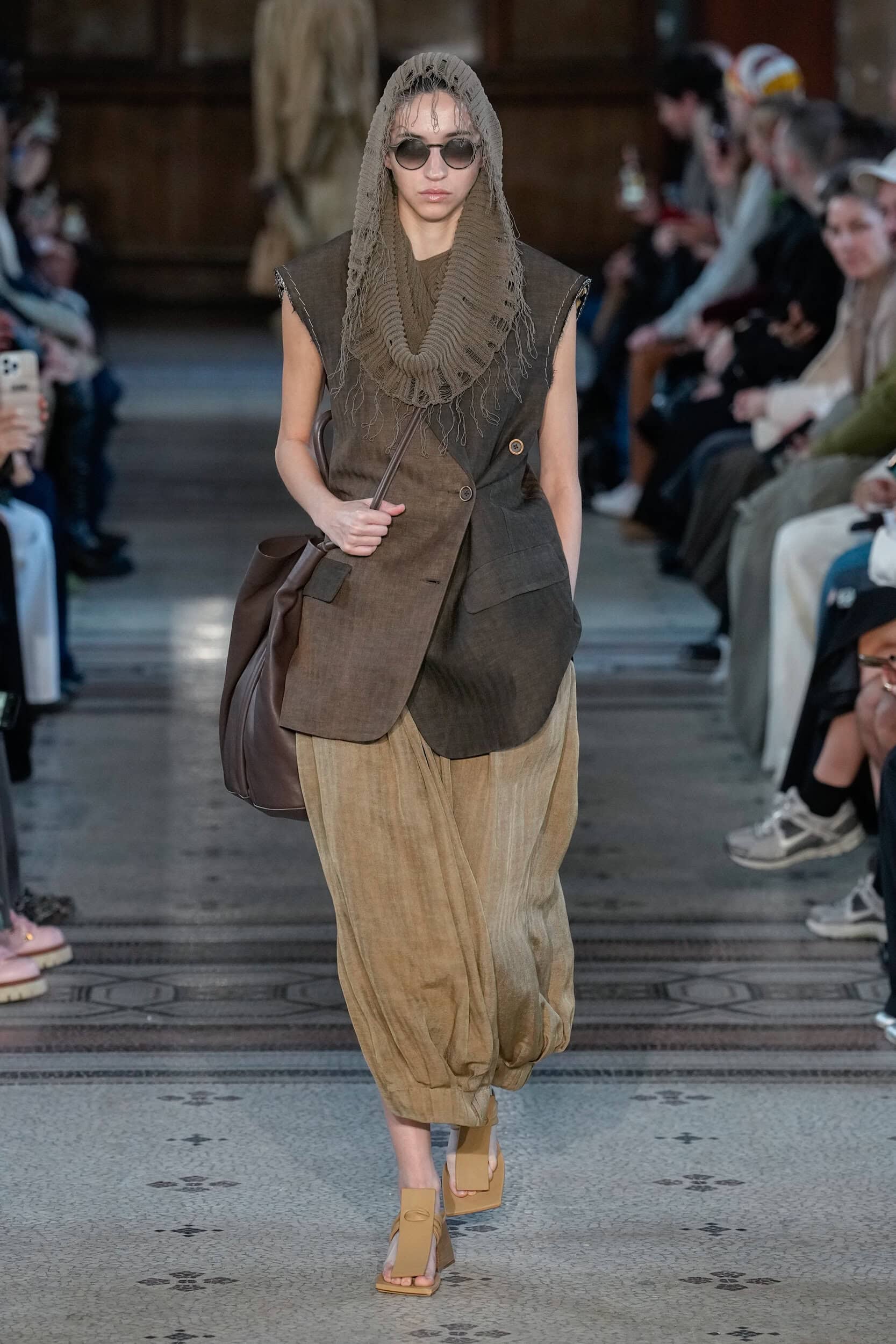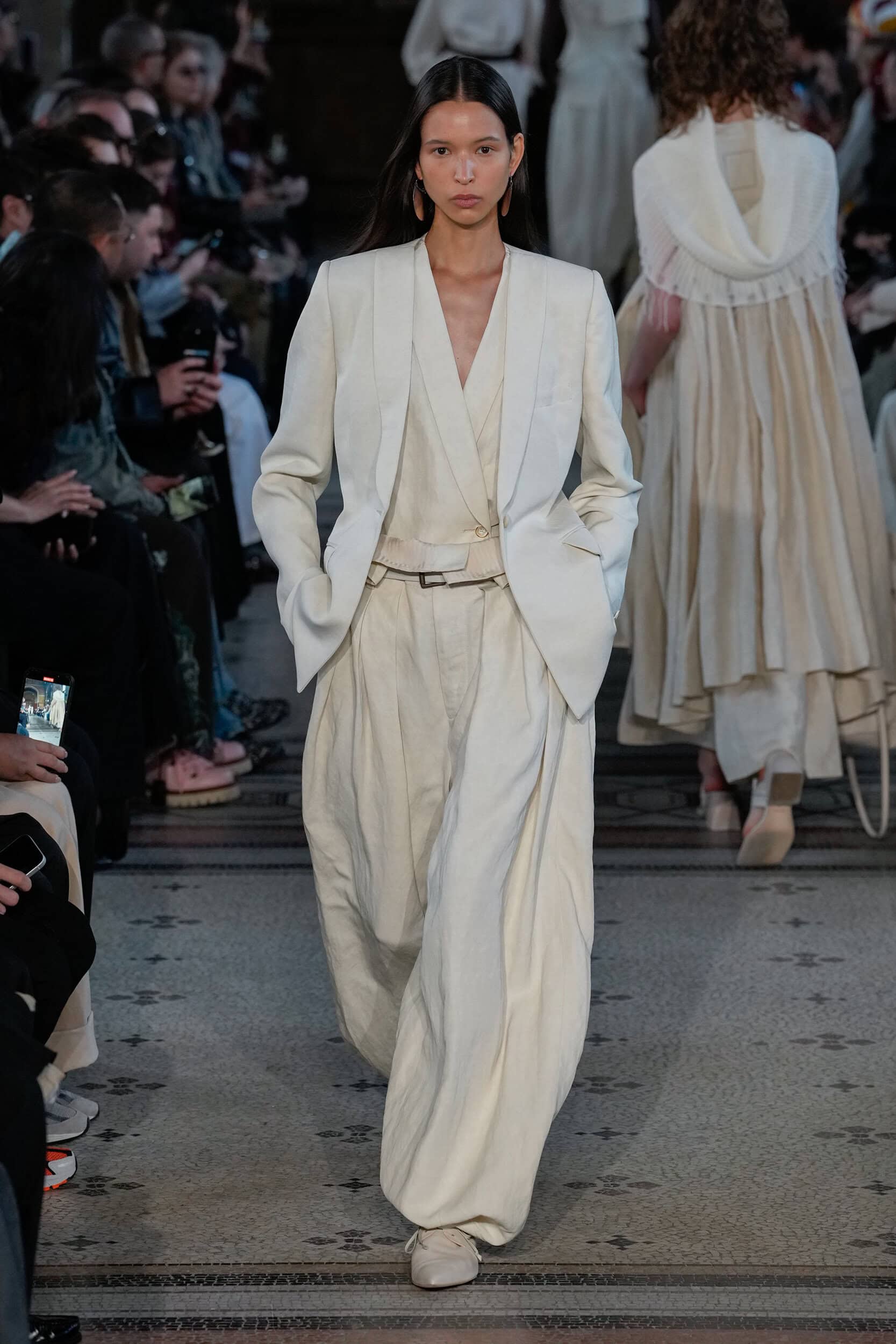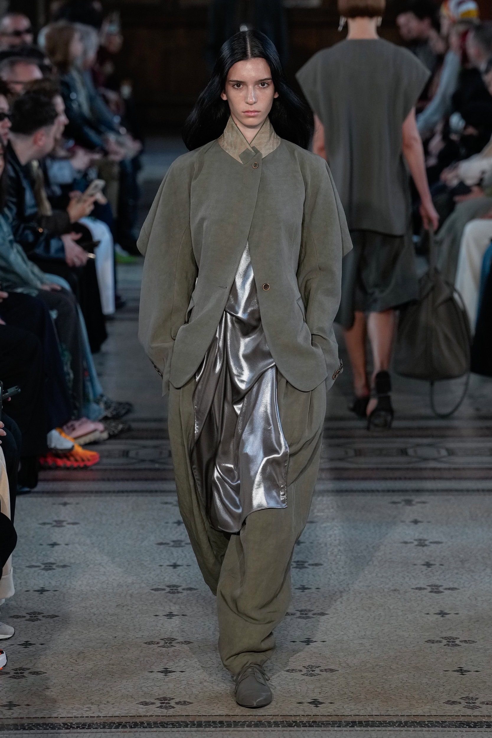 Uma Wang 2026 春夏秀在巴黎工艺美术博物馆楼上的古老大厅揭晓。Uma Wang 表示主要灵感来自一次意大利之旅,在「众神的居所」曼图亚的德特宫,大理石材质的层叠布料和面纱深深吸引了她。「我喜欢面纱遮住眼睛的方式,这让人好奇它的含义。我们从这个角度出发,思考如何才能保留这些元素,让它们轻盈、柔和、流畅,展现出强烈而又不失女性气质。」