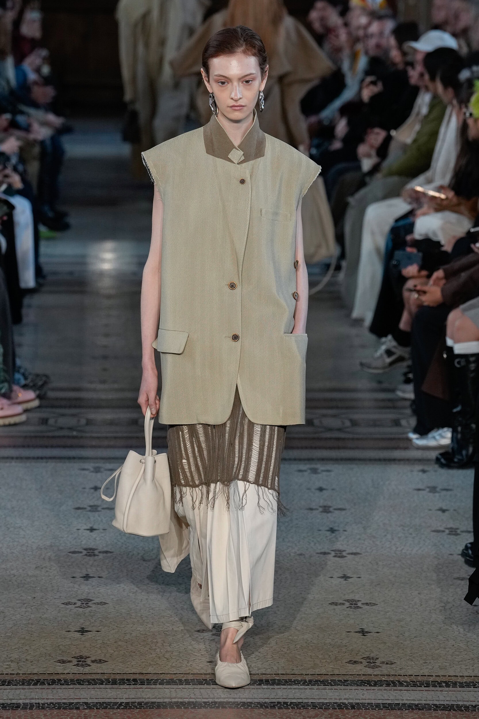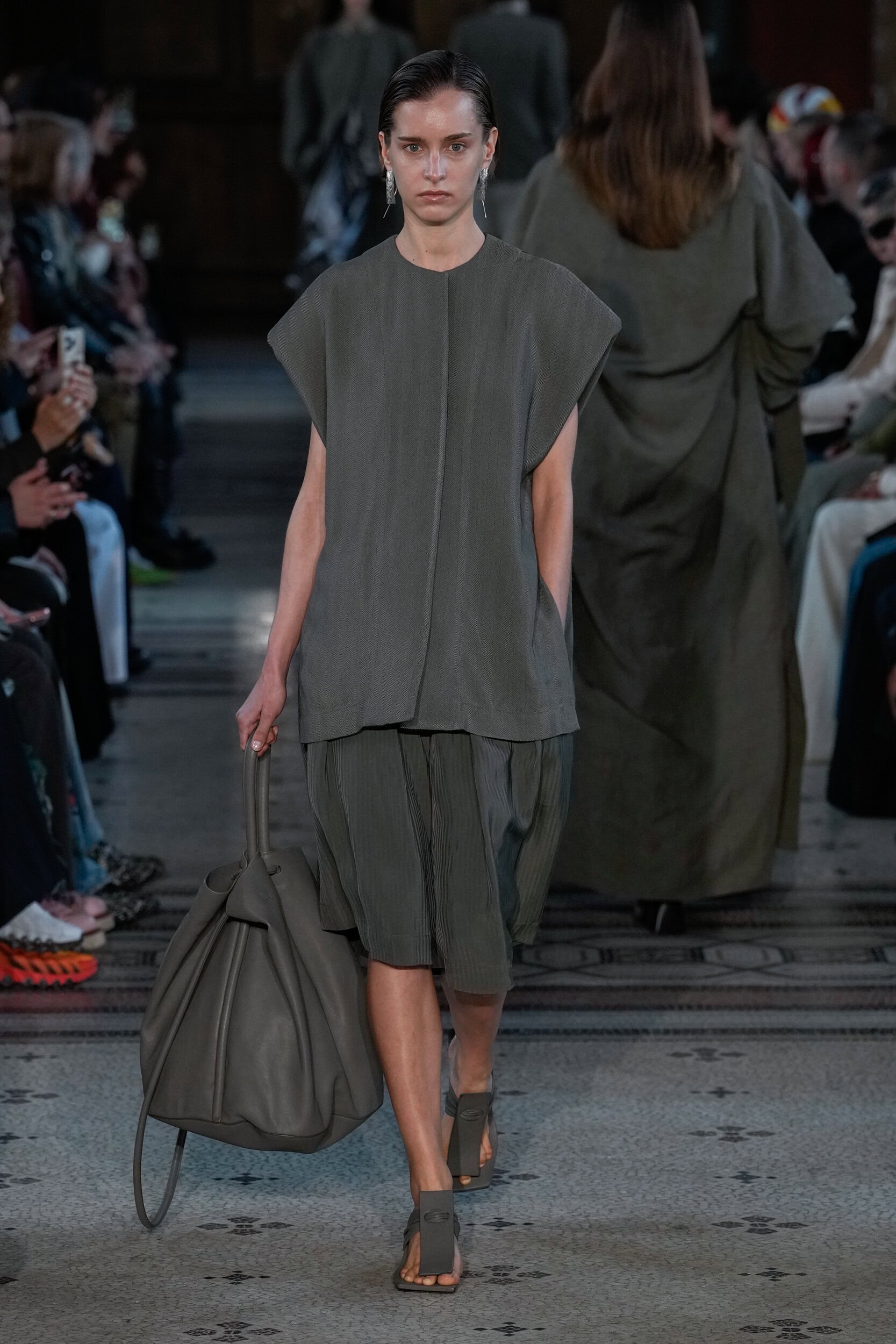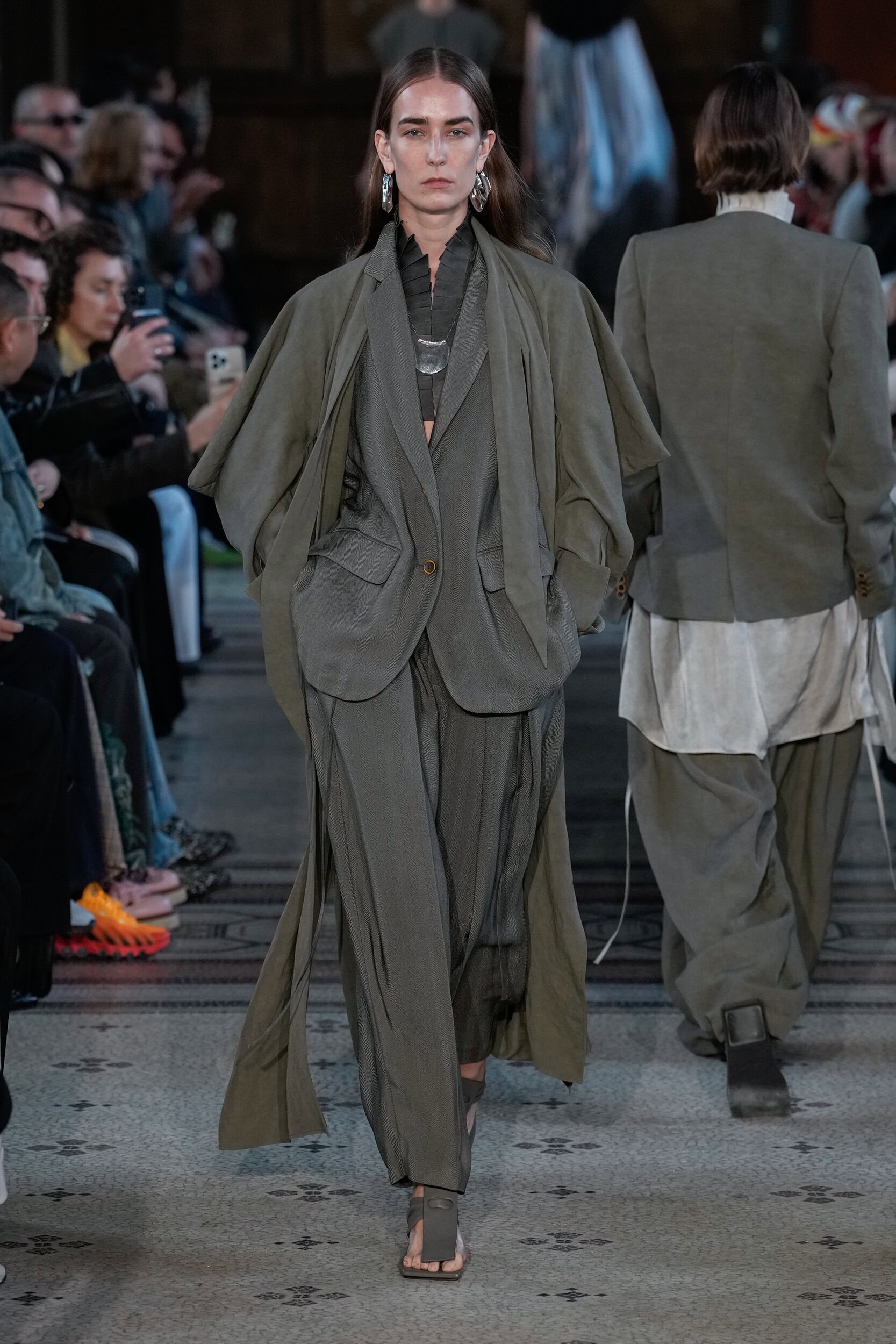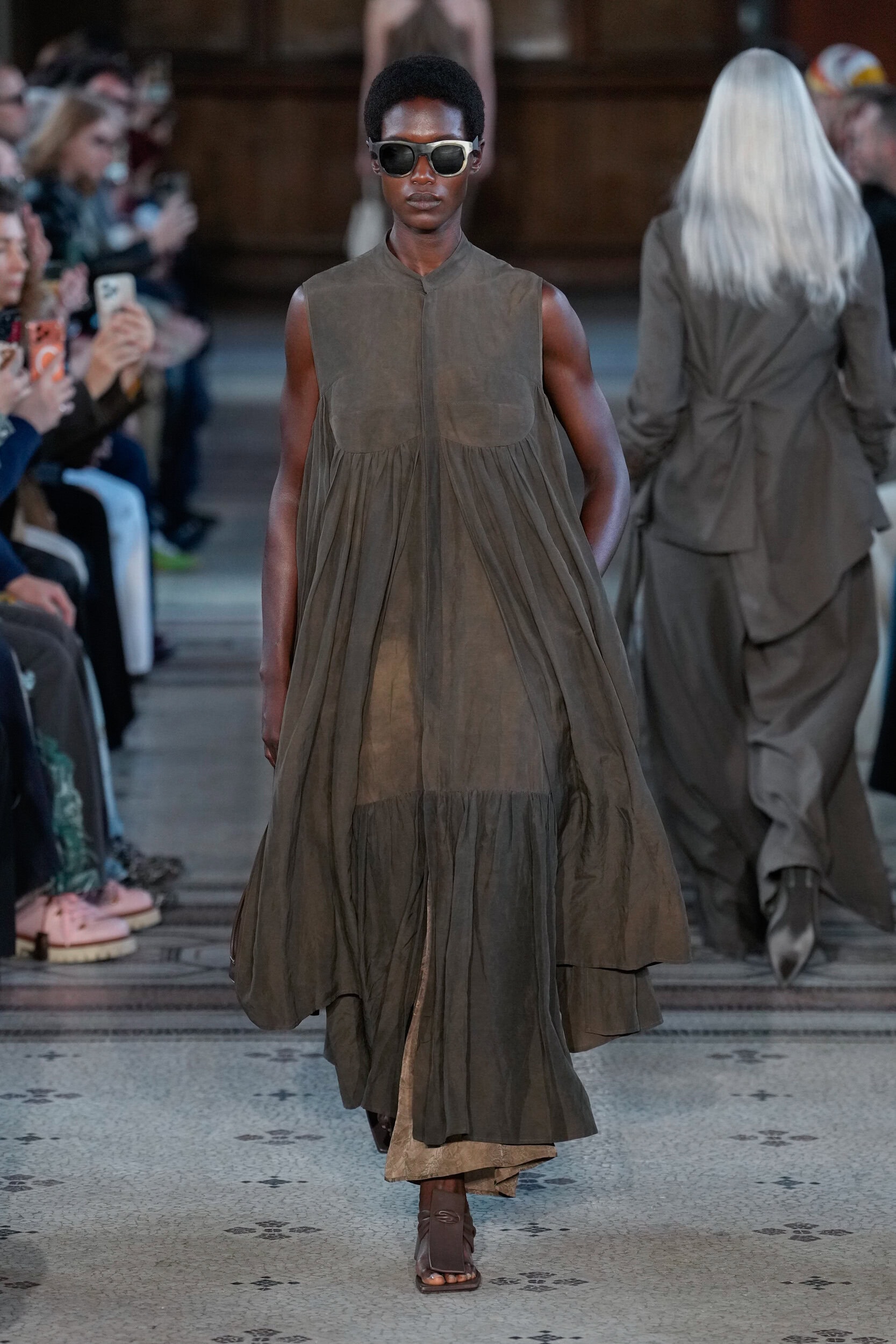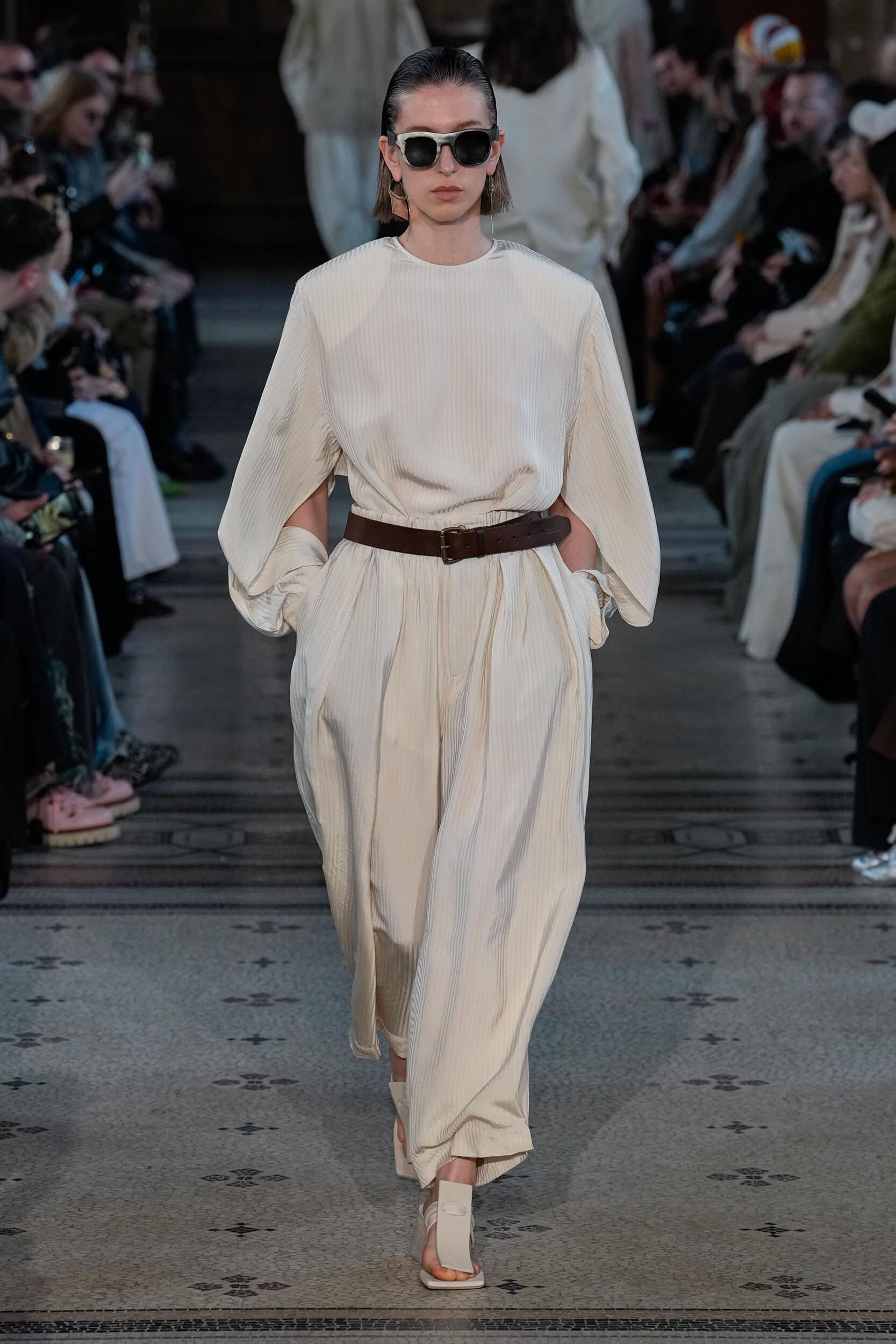 Uma Wang 2026 春夏秀在巴黎工艺美术博物馆楼上的古老大厅揭晓。Uma Wang 表示主要灵感来自一次意大利之旅,在「众神的居所」曼图亚的德特宫,大理石材质的层叠布料和面纱深深吸引了她。「我喜欢面纱遮住眼睛的方式,这让人好奇它的含义。我们从这个角度出发,思考如何才能保留这些元素,让它们轻盈、柔和、流畅,展现出强烈而又不失女性气质。」