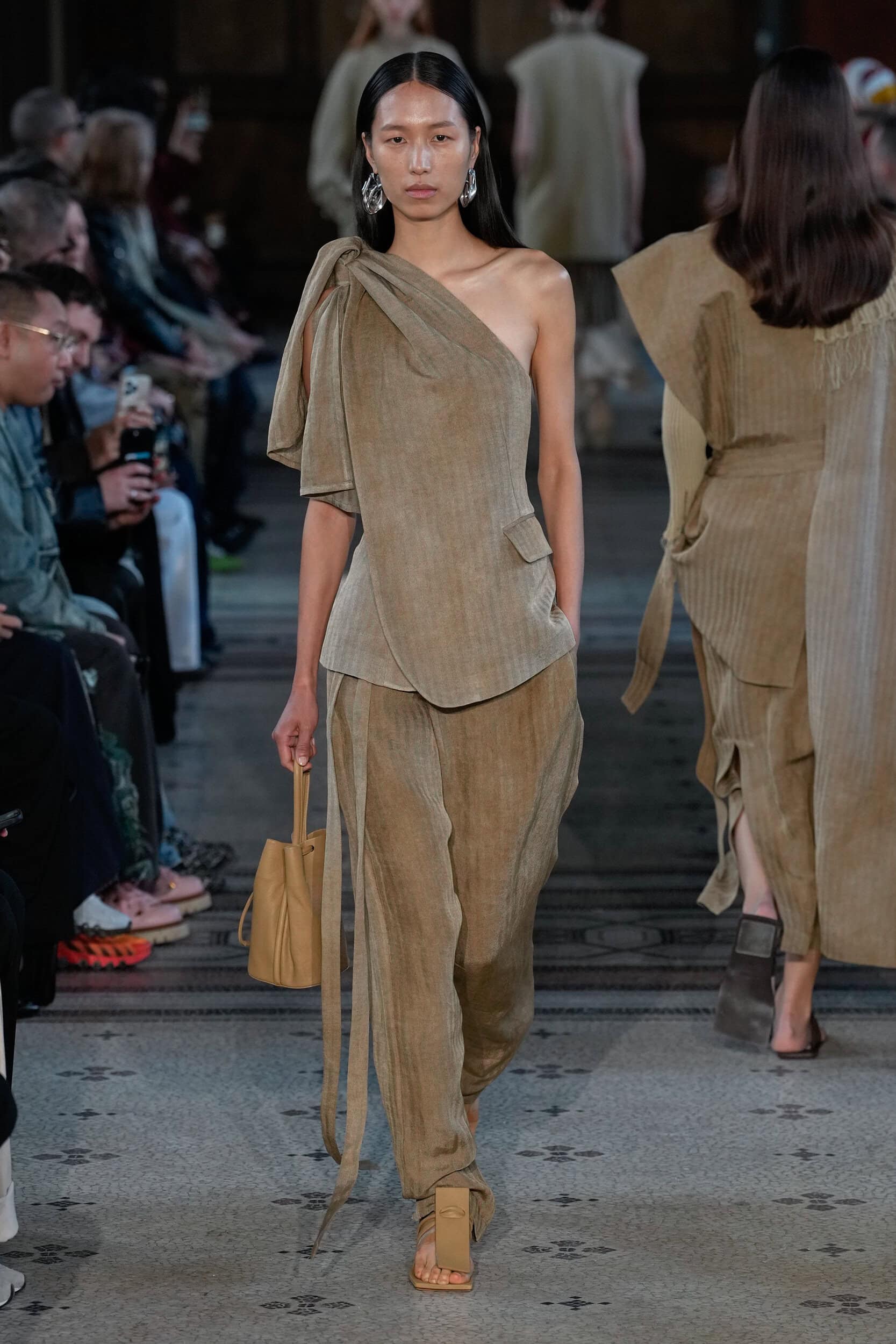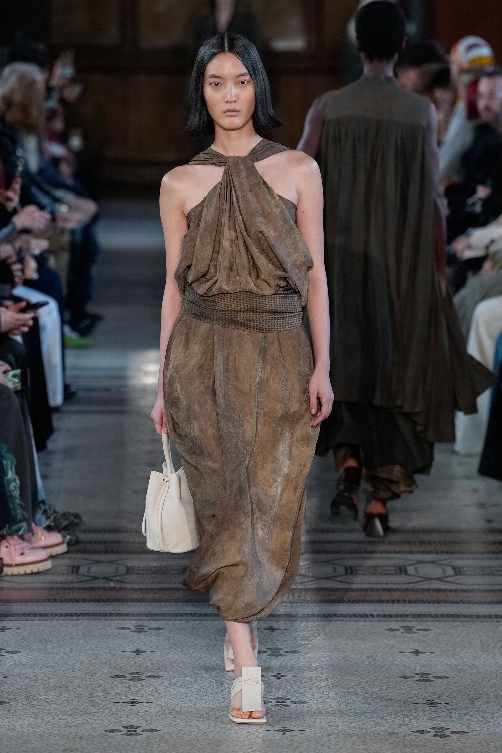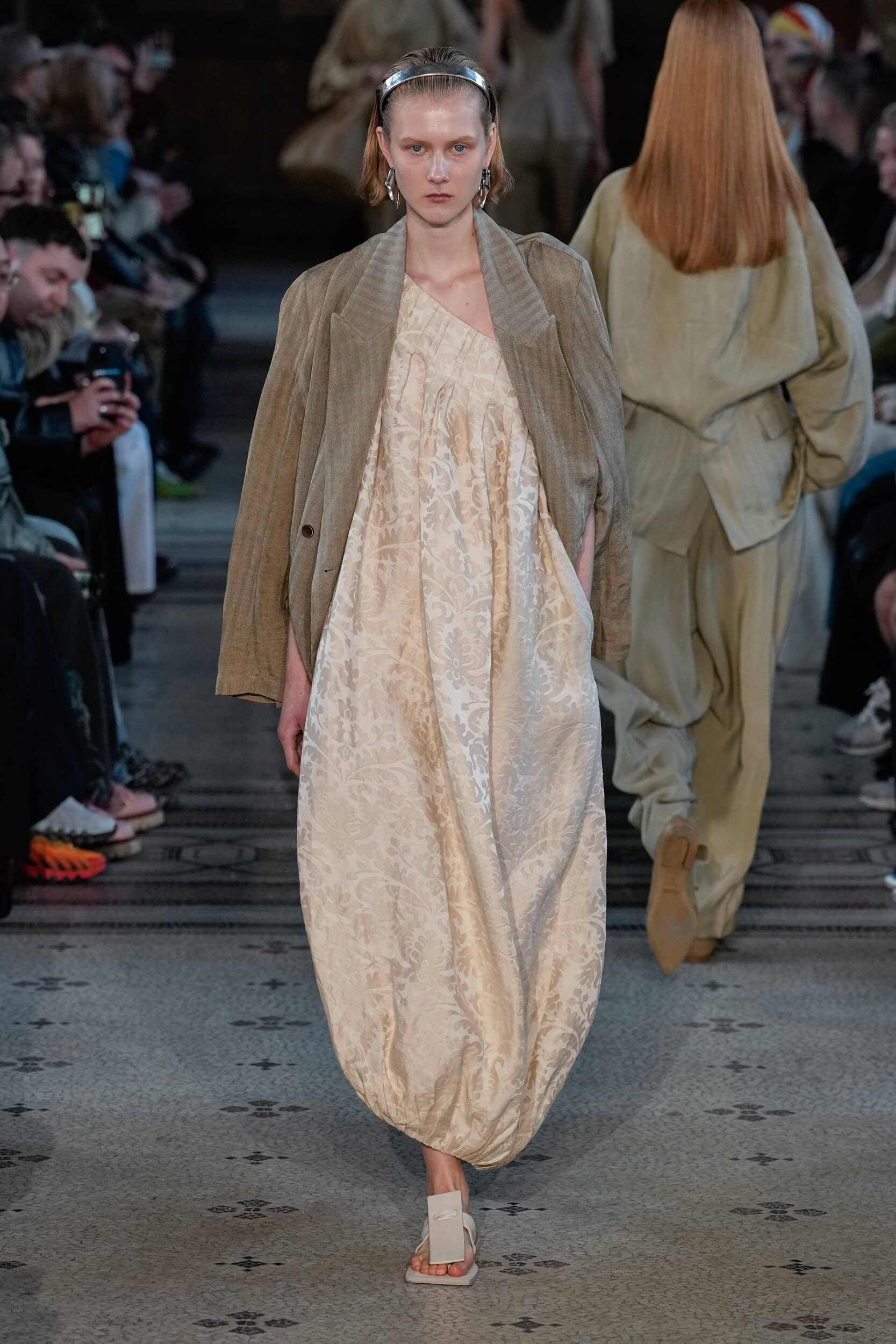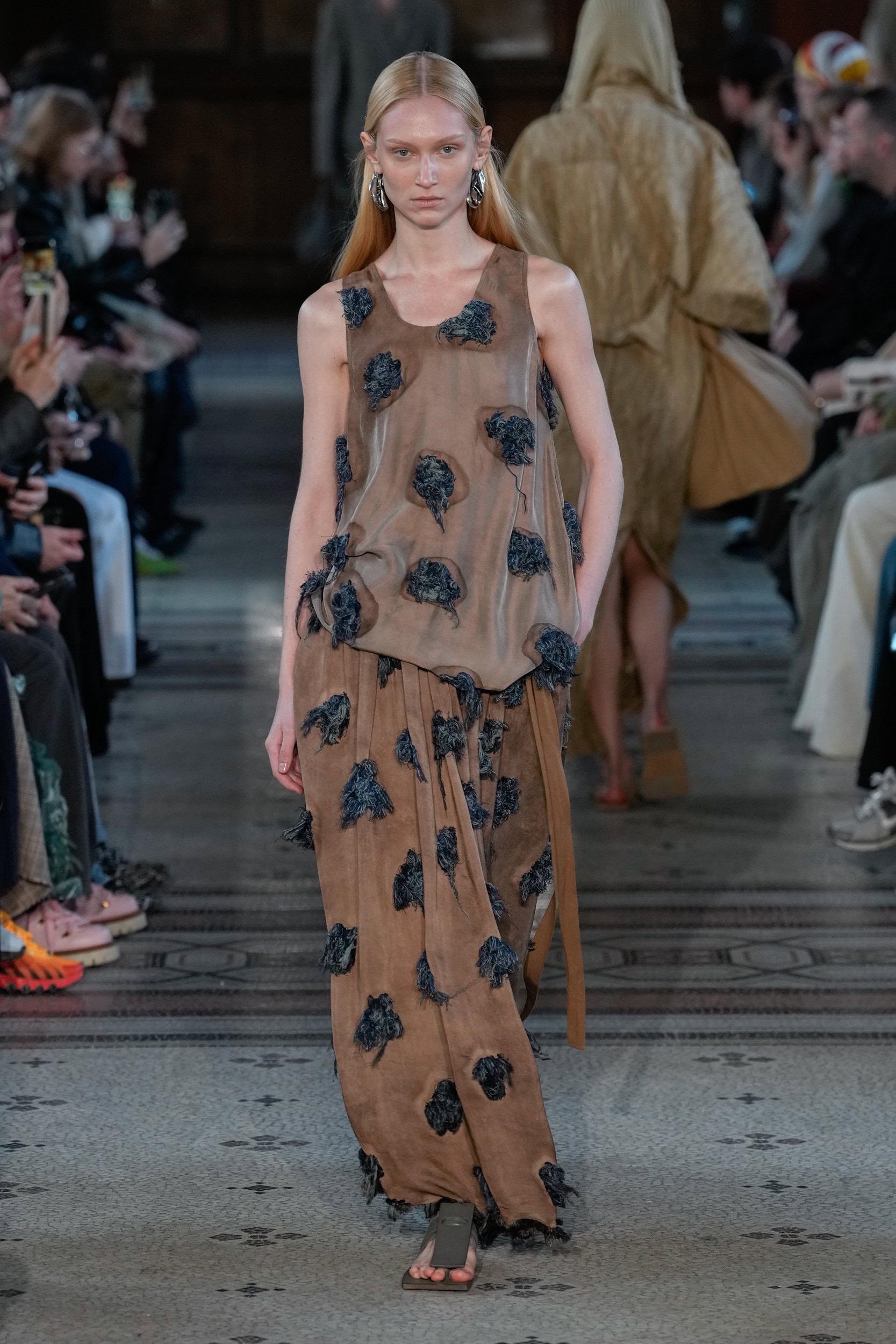 Uma Wang 还通过在单肩上衣上戏剧性地打结、做旧针织,以及正反两面刺绣来增强纹理效果。飘逸的青铜色连衣裙上点缀着深蓝色的簇绒,而从反面看,这其实是借用自千年前兴起的我们宋朝的花卉图案。水银色的丝绸和日本品牌 Detaj 的有机造型银饰,则为服装增添了一抹亮色。