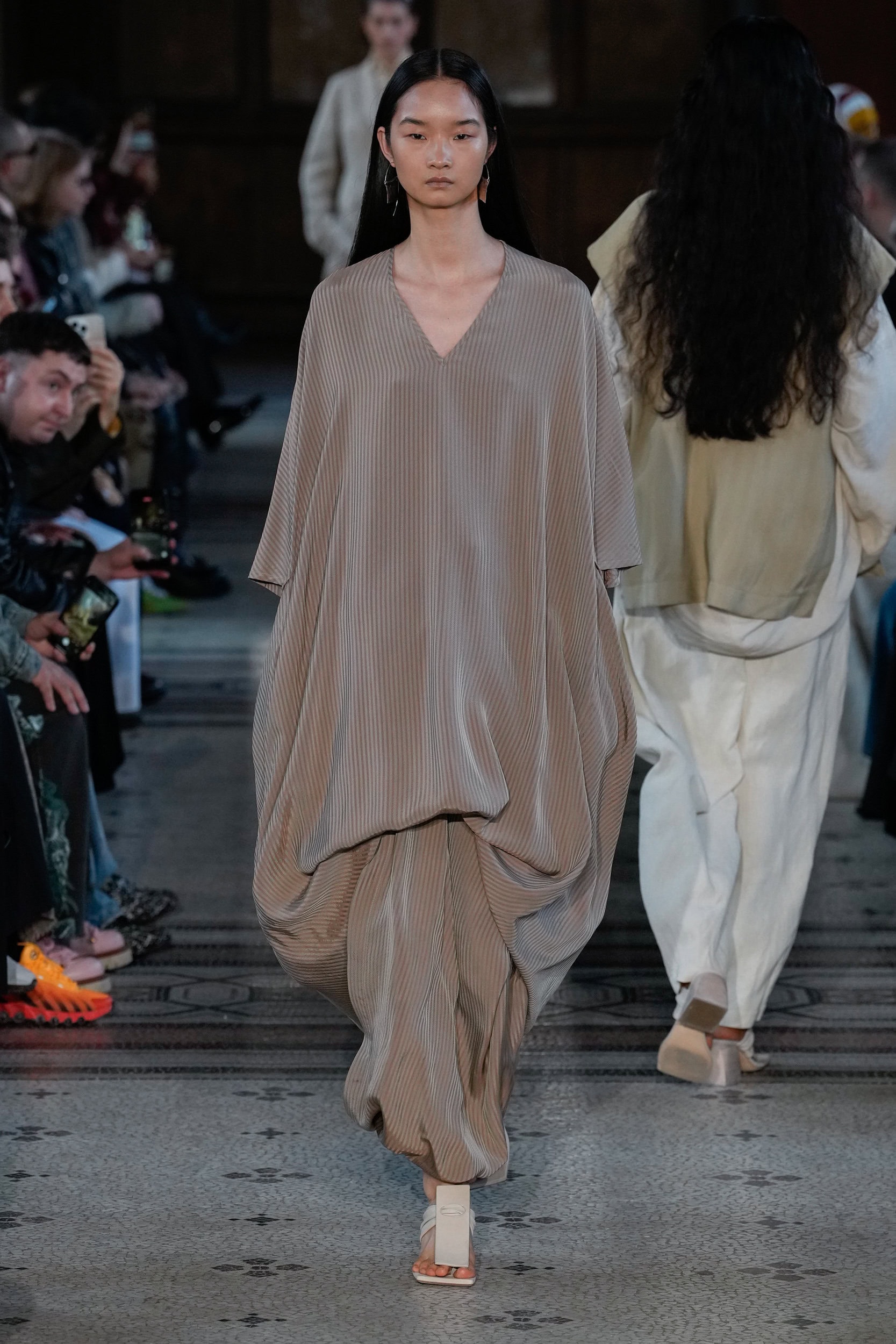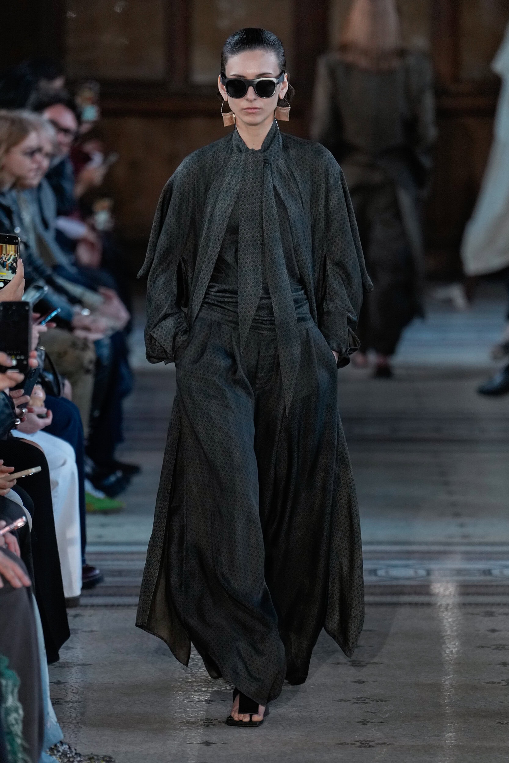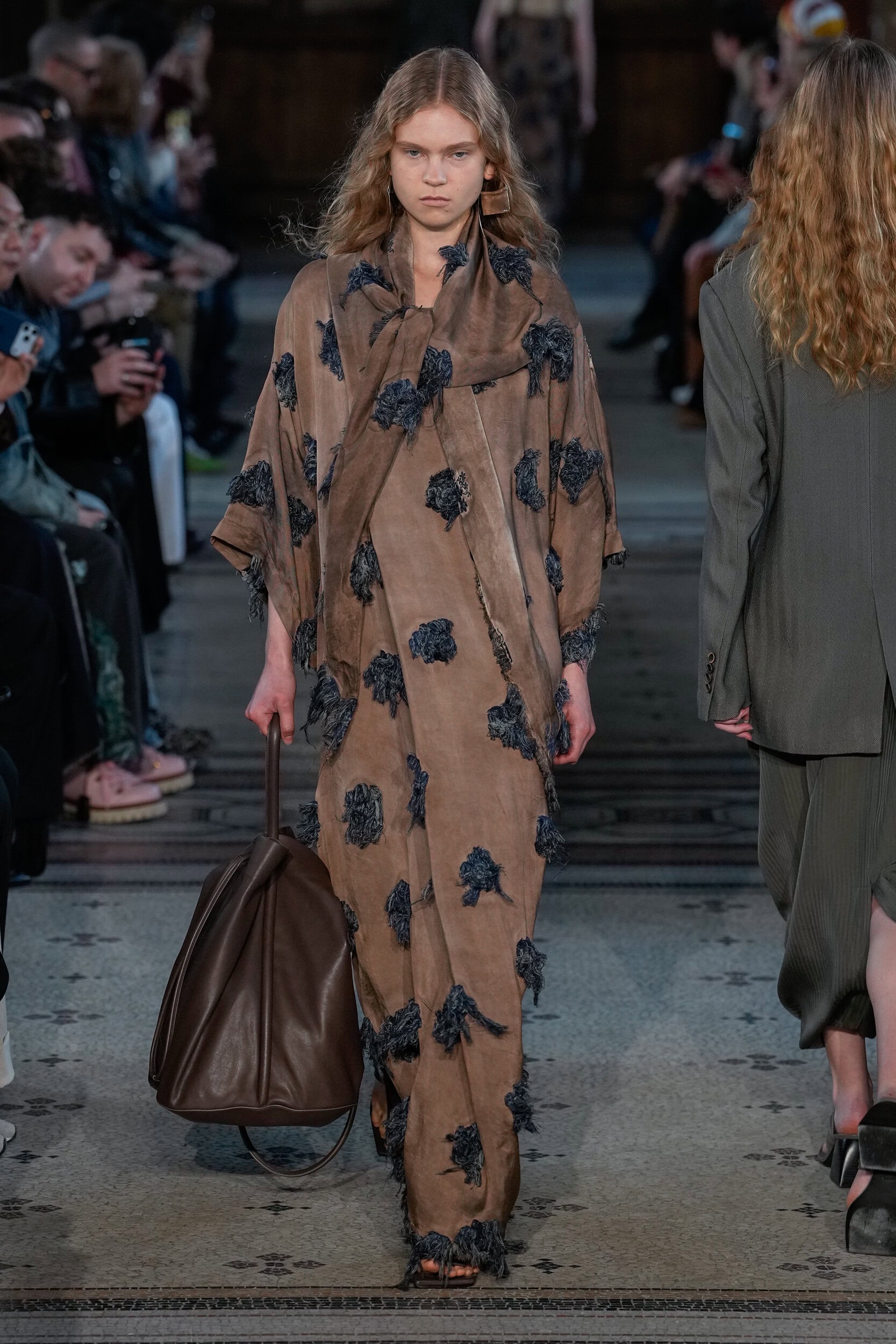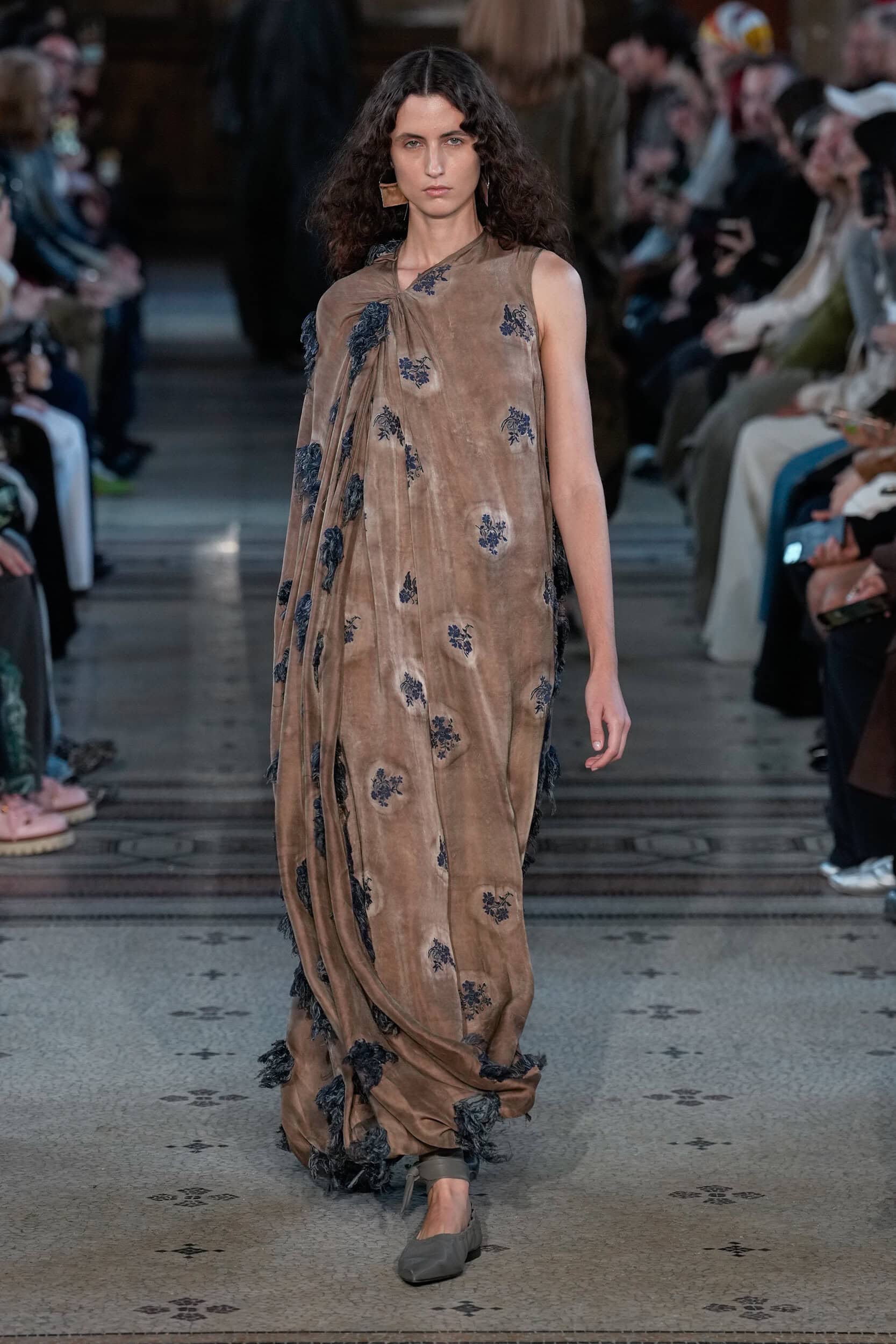 Uma Wang 还通过在单肩上衣上戏剧性地打结、做旧针织,以及正反两面刺绣来增强纹理效果。飘逸的青铜色连衣裙上点缀着深蓝色的簇绒,而从反面看,这其实是借用自千年前兴起的我们宋朝的花卉图案。水银色的丝绸和日本品牌 Detaj 的有机造型银饰,则为服装增添了一抹亮色。
