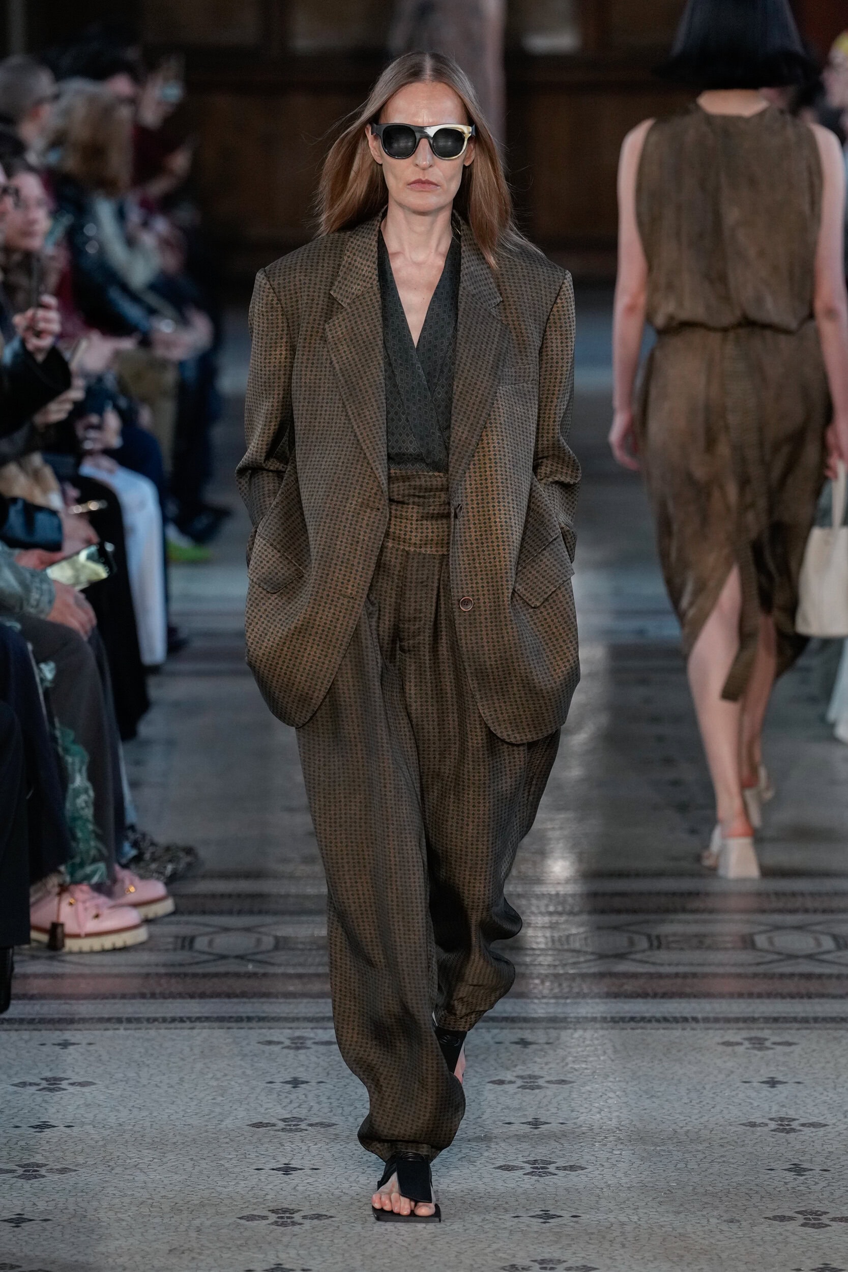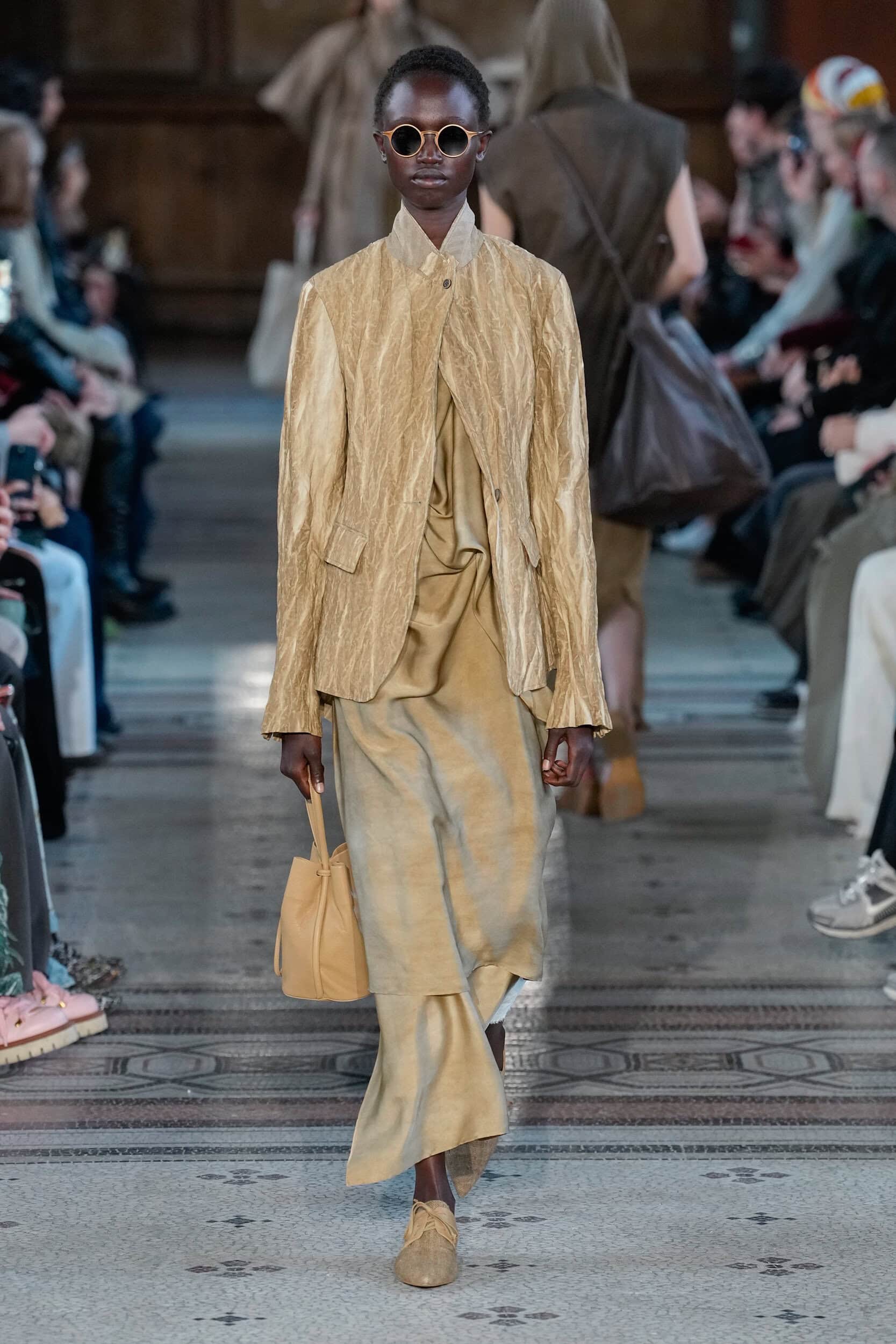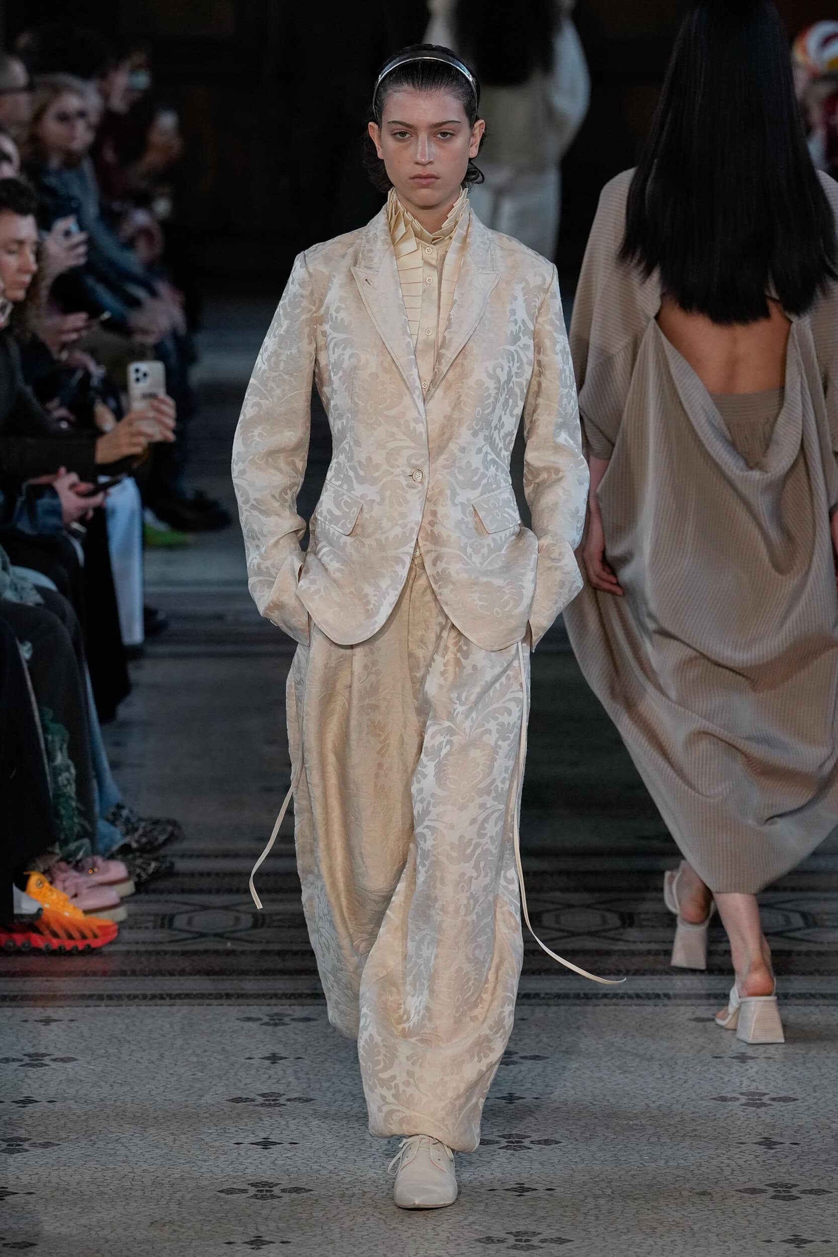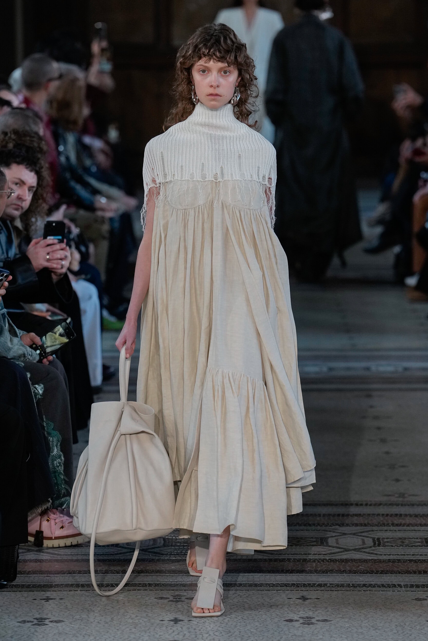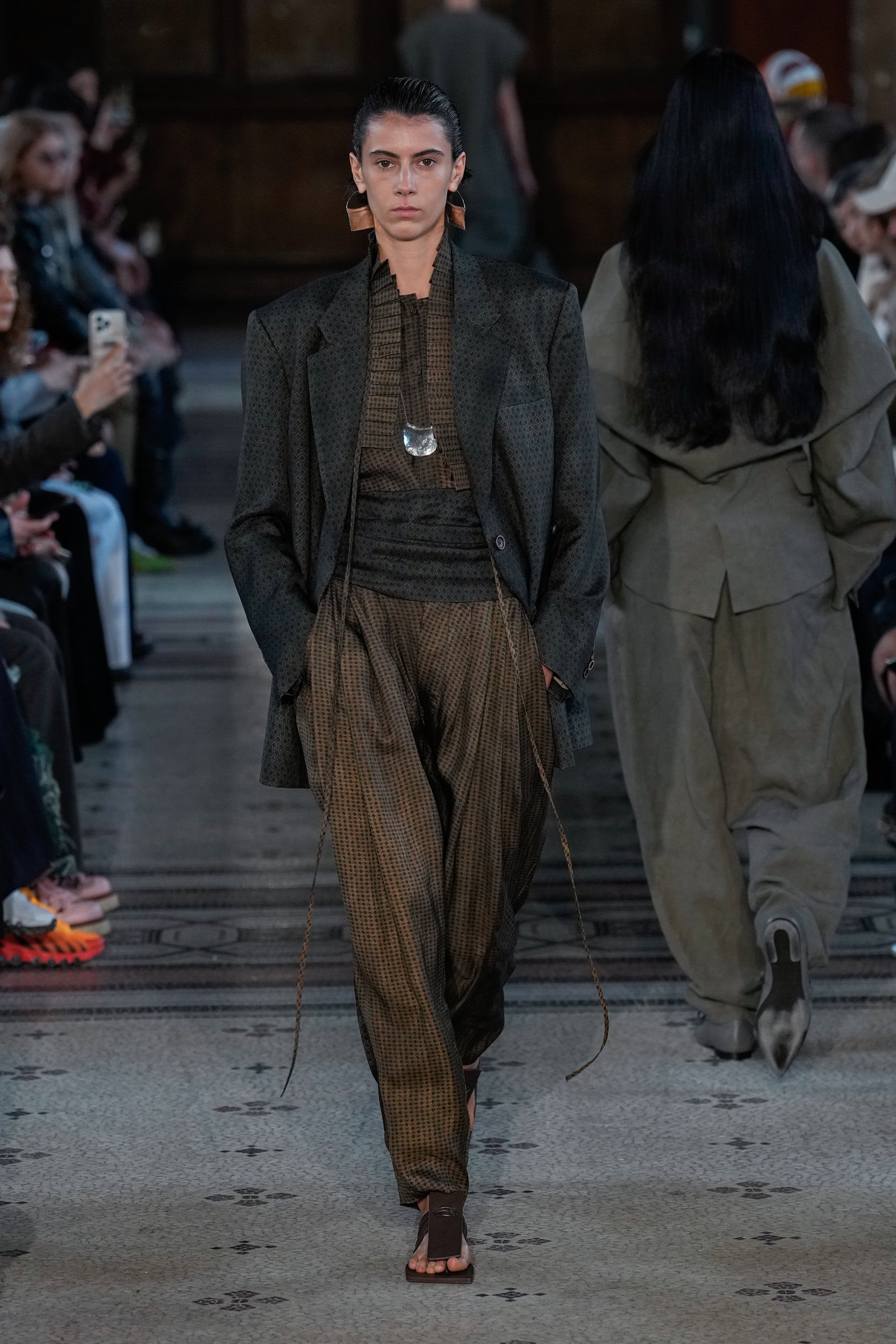 Uma Wang 还通过在单肩上衣上戏剧性地打结、做旧针织,以及正反两面刺绣来增强纹理效果。飘逸的青铜色连衣裙上点缀着深蓝色的簇绒,而从反面看,这其实是借用自千年前兴起的我们宋朝的花卉图案。水银色的丝绸和日本品牌 Detaj 的有机造型银饰,则为服装增添了一抹亮色。