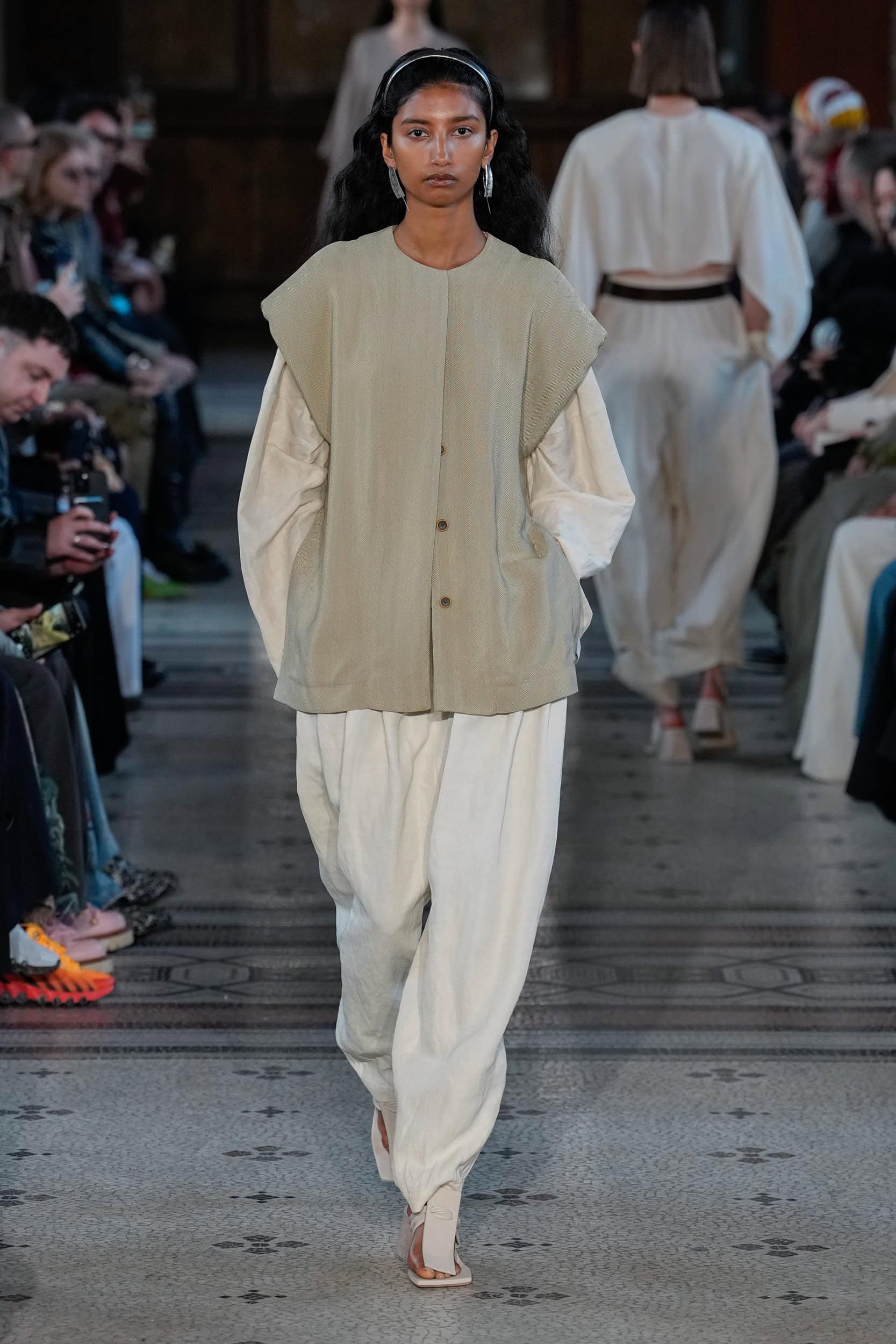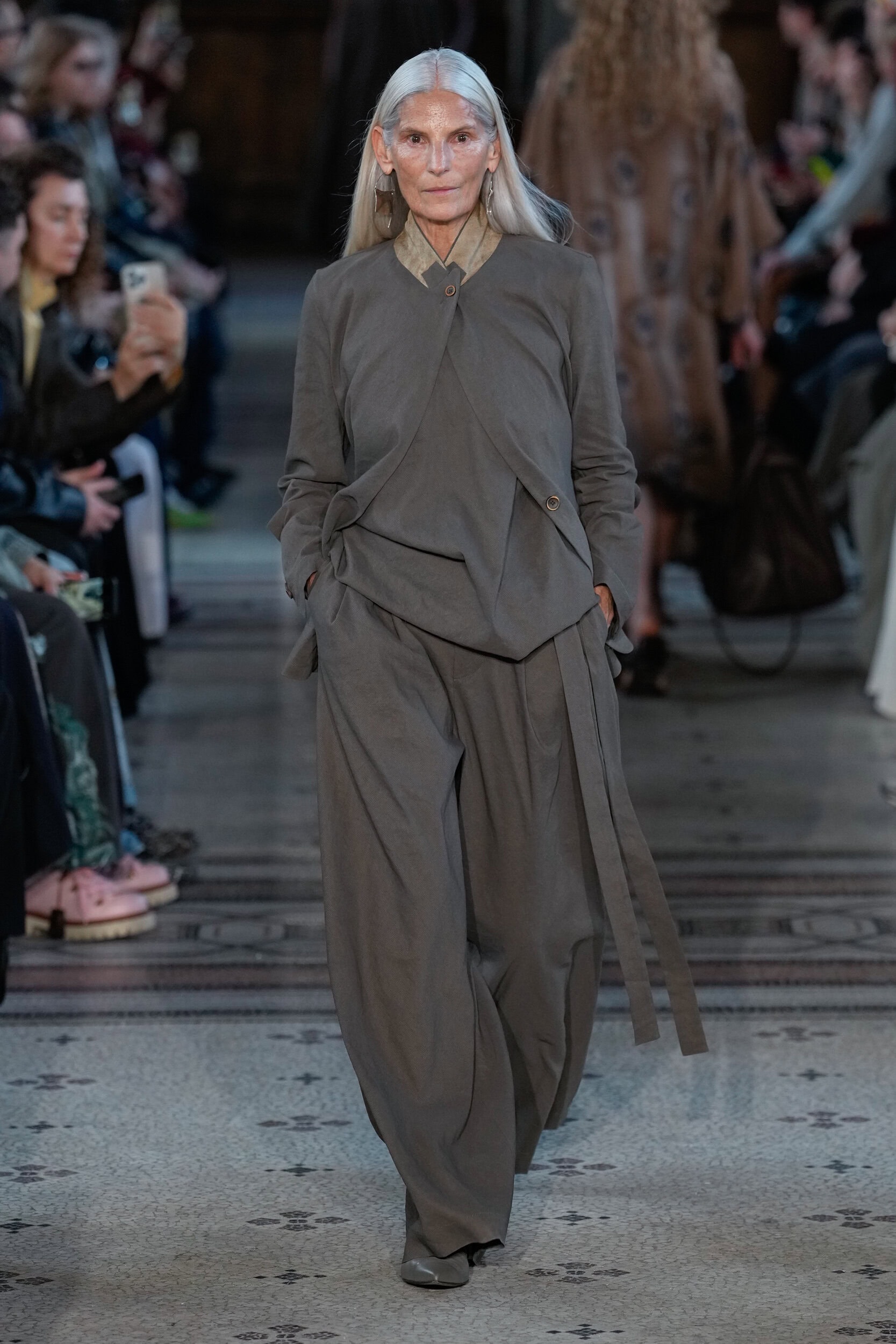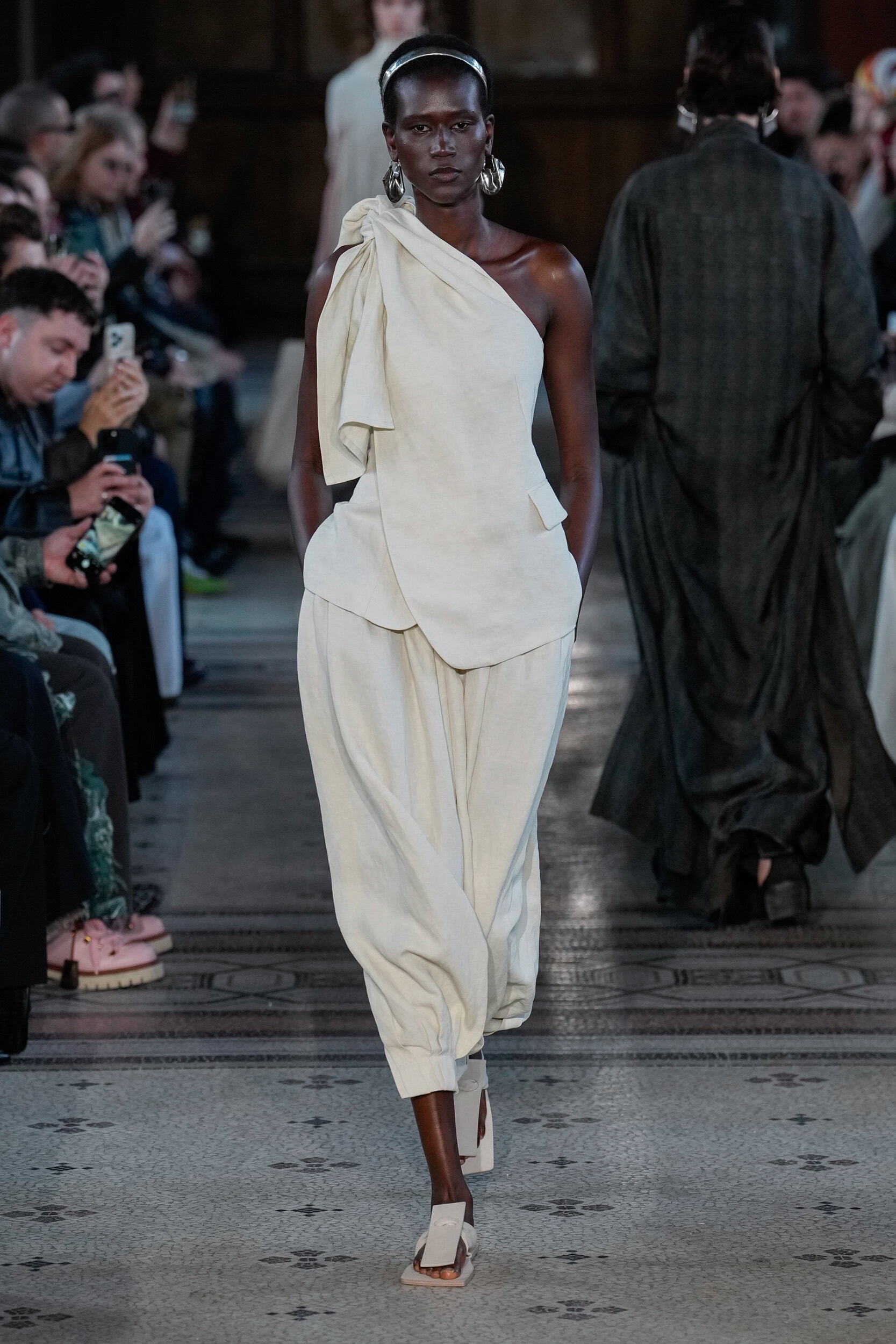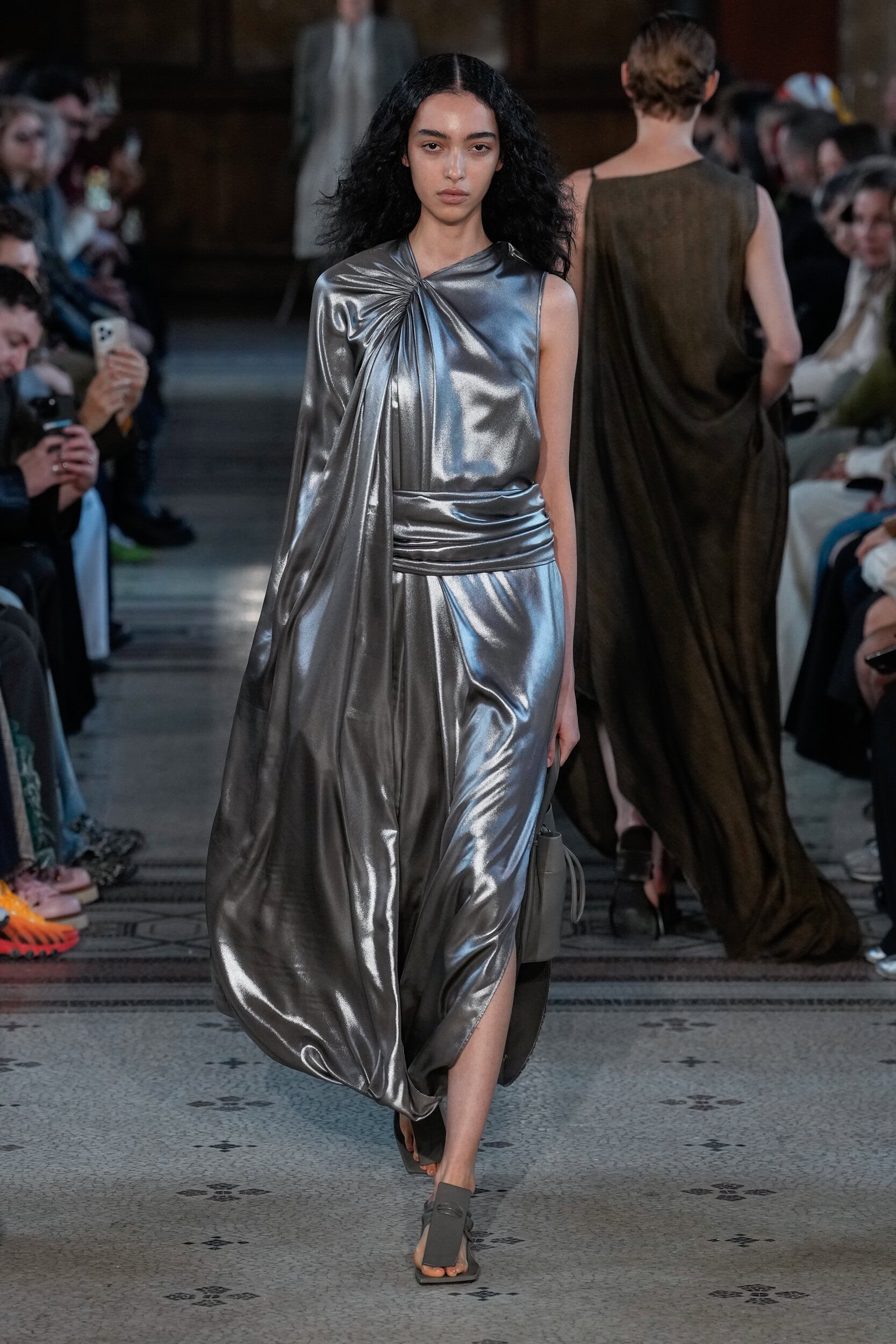 Uma Wang 还通过在单肩上衣上戏剧性地打结、做旧针织,以及正反两面刺绣来增强纹理效果。飘逸的青铜色连衣裙上点缀着深蓝色的簇绒,而从反面看,这其实是借用自千年前兴起的我们宋朝的花卉图案。水银色的丝绸和日本品牌 Detaj 的有机造型银饰,则为服装增添了一抹亮色。