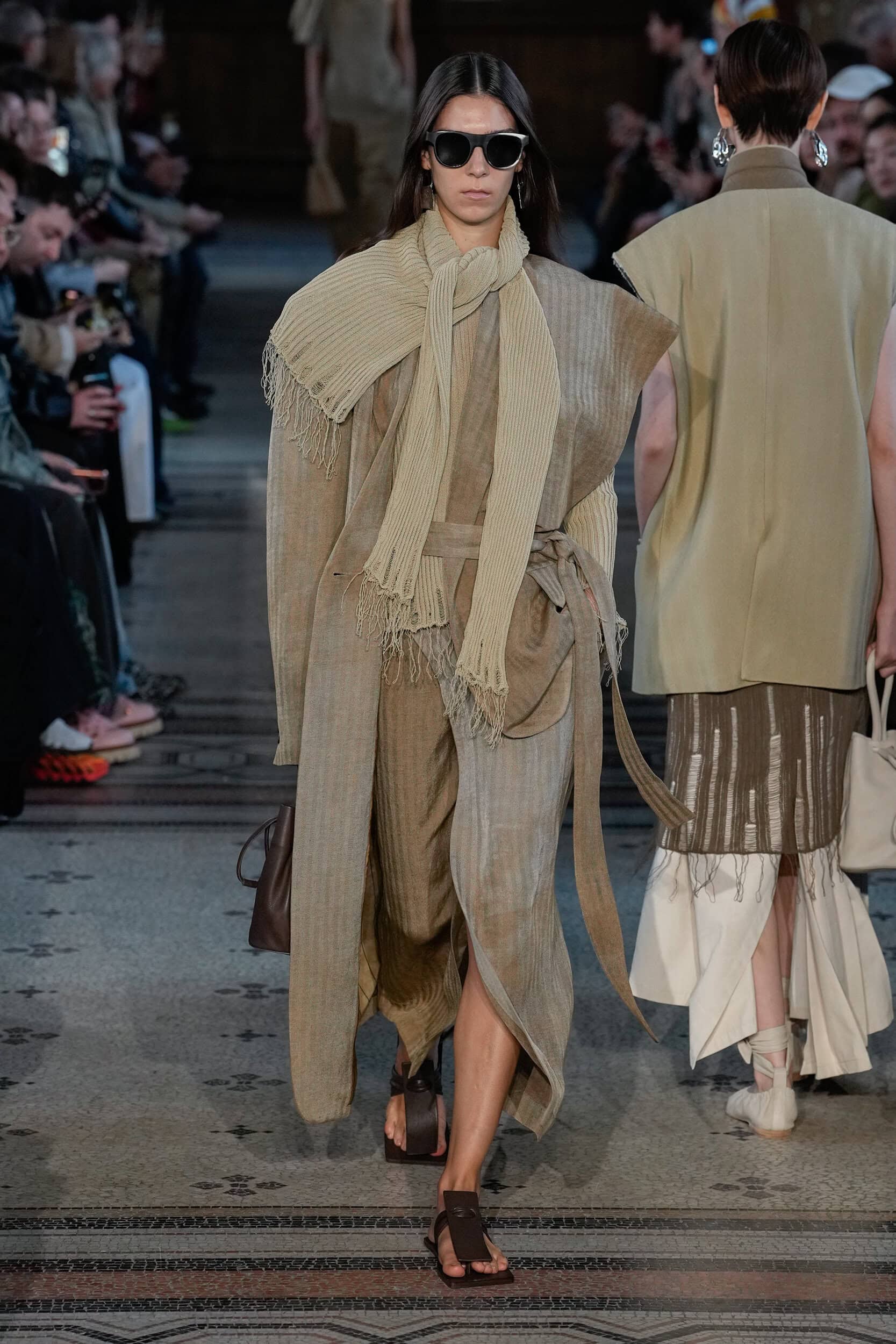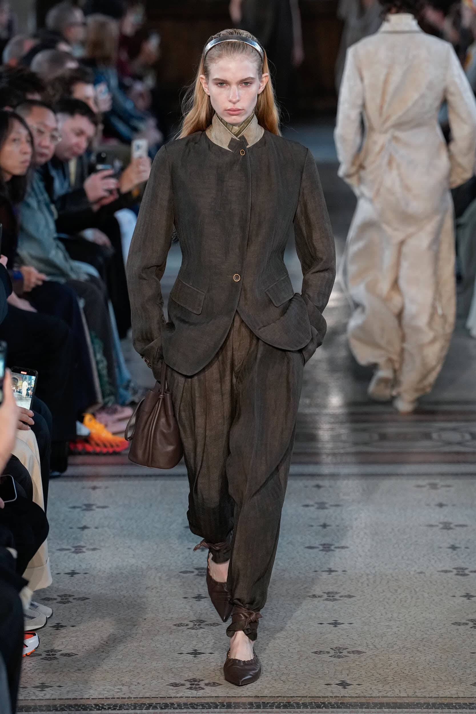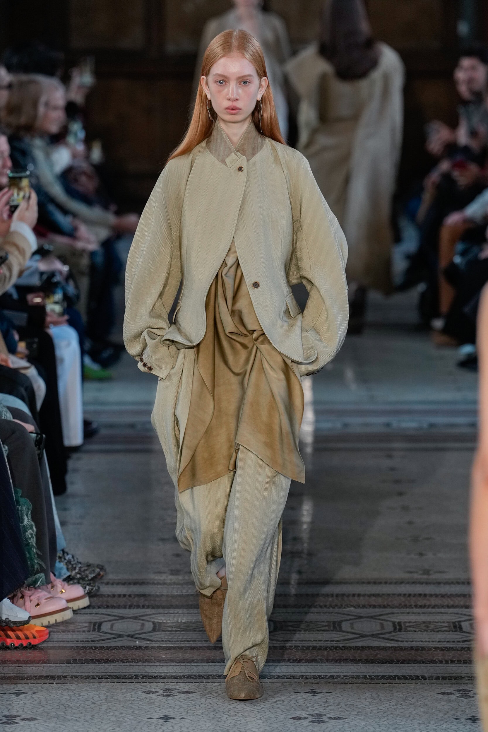 与上一季对比鲜明的是,本季采用轻松的剪裁和石灰岩、沙色、化石棕、无烟煤等温暖色调,缩减了体积,更为柔和与流畅。面料的处理借鉴了托斯卡纳的古老石头,呈现出历经风霜的质感:褶皱涂层夹克看似古老羊皮纸上的皱起;另一采用同色系奶油色提花面料的夹克光鲜亮丽,却又久经穿着。正面看似朴素的造型,背面却点缀以惊喜细节,优雅的扭纹、垂坠或镂空设计带来低调的「惊艳」。