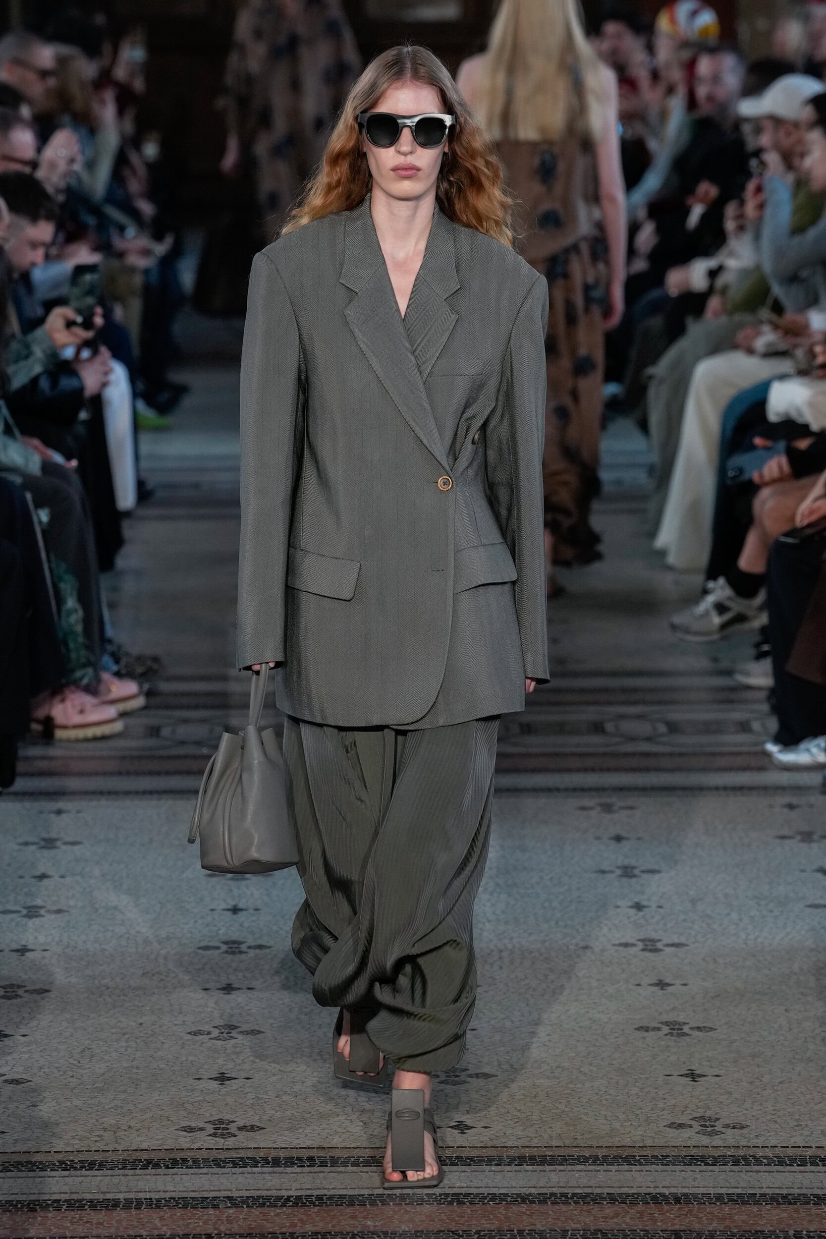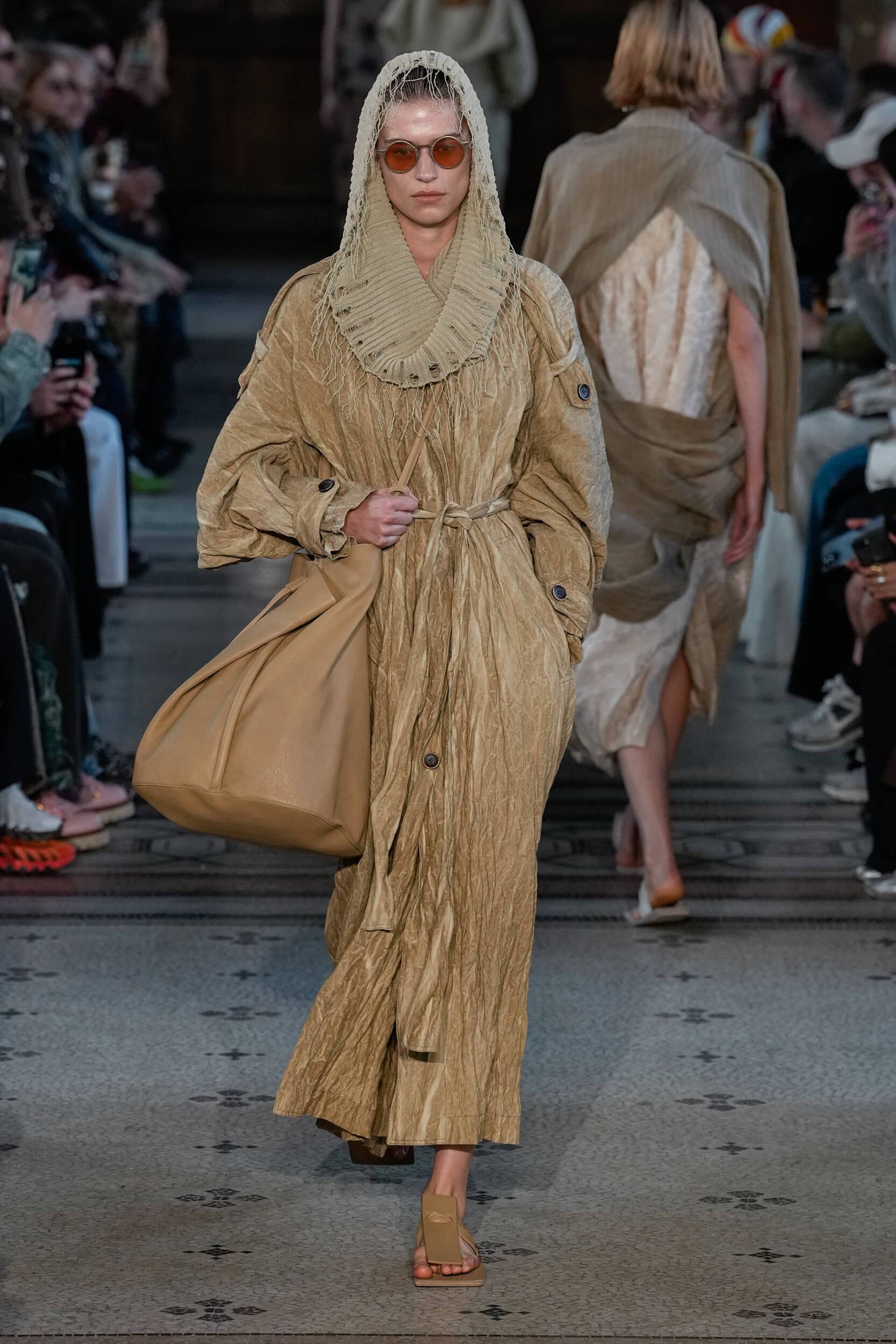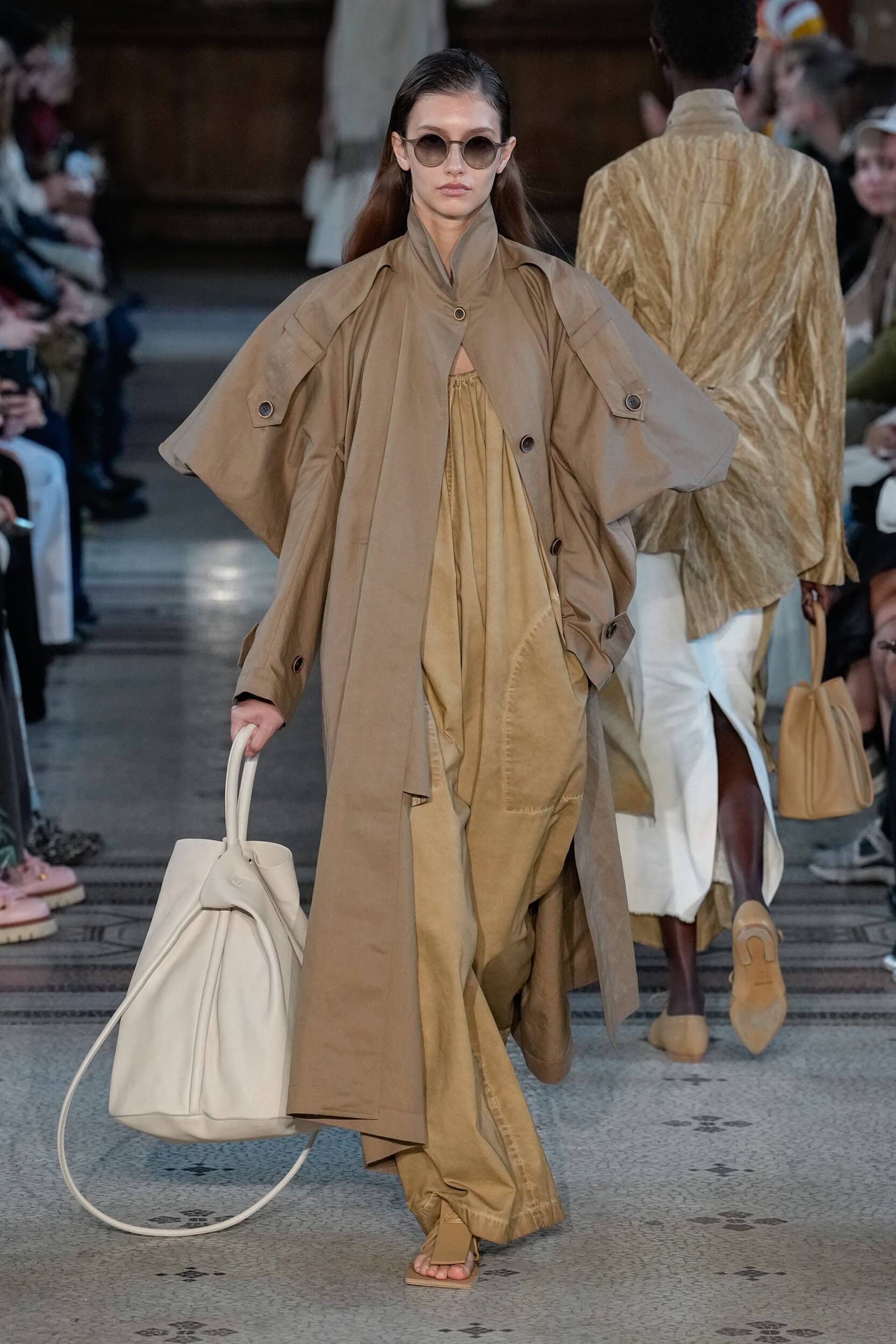 与上一季对比鲜明的是,本季采用轻松的剪裁和石灰岩、沙色、化石棕、无烟煤等温暖色调,缩减了体积,更为柔和与流畅。面料的处理借鉴了托斯卡纳的古老石头,呈现出历经风霜的质感:褶皱涂层夹克看似古老羊皮纸上的皱起;另一采用同色系奶油色提花面料的夹克光鲜亮丽,却又久经穿着。正面看似朴素的造型,背面却点缀以惊喜细节,优雅的扭纹、垂坠或镂空设计带来低调的「惊艳」。
