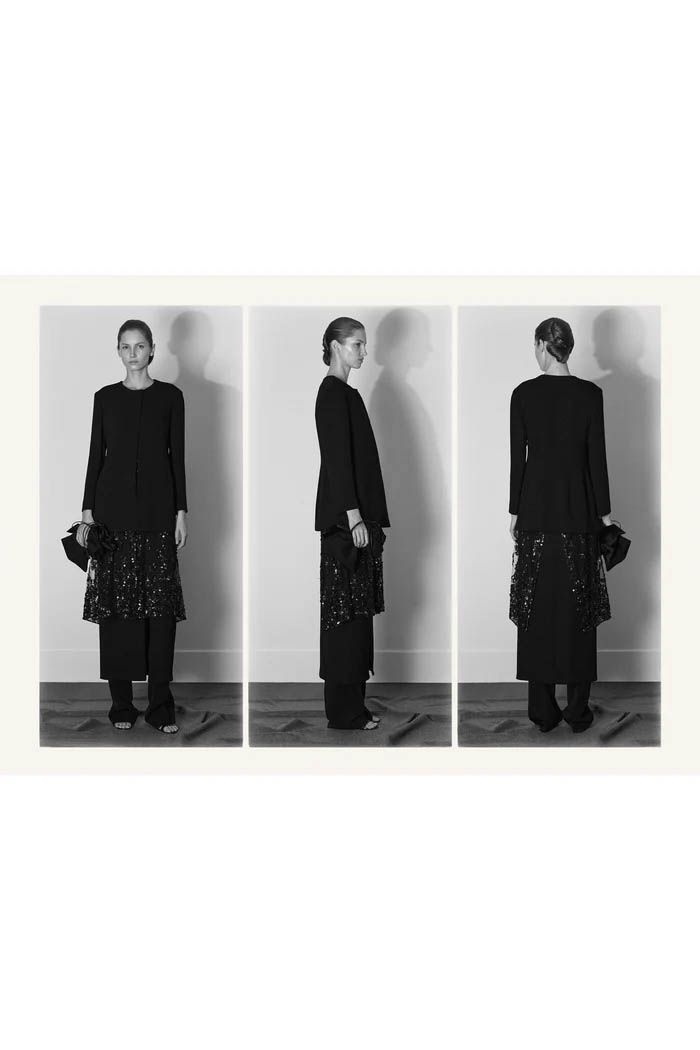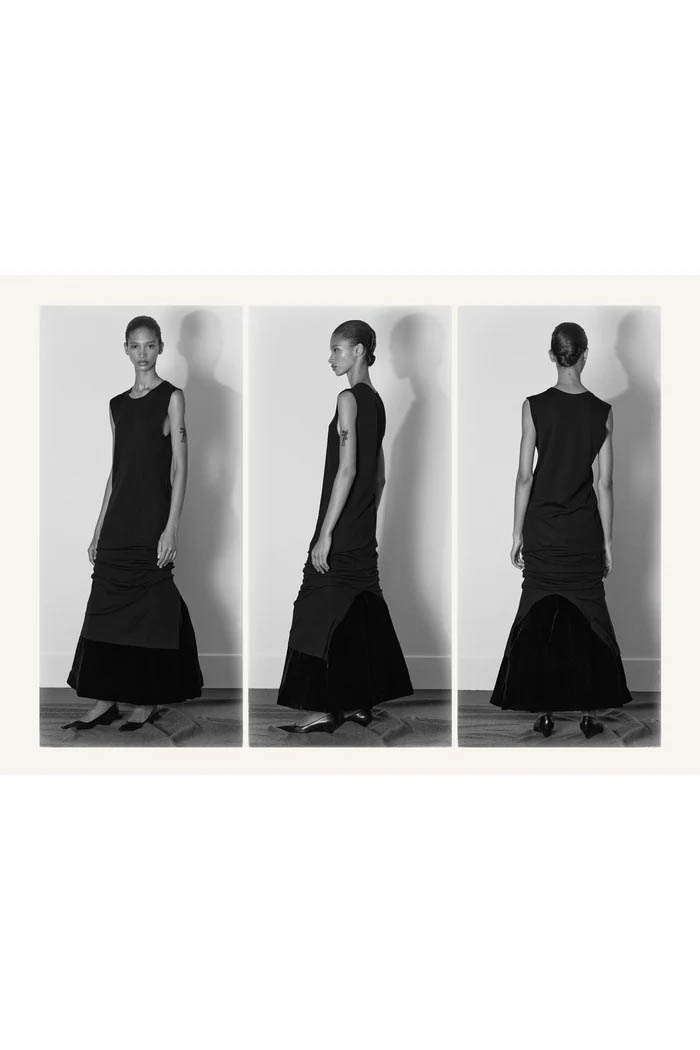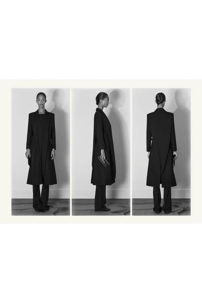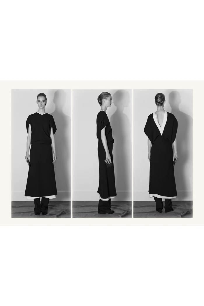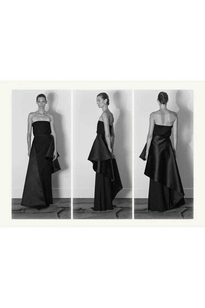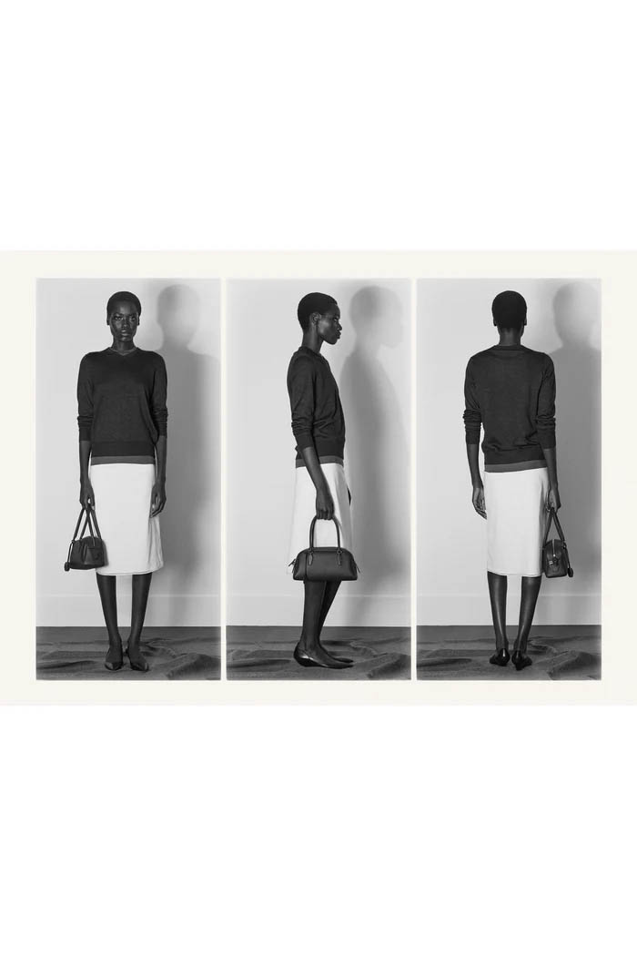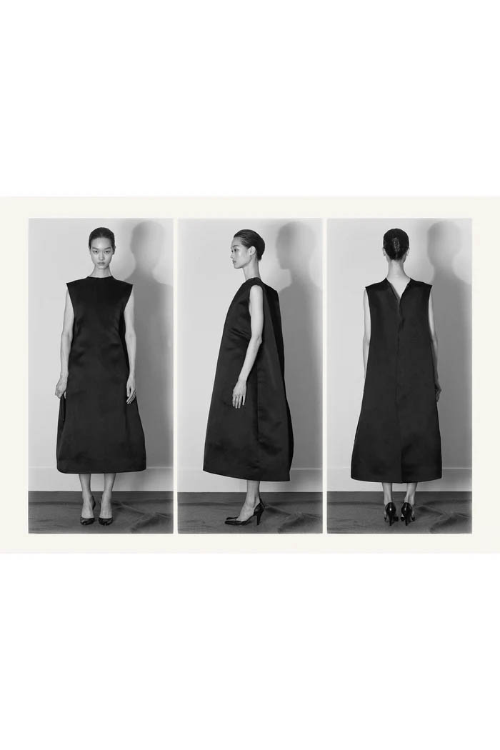 此外,设计师用一些双色元素打破单调,如黑色长裙前摆的奶油色裂缝,以及灰色针织衫搭配浅色缎面裙,带来些许现代感。这个系列坚持品牌的传统,以简约的设计和精致的工艺,体现了 The Row 一贯的奢华气质,也预示着这一风格将继续在高端时尚中占据重要位置。