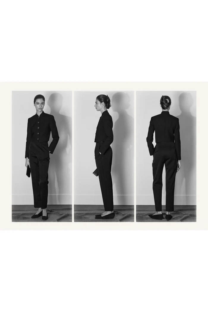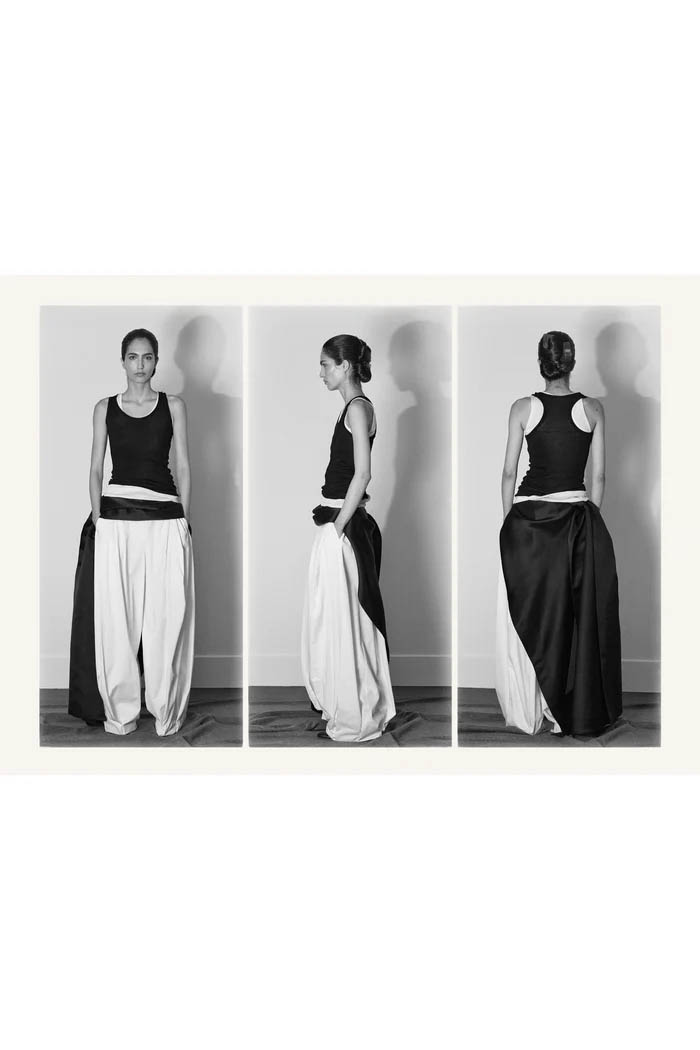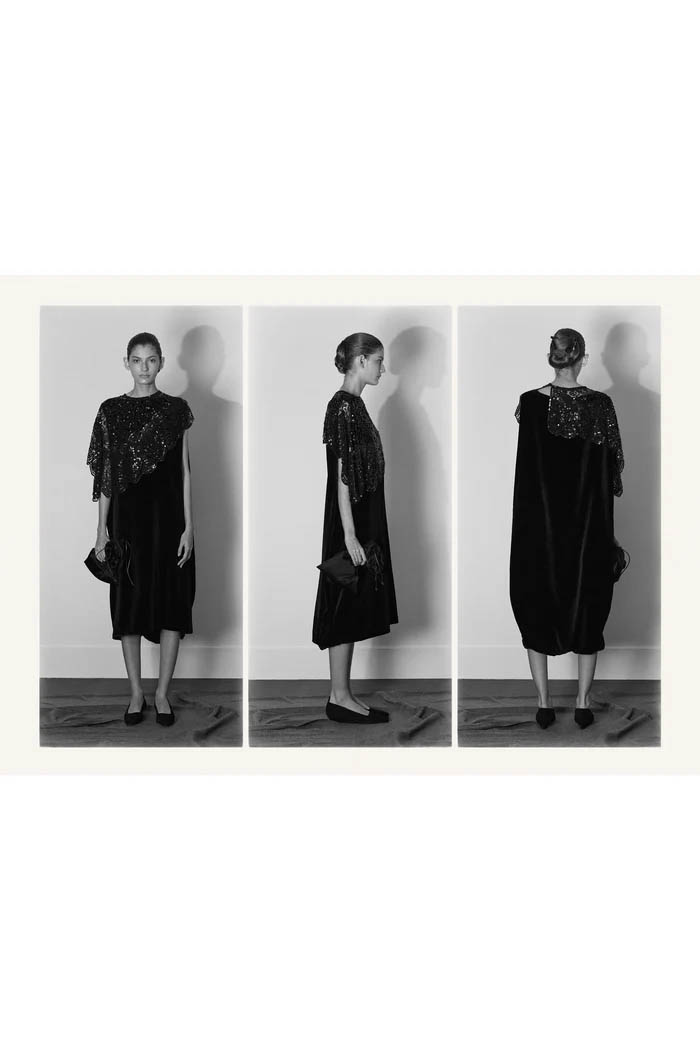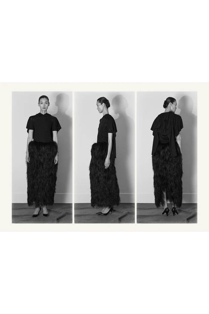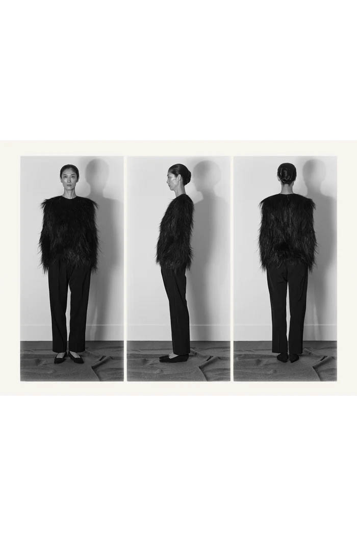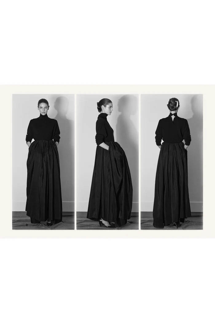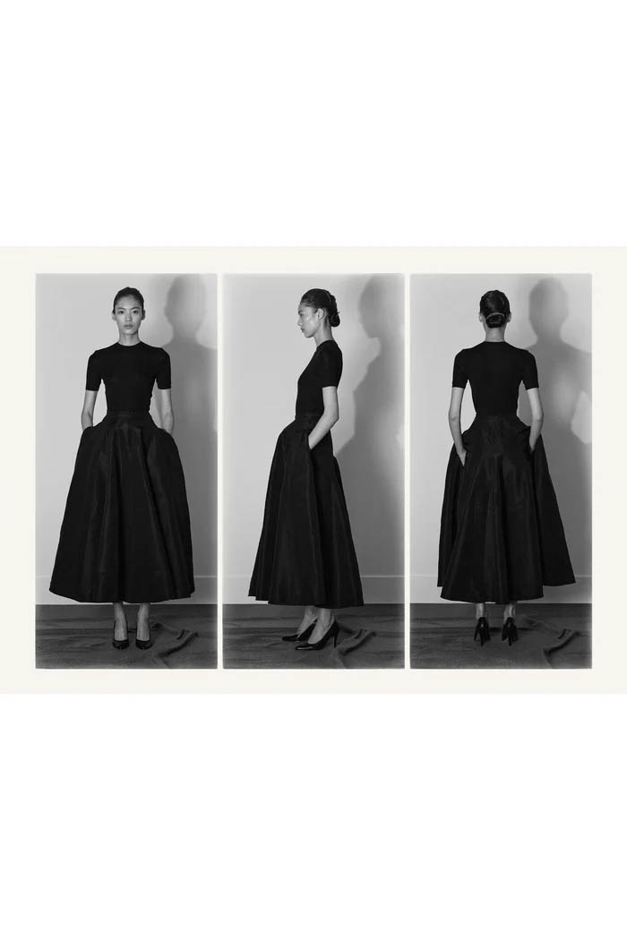 此外,设计师用一些双色元素打破单调,如黑色长裙前摆的奶油色裂缝,以及灰色针织衫搭配浅色缎面裙,带来些许现代感。这个系列坚持品牌的传统,以简约的设计和精致的工艺,体现了 The Row 一贯的奢华气质,也预示着这一风格将继续在高端时尚中占据重要位置。