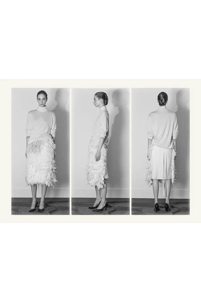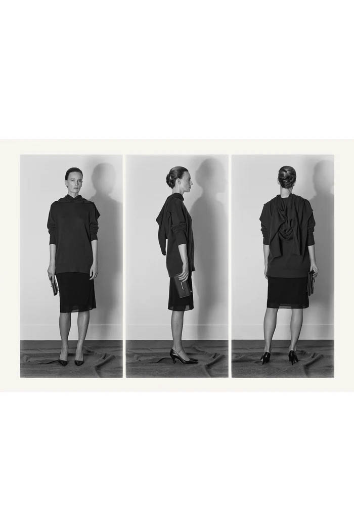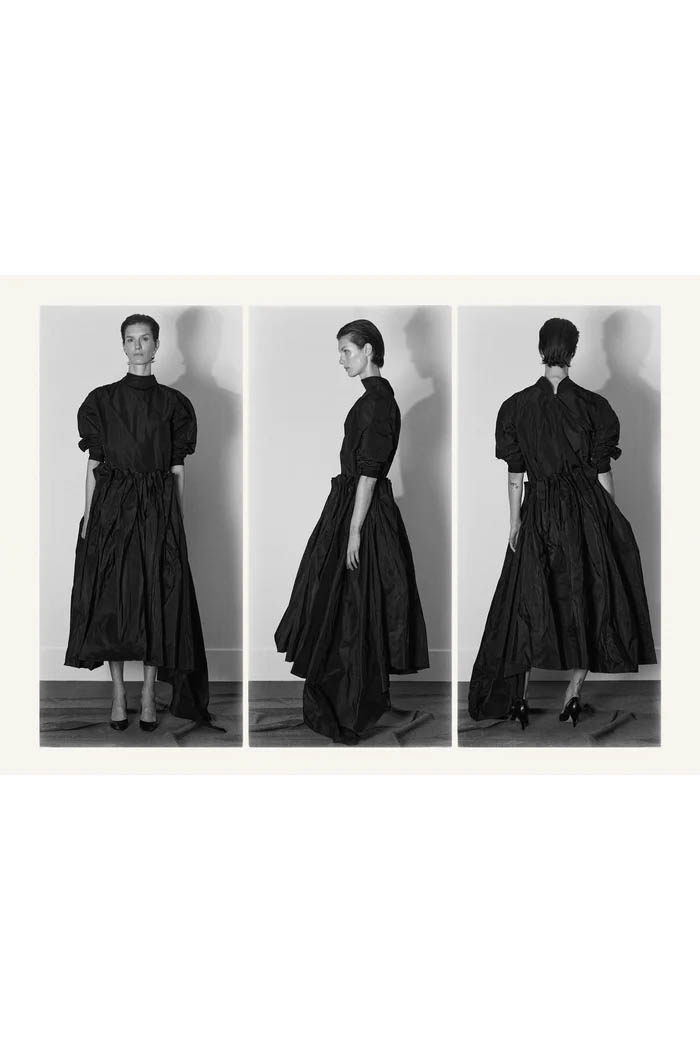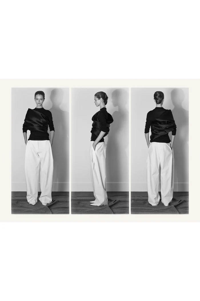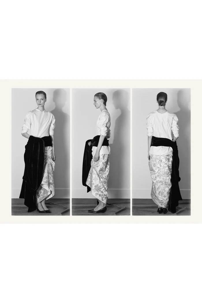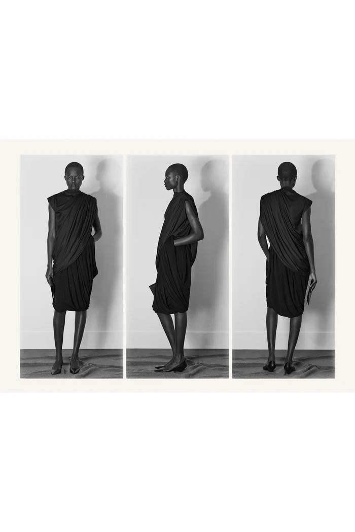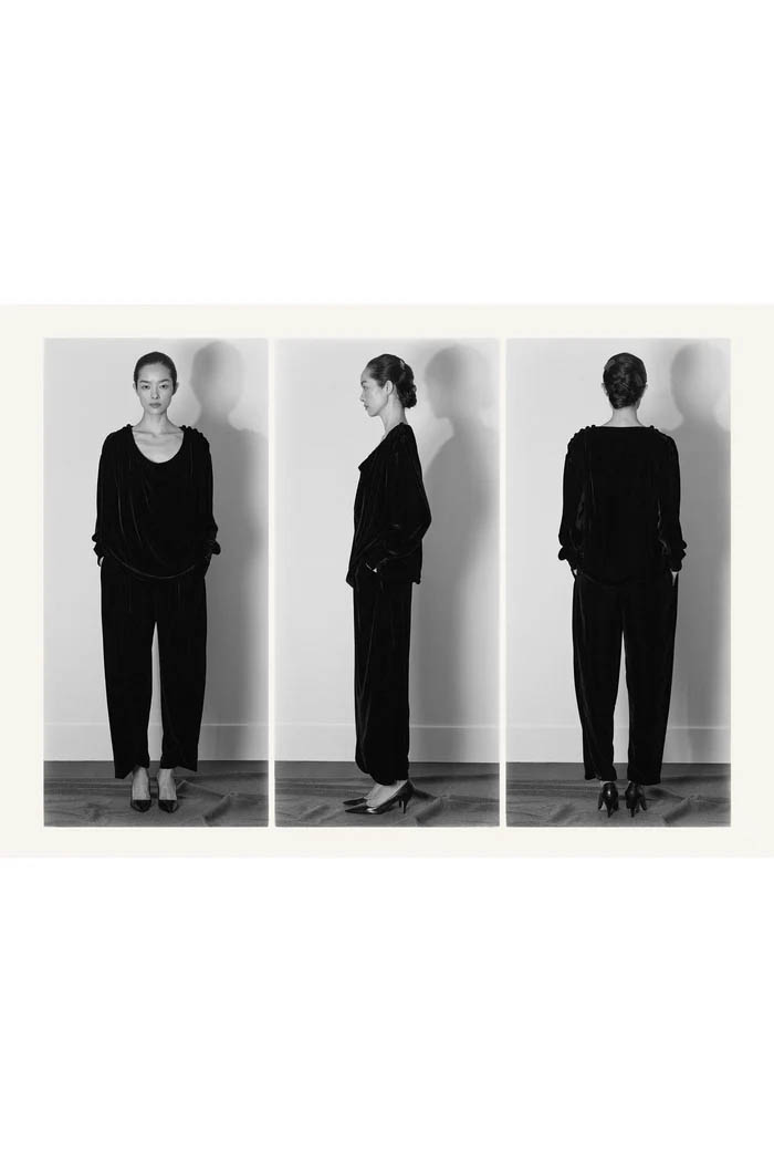 此外,设计师用一些双色元素打破单调,如黑色长裙前摆的奶油色裂缝,以及灰色针织衫搭配浅色缎面裙,带来些许现代感。这个系列坚持品牌的传统,以简约的设计和精致的工艺,体现了 The Row 一贯的奢华气质,也预示着这一风格将继续在高端时尚中占据重要位置。