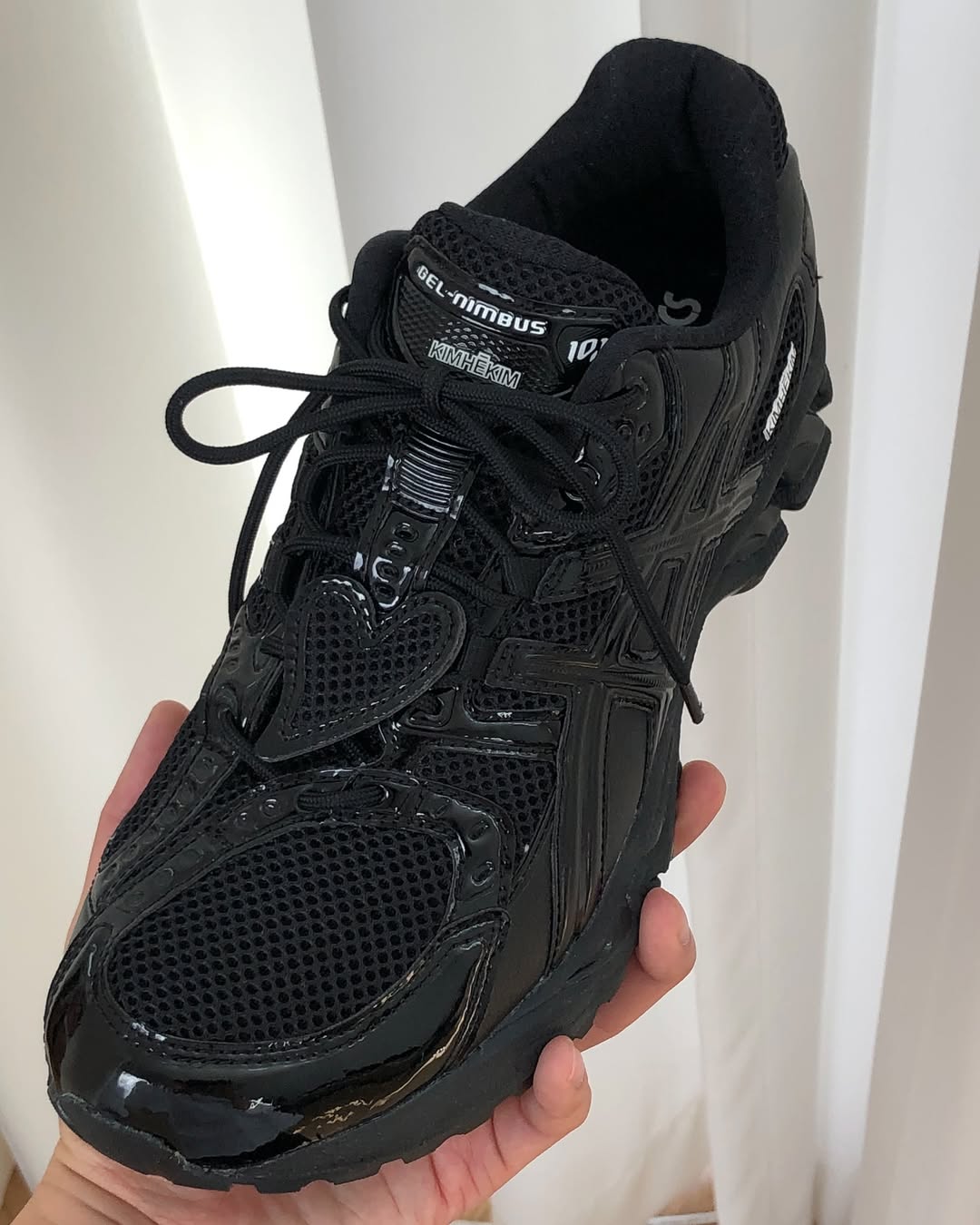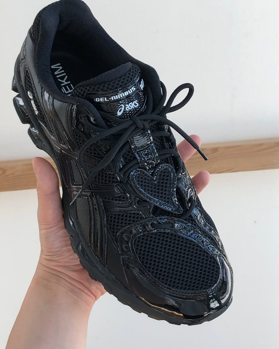 以超大蝴蝶结、街头与高定融合而闻名的韩国设计师品牌 KIMHĒKIM 与 ASICS 推出合作。双方联手打造的 GEL-Nimbus 10.1 跑鞋将 KIMHĒKIM 的浪漫与 ASICS 的高性能科技相融合。黑、白、灰三款配色最初在 KIMHĒKIM 2026 春夏系列秀上亮相,设计师代表性的心形图案醒目地印在每只鞋舌和鞋跟上。亮面漆皮覆层和网眼鞋面增添了质感和光泽,而 GEL 中底则确保了极致的舒适感。值得一提的是,KIMHĒKIM 即将推出的手袋、高跟鞋等产品上都印有相同的心形,这也是 KIMHĒKIM 首个 ASICS 合作系列的核心元素。