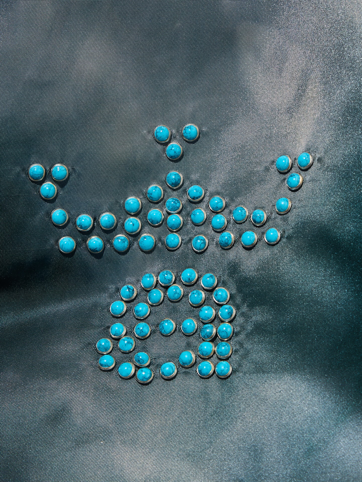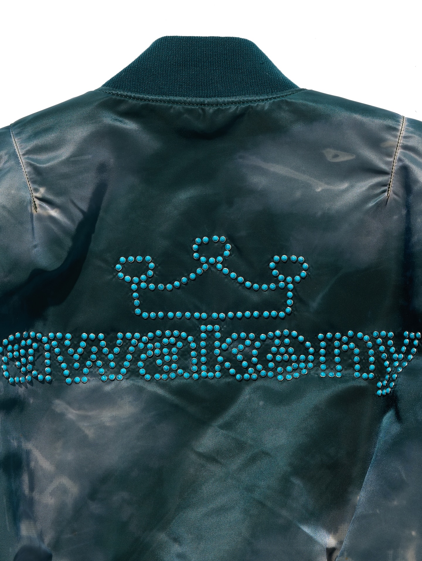 全新联名款以特别定制的蓝绿色过染尼龙面料打造,每件夹克均呈现独一无二的晕染质感。胸前与背后以手工镶嵌的青绿色铆钉拼出 Awake NY 王冠标志及品牌字样,呼应 1970 年代朋克风格的金属装饰,为夹克增添叛逆与自由的气息。
