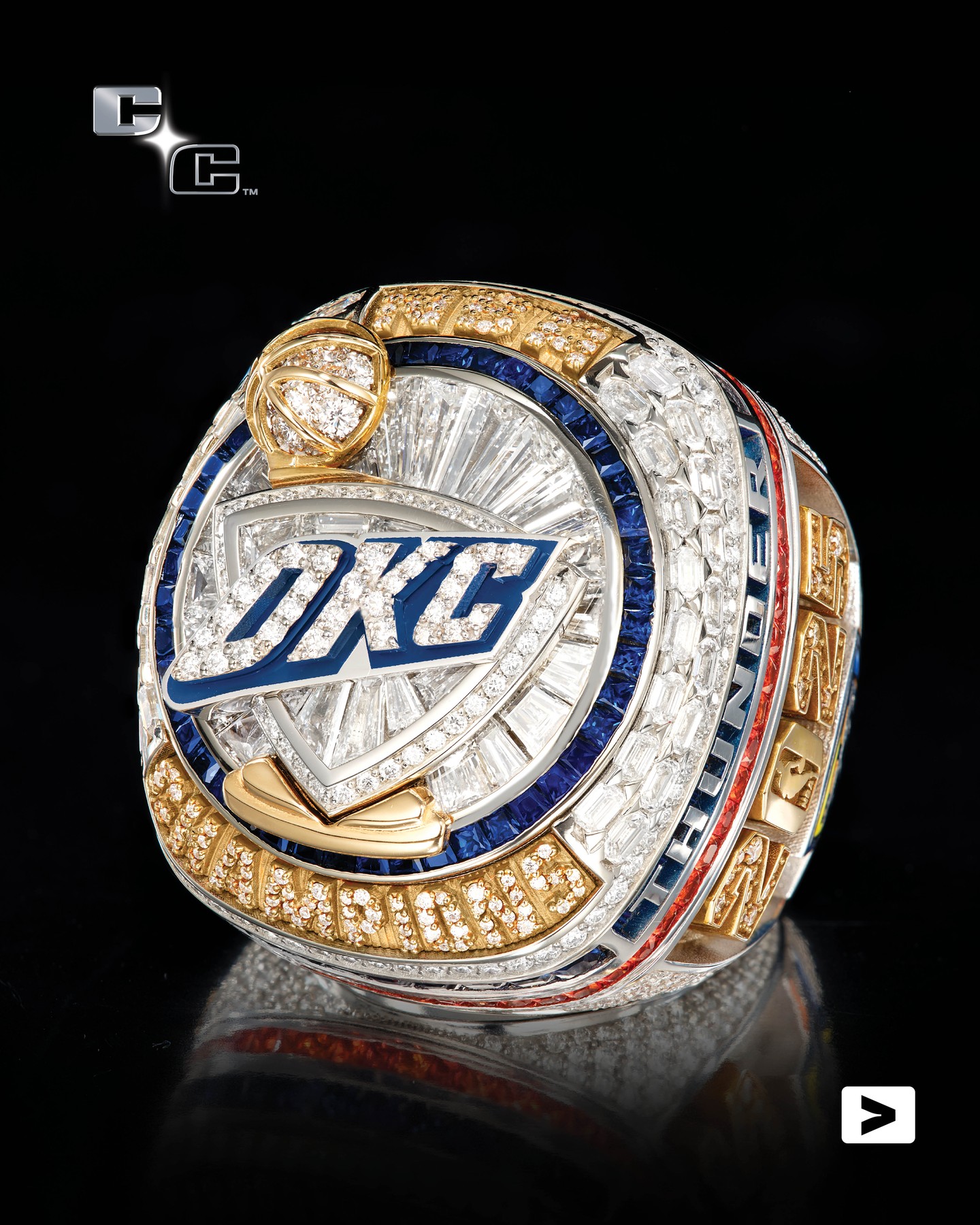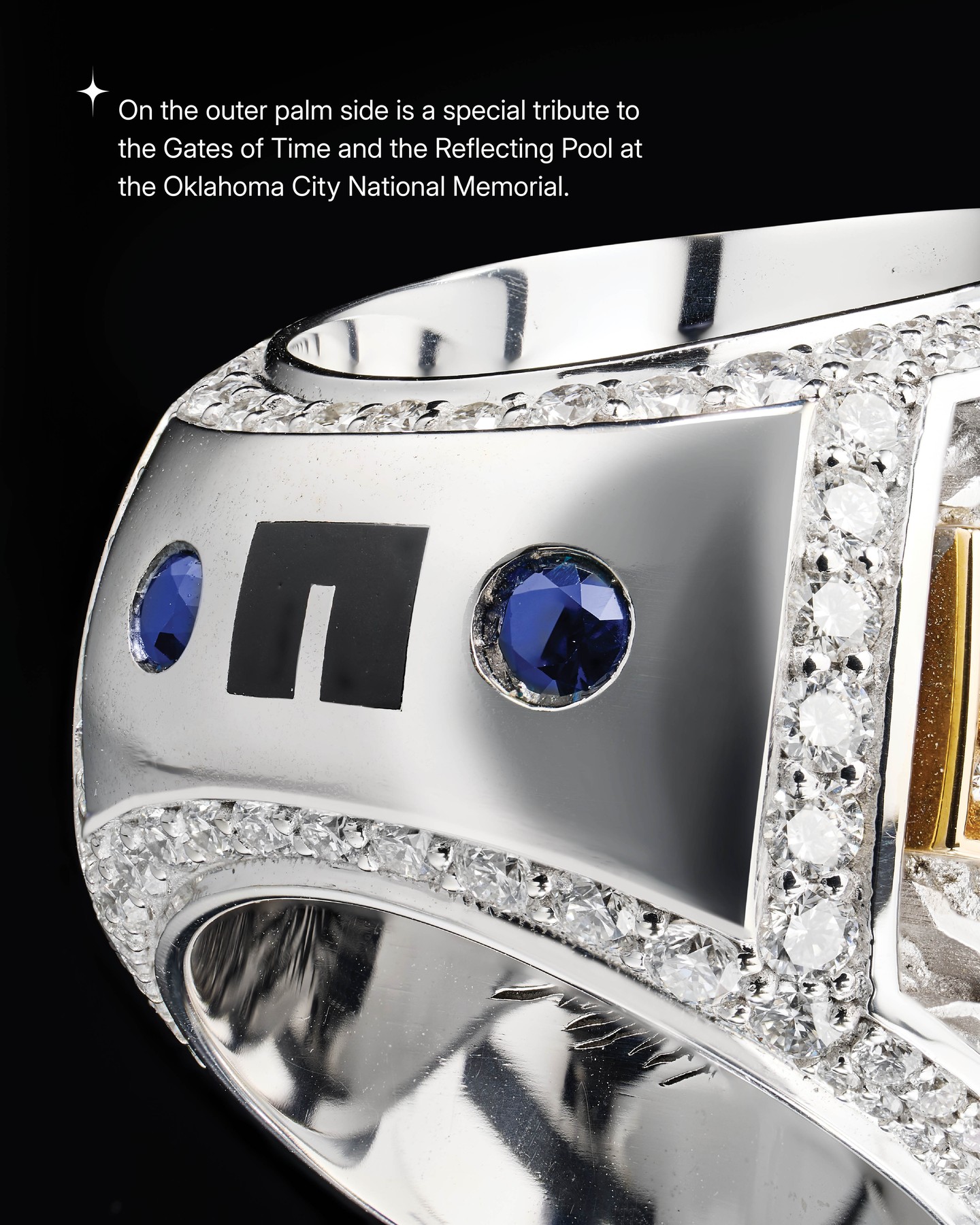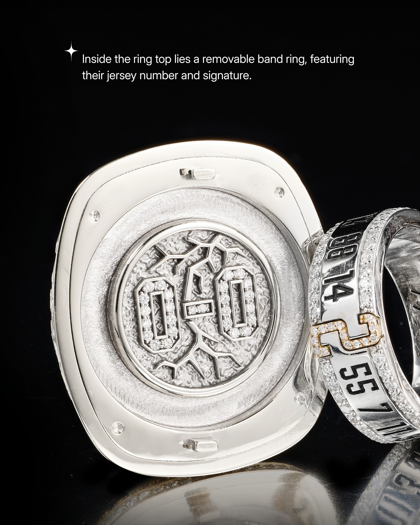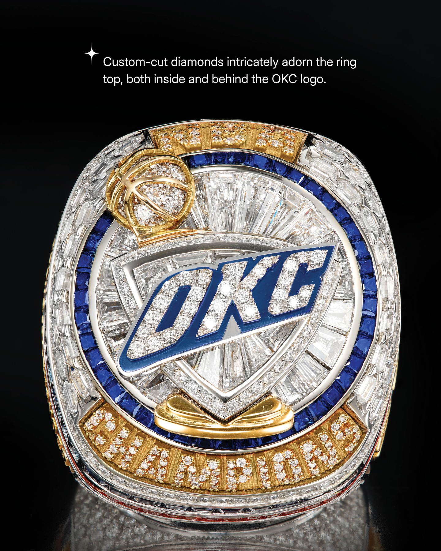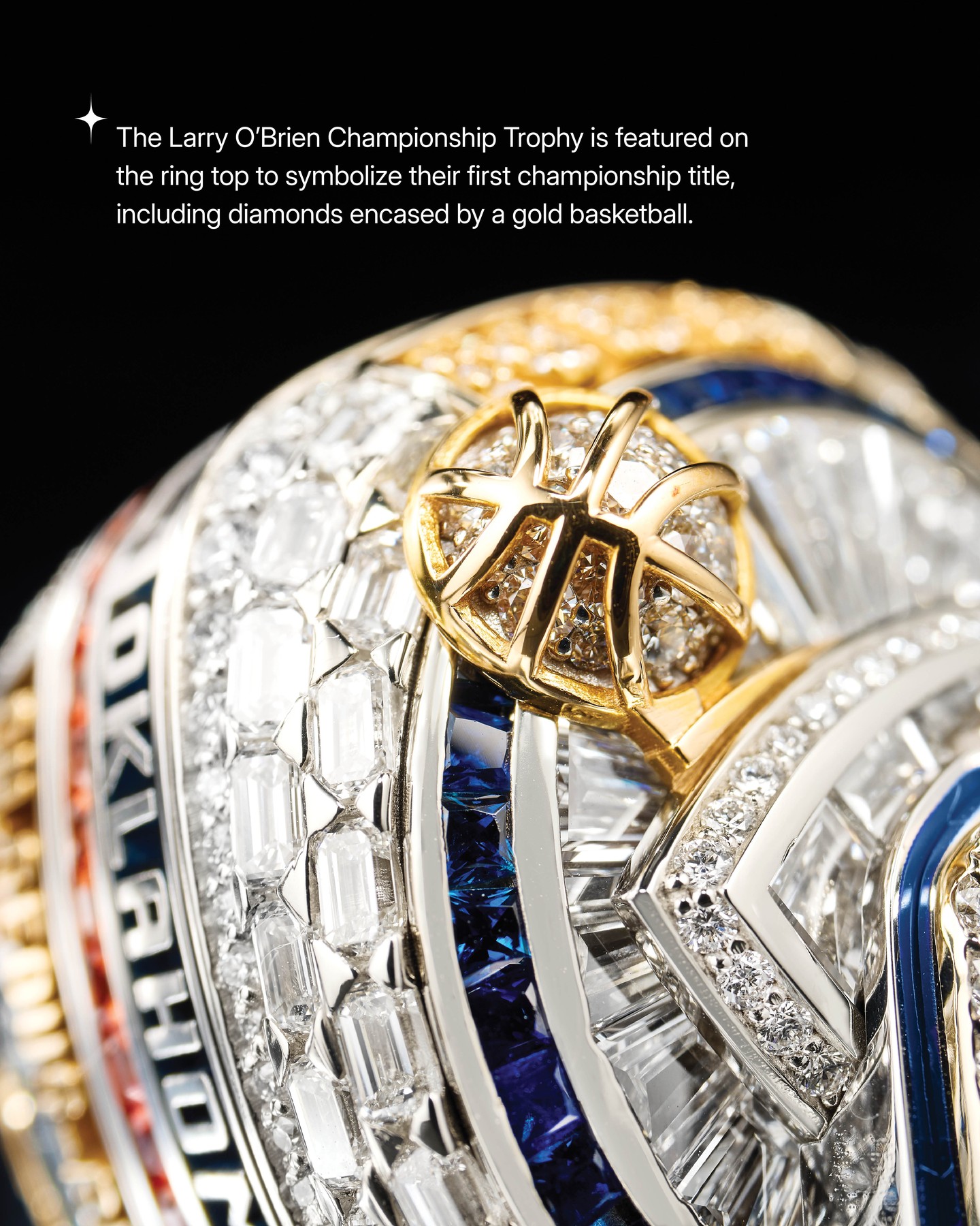 最具创新性的设计在于戒指顶部下方隐藏着一条可拆卸的内圈,方便球员将其作为一件配饰佩戴。内圈镌刻有球员的钻石球衣号码和签名。戒指侧面镶有雷霆队 68 胜 14 负的常规赛战绩,并镶嵌有 60 颗代表着球队色彩的橙、蓝宝石,使这枚冠军戒指成为一件兼具精湛工艺和故事感的杰作。