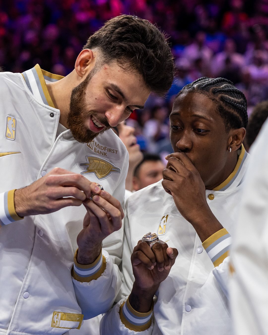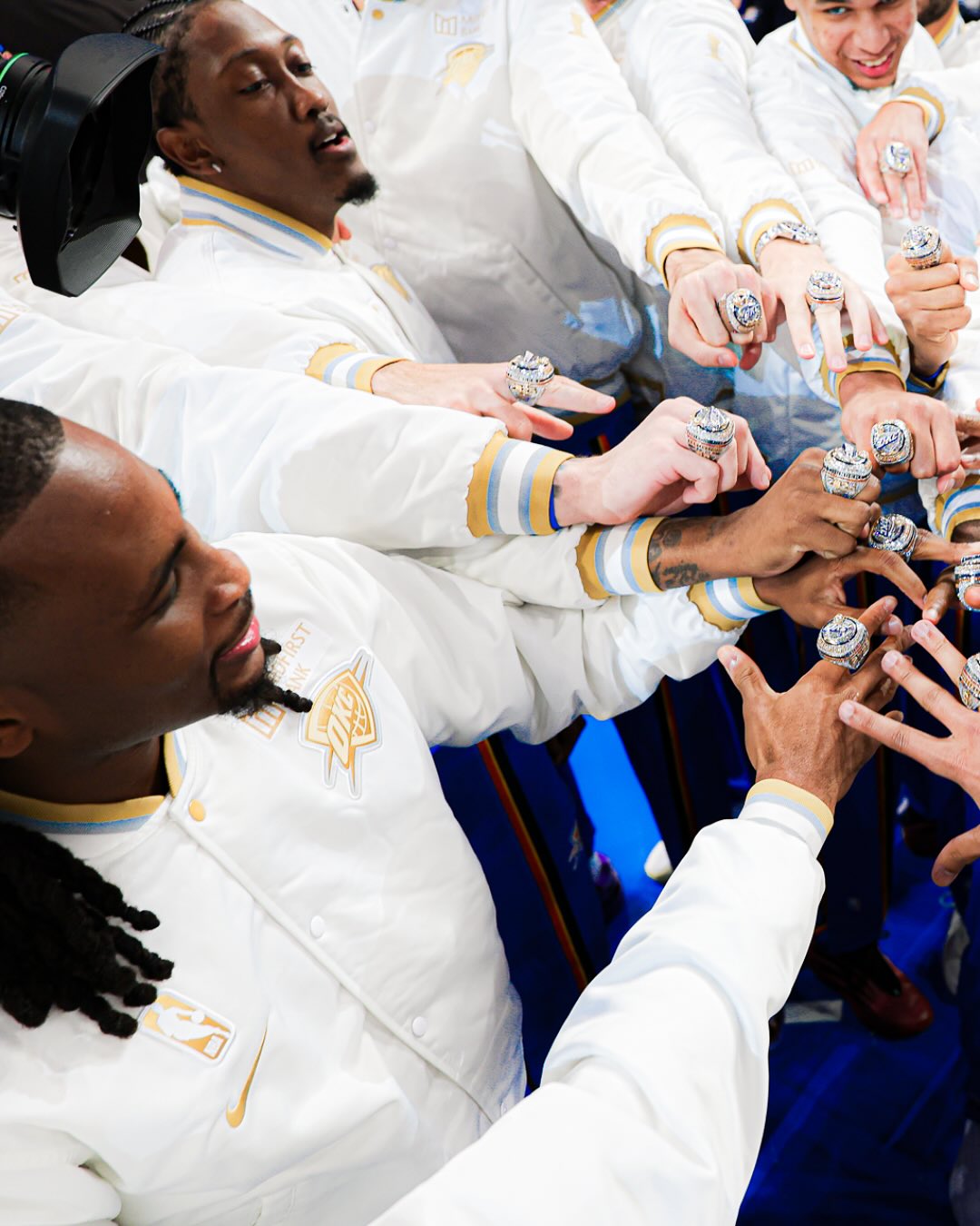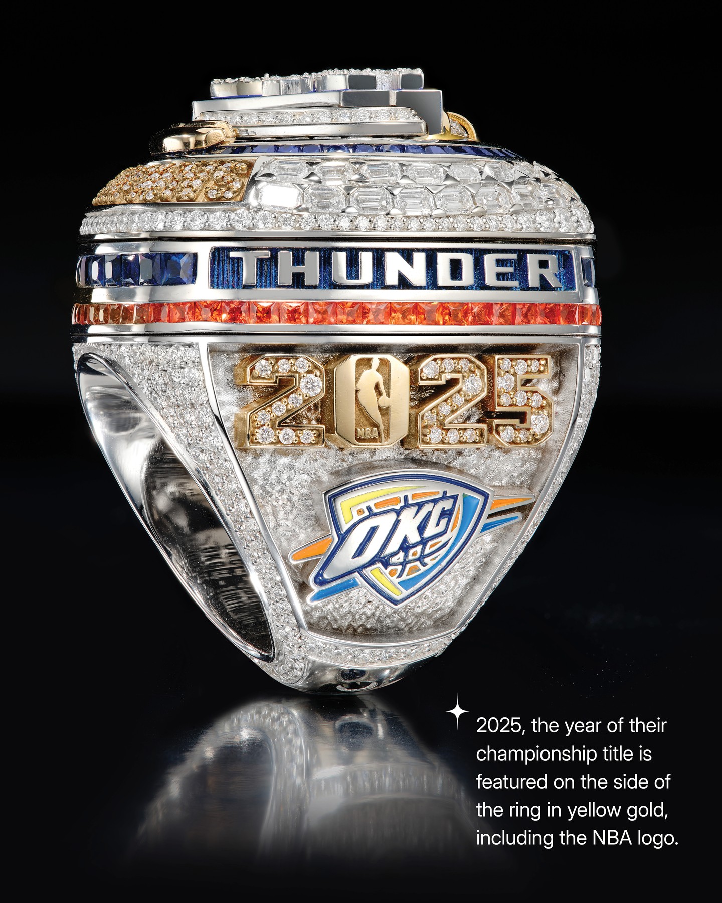 随着 NBA 新赛季的打响,上赛季总冠军俄克拉荷马城雷霆队在主场揭幕战之前,球员们领取了冠军戒指。戒指由 The Champions Collective 与知名珠宝商 Zo Frost 联手打造,采用 14K 白金和黄金,镶嵌着超过 800 颗定制切割、手工镶嵌的宝石,令人叹为观止。戒指正面刻有奥布莱恩奖杯和雷霆队对标,以璀璨钻石点缀。戒指边缘镶嵌 46 颗天然蓝宝石,外侧雕刻着俄克拉荷马城国家纪念碑上的时光之门和倒影池,增添了独特的当地风情。