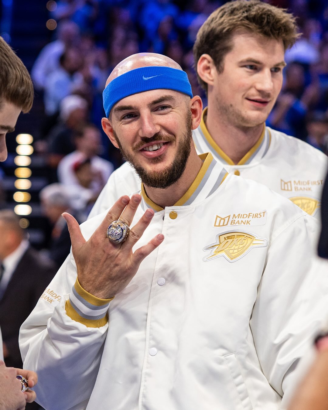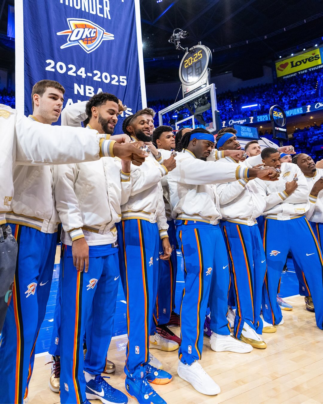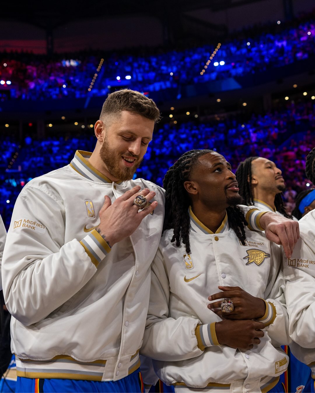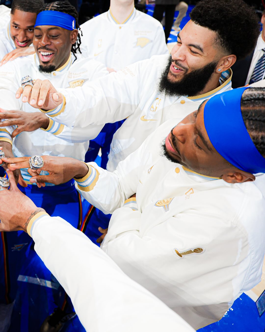 随着 NBA 新赛季的打响,上赛季总冠军俄克拉荷马城雷霆队在主场揭幕战之前,球员们领取了冠军戒指。戒指由 The Champions Collective 与知名珠宝商 Zo Frost 联手打造,采用 14K 白金和黄金,镶嵌着超过 800 颗定制切割、手工镶嵌的宝石,令人叹为观止。戒指正面刻有奥布莱恩奖杯和雷霆队对标,以璀璨钻石点缀。戒指边缘镶嵌 46 颗天然蓝宝石,外侧雕刻着俄克拉荷马城国家纪念碑上的时光之门和倒影池,增添了独特的当地风情。