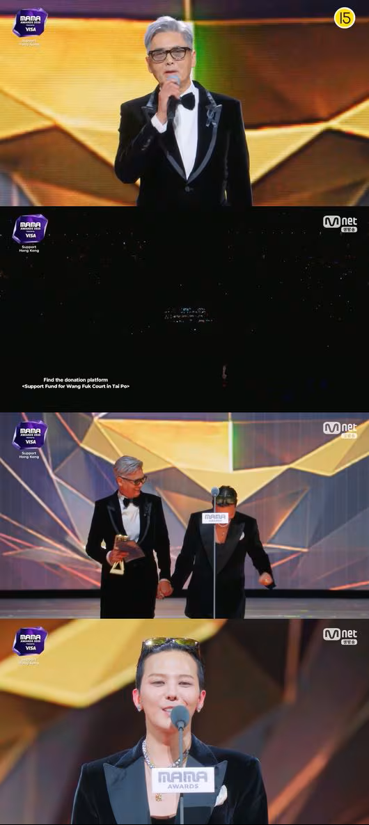 在香港启德体育场举行的 2025 MAMA颁奖典礼上,周润发作为 VISA 年度艺人奖的颁奖嘉宾,在宣布获奖名单前,带领全场观众为香港火灾悲剧的遇难者默哀。周润发说:「在宣布获奖者之前,我有一个小小的请求。我恳请大家与香港大埔的居民们站在一起,表达我们真挚的支持。让我们默哀片刻,悼念在火灾中丧生的人们。」
