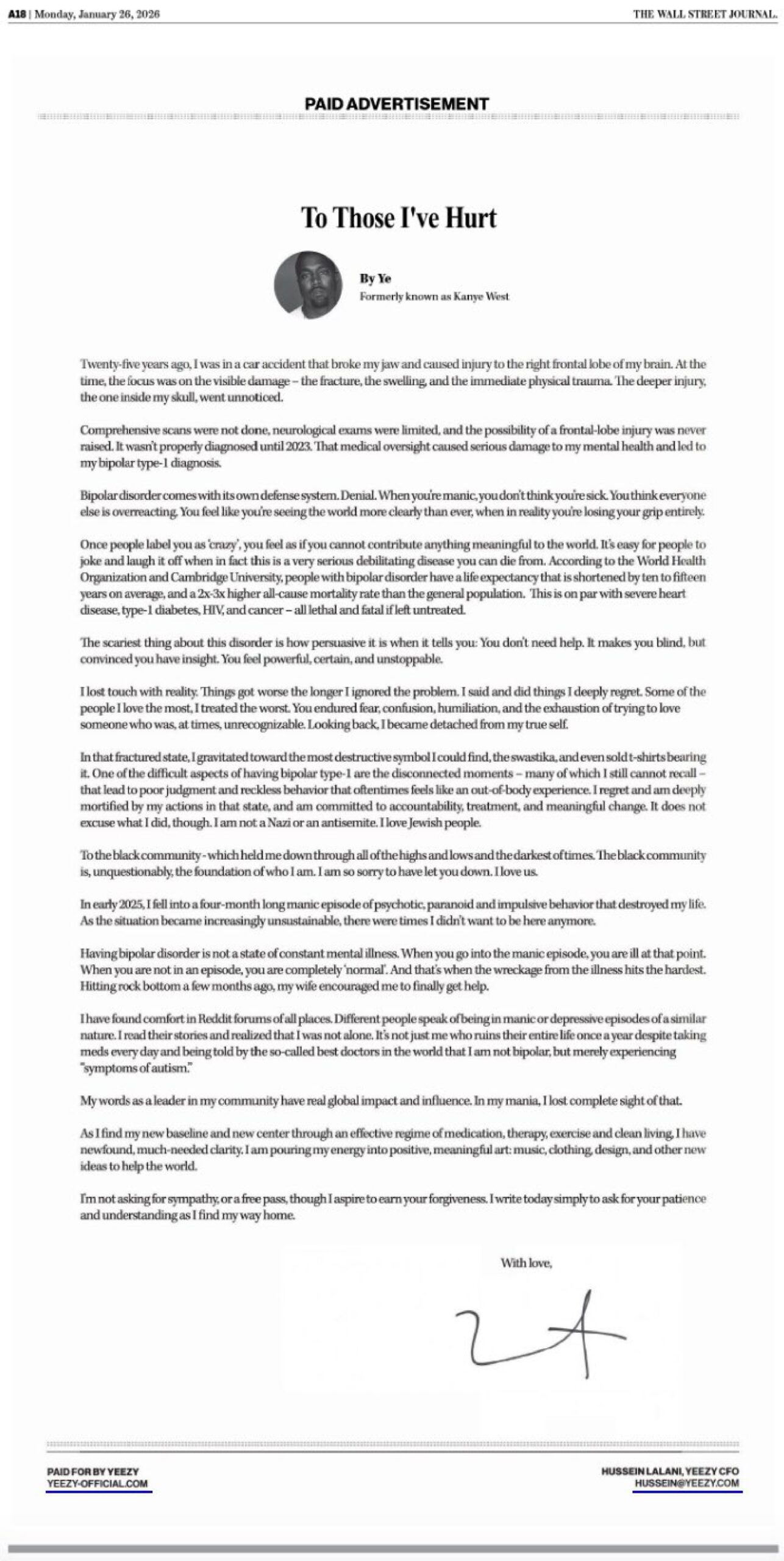 Ye 在周一《华尔街日报》印刷版的一整版广告页中表示为自己过去发表的反犹太言论道歉,并坦言他的大脑右侧额叶在 25 年前的一场车祸中受伤,导致他患有双相情感障碍,直到 2023 年才得到正确诊断。