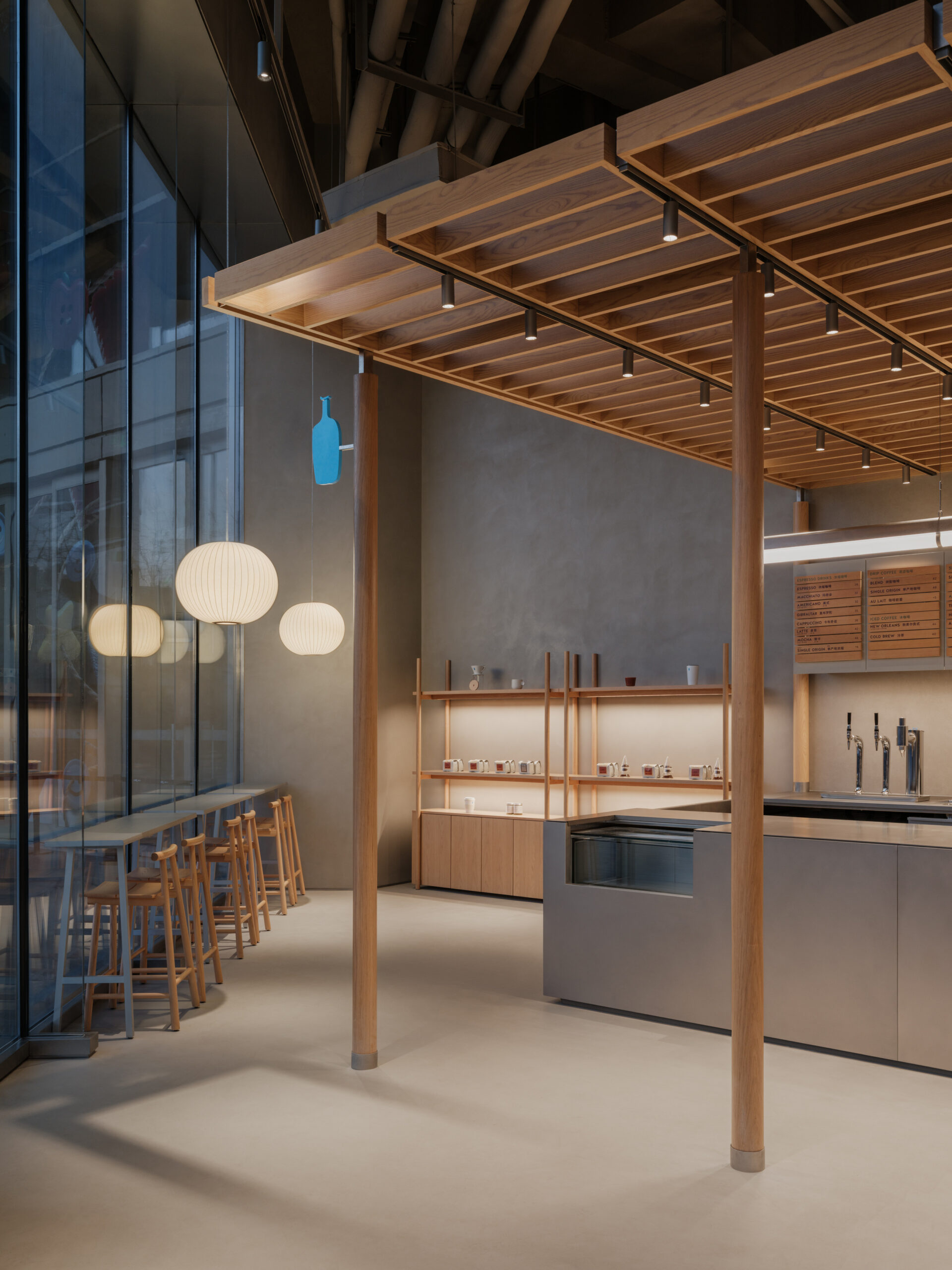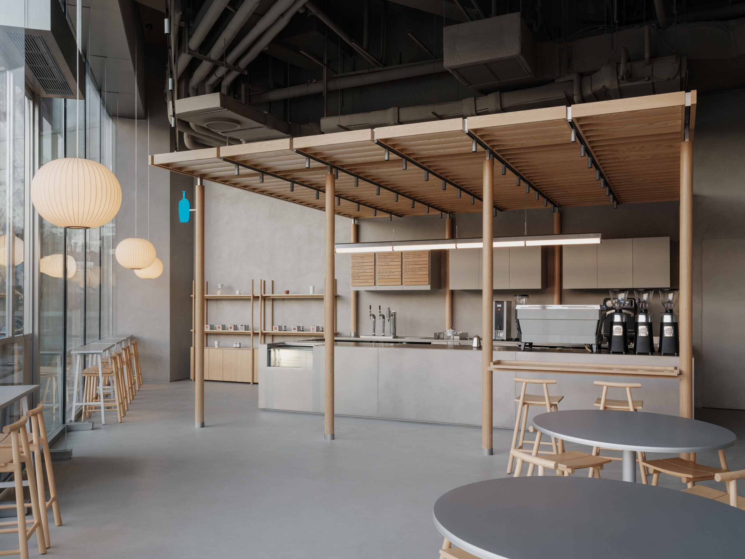 作为蓝瓶咖啡一种全新门店概念,强调功能性及互动的空间以简洁形式呈现,强化门店里咖啡吧台的中心位置。在这里,吧台不只是操作台面,而是承载点单、冲煮与咖啡分享的场所。咖啡的制作过程被完整地保留在视线之中,也给予咖啡爱好者更多与蓝瓶咖啡师的交流空间。