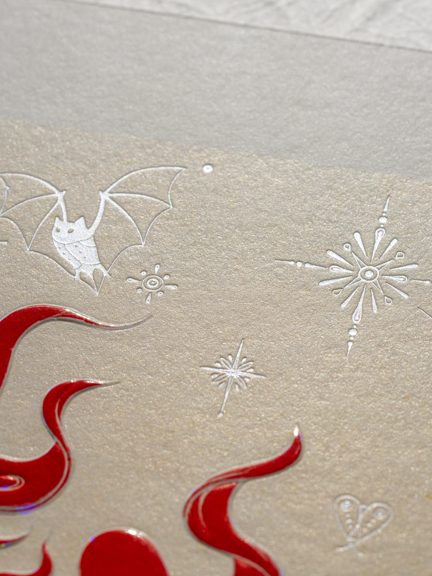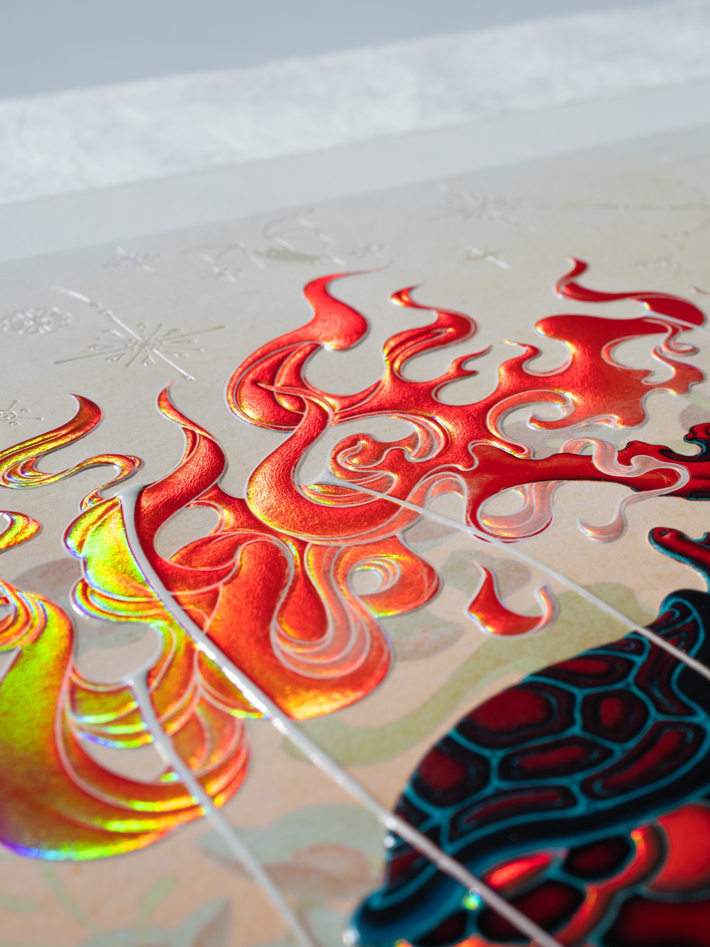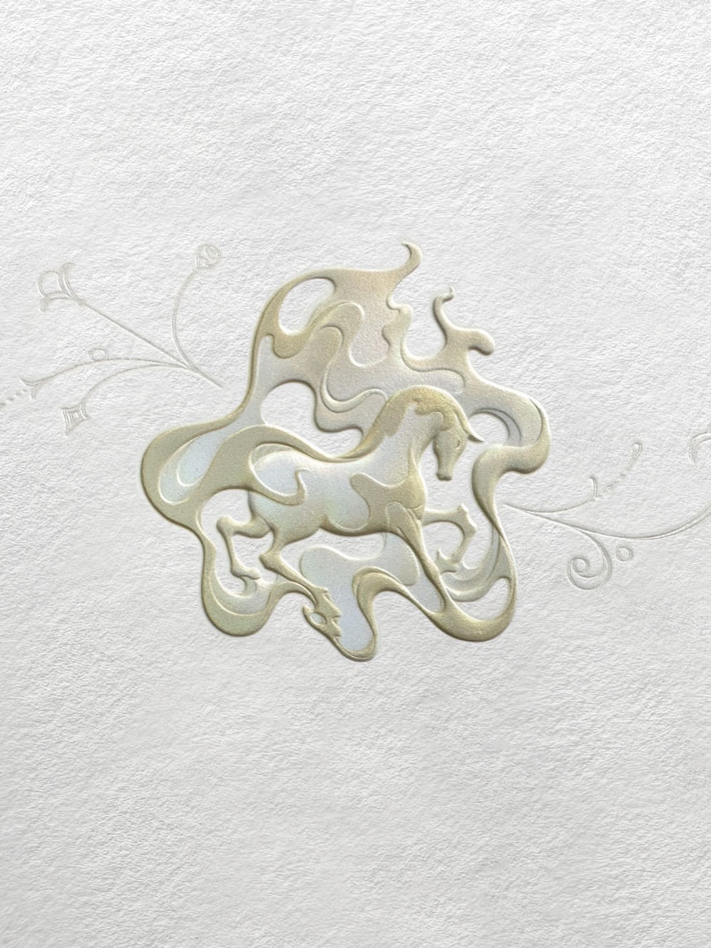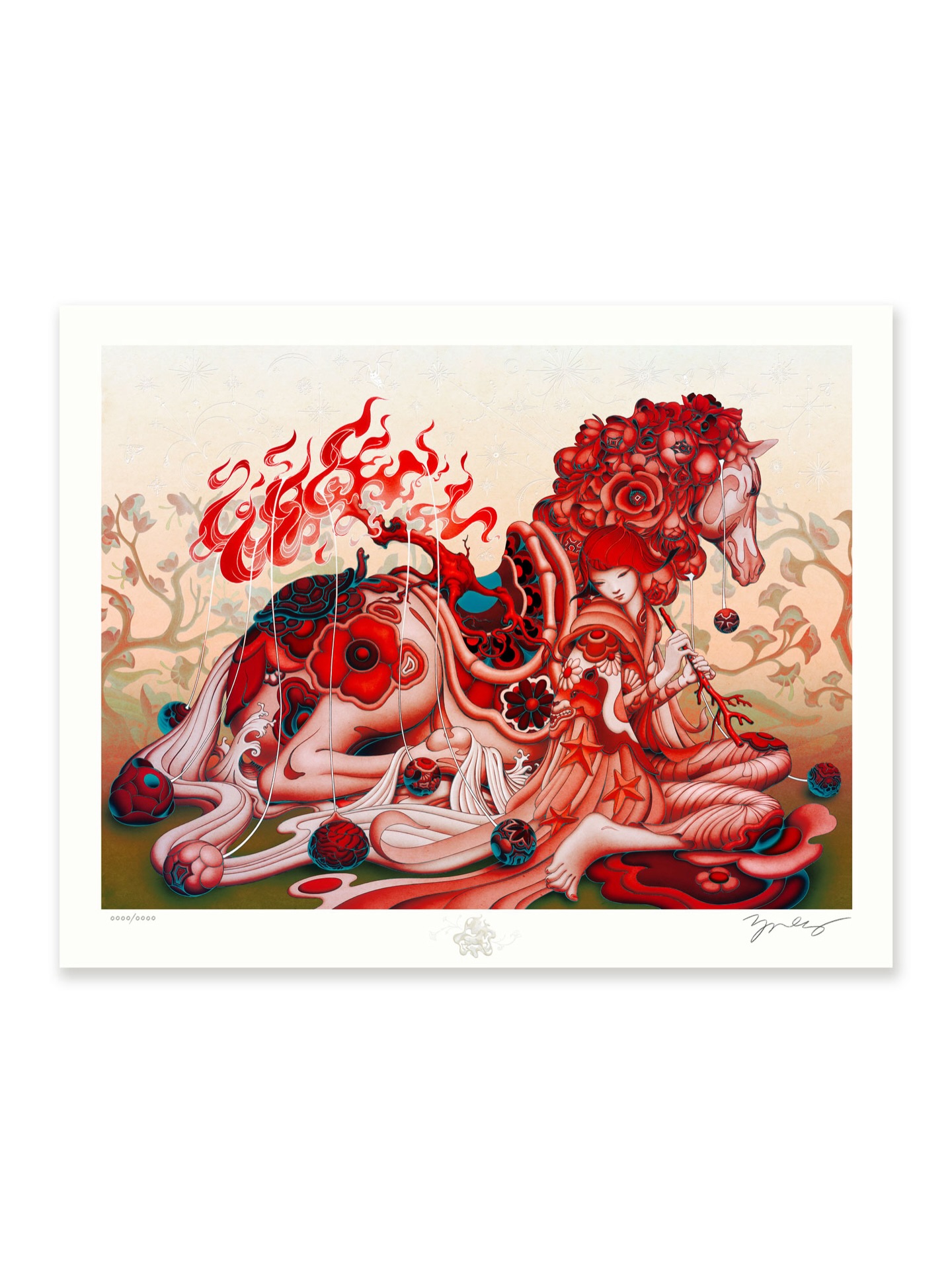 《Year of the Horse》以庆祝农历新年为主题,采用整幅浮雕压印与精致烫箔工艺呈现,兼具视觉冲击力与收藏价值。画面中,音乐家静坐于骏马身旁,吹奏珊瑚色长笛;一棵树自马鞍处生长并燃起火焰,火光随旋律舞动,构成梦境般的叙事场景。