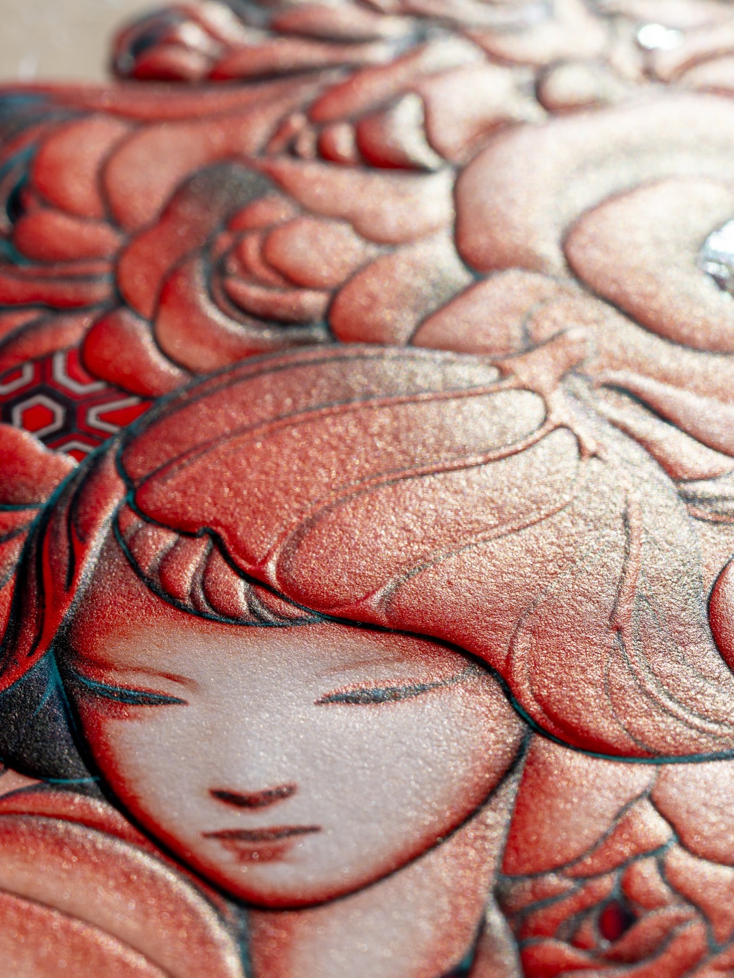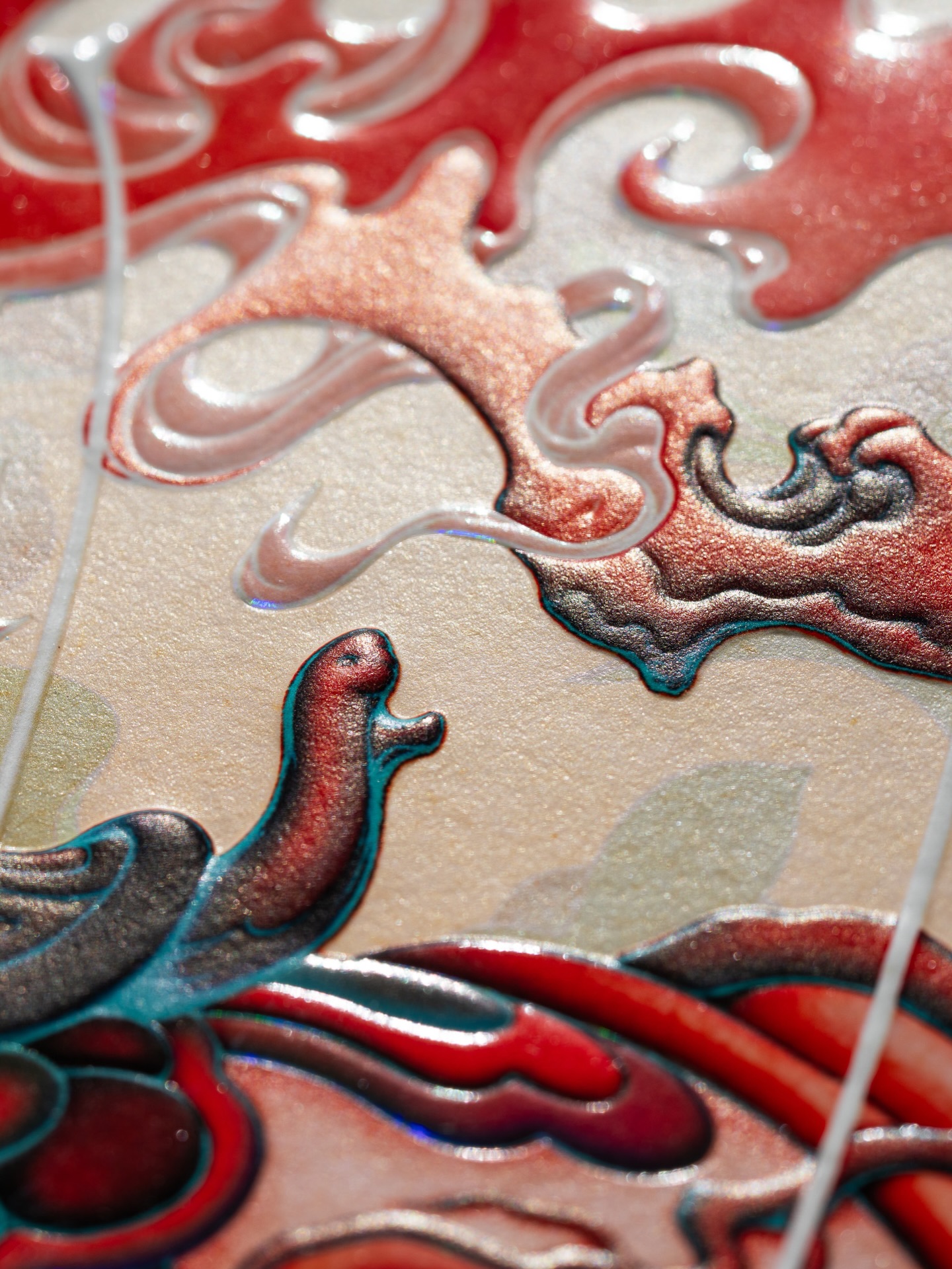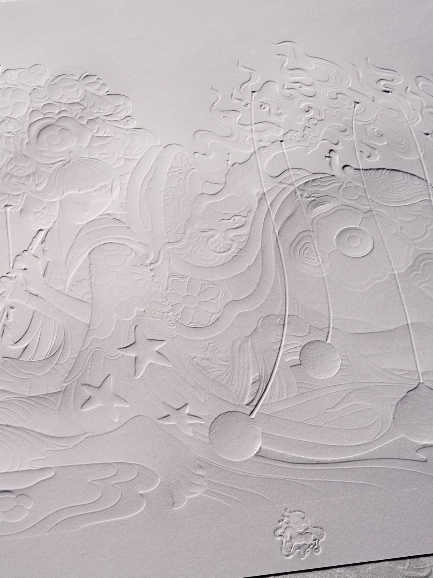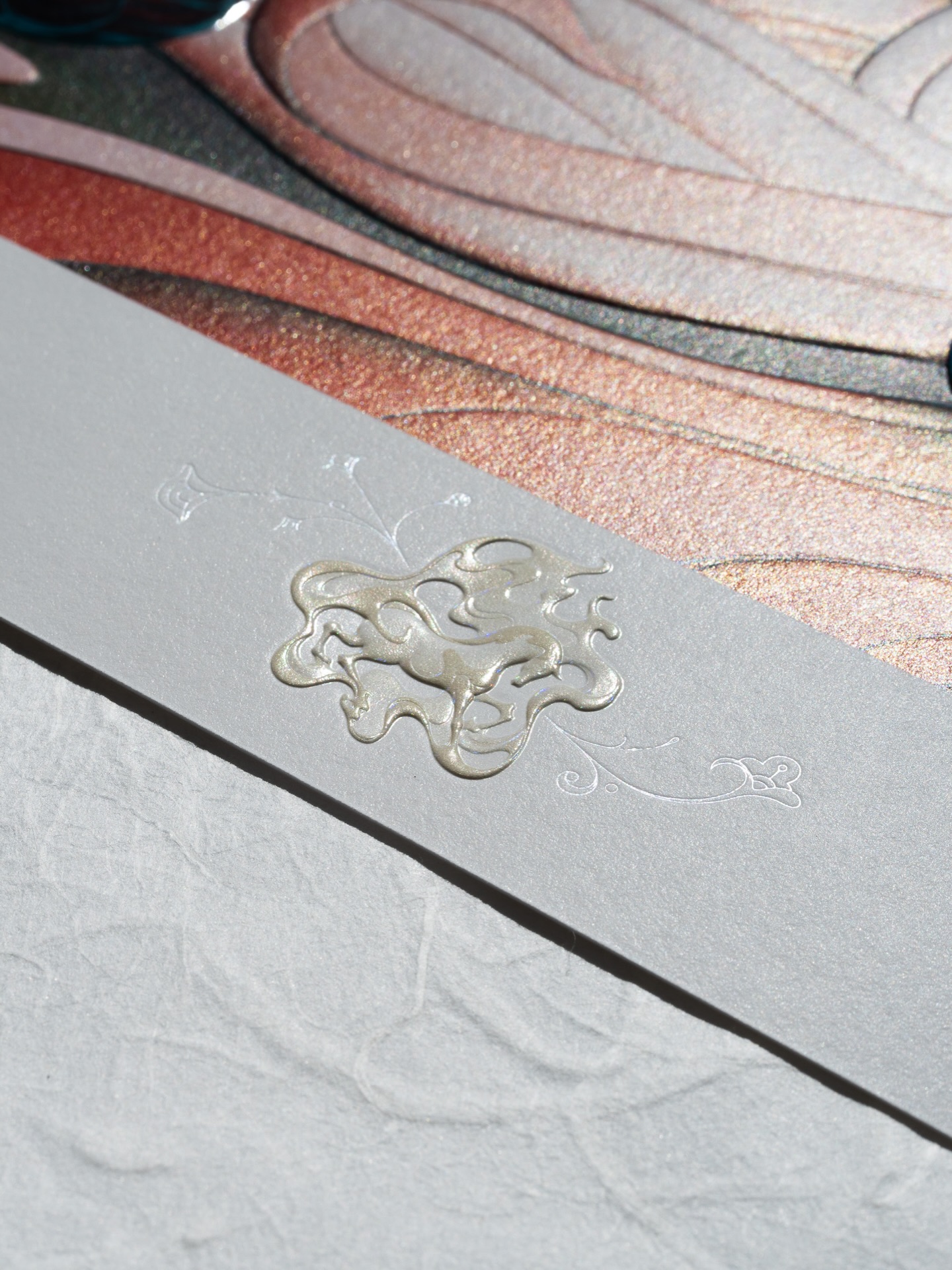 《Year of the Horse》以庆祝农历新年为主题,采用整幅浮雕压印与精致烫箔工艺呈现,兼具视觉冲击力与收藏价值。画面中,音乐家静坐于骏马身旁,吹奏珊瑚色长笛;一棵树自马鞍处生长并燃起火焰,火光随旋律舞动,构成梦境般的叙事场景。