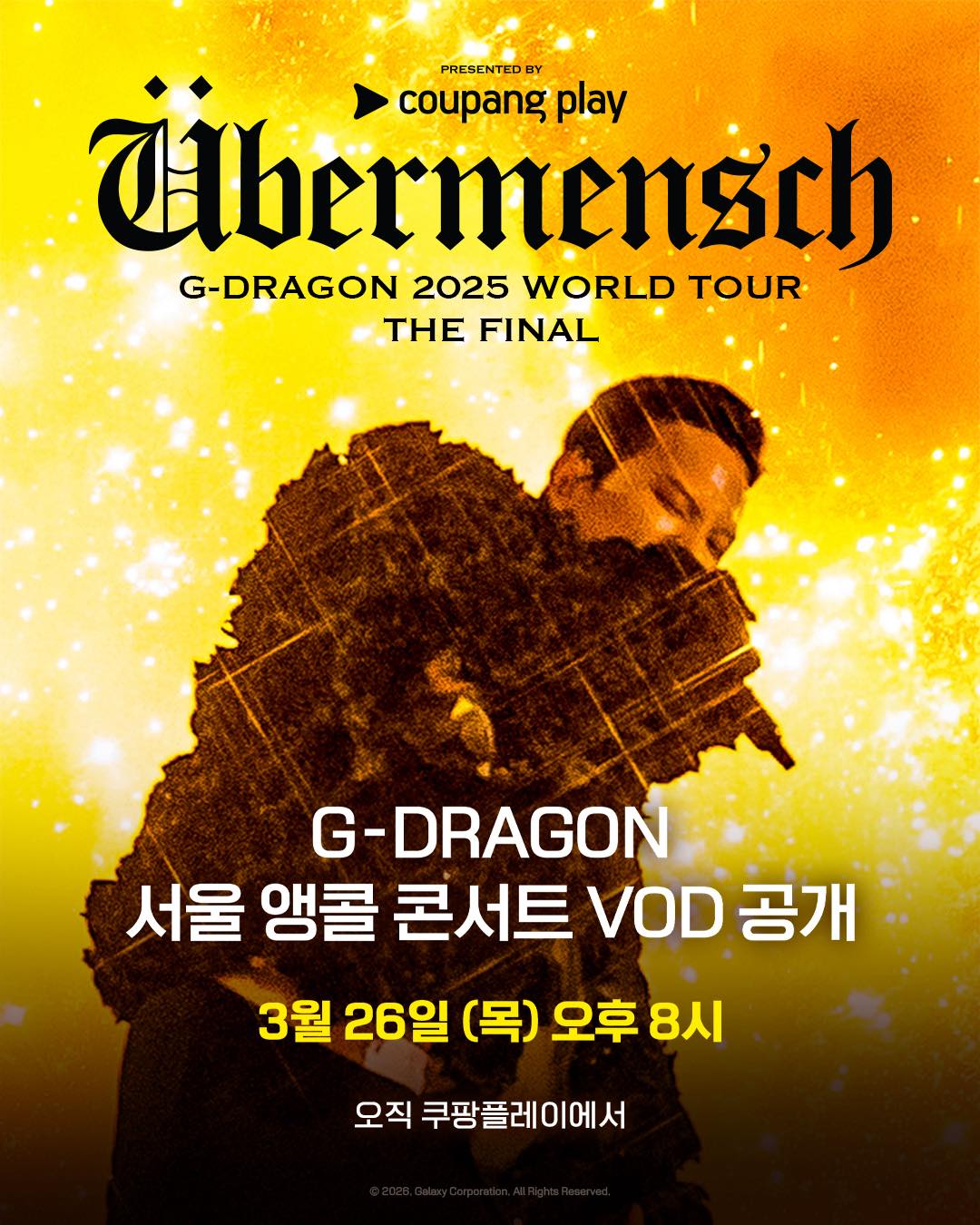 CoupangPlay 将首次以 4K 超高清格式发布 G-DRAGON 世界巡回演唱会最终场「G-DRAGON 2025 WORLD TOUR Übermensch IN SEOUL ENCORE」的现场视频。该视频不仅包含 G-DRAGON 去年精彩回归的「Übermensch」舞台,还包含与 BIGBANG 的联合舞台,太阳和大声也作为嘉宾亮相,抚慰未能亲临现场的粉丝们的遗憾。完整版将于 3 月 26 日晚上 8 点在 CoupangPlay 独家上线。