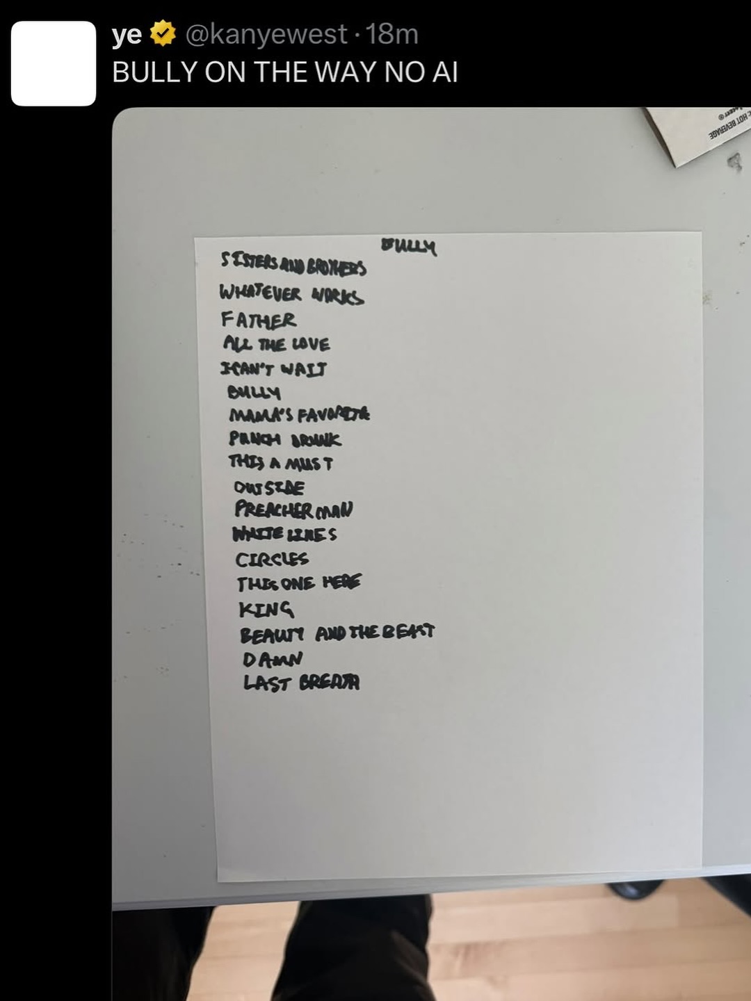 在《BULLY》试听会举办前一天,网络开始流传出该专辑的「黑胶版本」,并引发歌迷们对该专辑关于 AI 的各种言论。很快,Ye 在推特上完整公布了《BULLY》专辑的所有曲目,和流传的「黑胶版本」有较大出入,并亲自回应「没有 AI」。各位还是静等 3 月 27 日收听「正版」吧,完整曲目如下:
