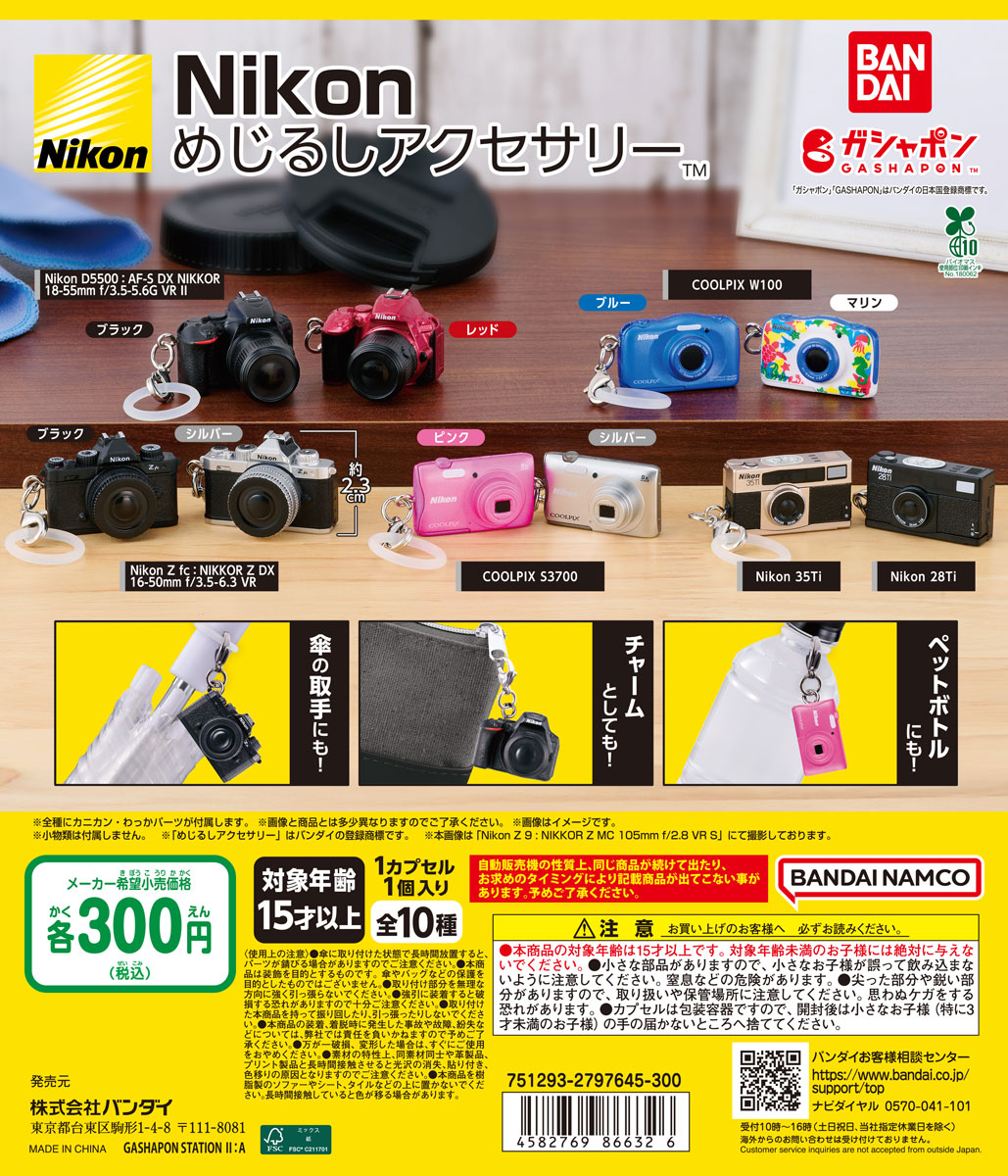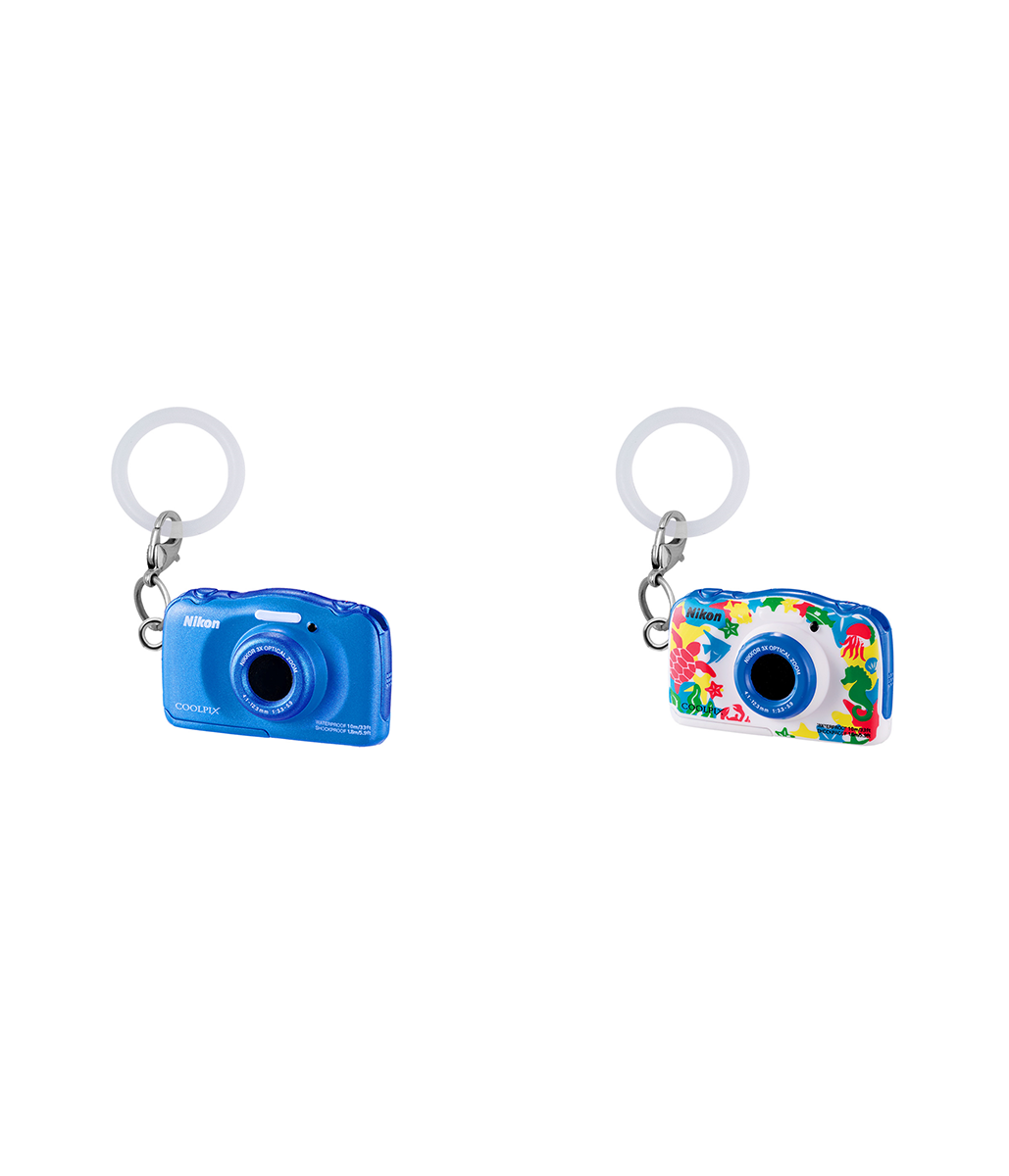 系列一包括 10 款尼康造型标记挂件,可挂于包袋、雨伞、拉链或水瓶之上。所有款式均包含钥匙链和塑料环。