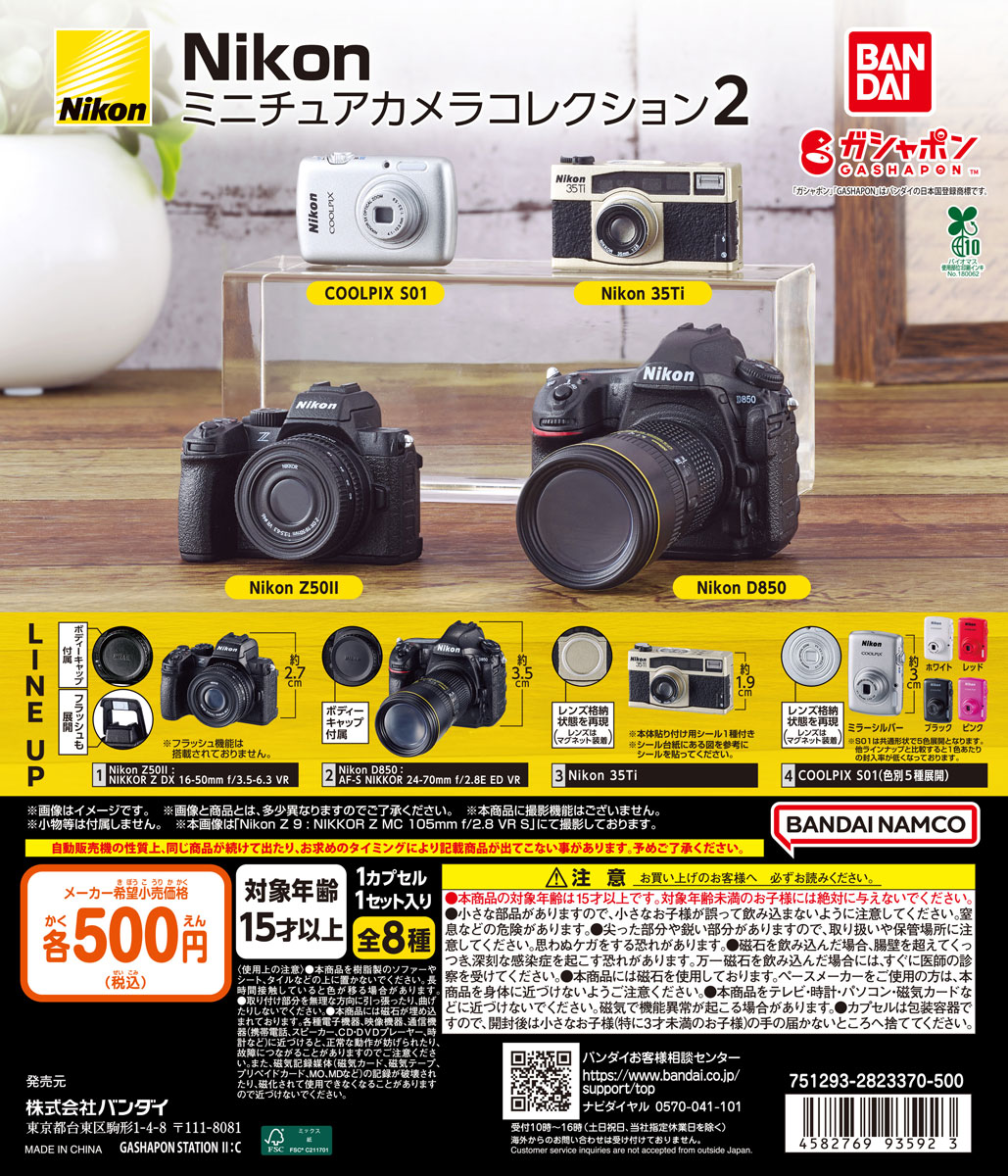系列二则包括 8 款尼康相机造型摆件,适合陈列于桌面一隅或收藏纪念。其中Nikon Z50Ⅱ:NIKKOR Z DX 16-50mm f/3.5-6.3 VR,轻巧机身融汇强劲性能,Z50Ⅱ具有同级别产品中优良的画质和对焦性能;Nikon D850:AF-S NIKKOR 24-70mm f/2.8E ED VR,以高像素与宽广动态范围著称, 从容应对风光与商业创作的多重表达;Nikon 35Ti 以钛合金机身、精工制造的四指针式仪表盘和高素质的 NIKKOR 35mm f/2.8 定焦镜头而闻名。COOLPIX S01(银色、黑色、白色、红色、粉红色)拥有小巧轻便的机身设计,采用耐磨不锈钢材质,搭载触摸屏与直观界面,让拍摄乐趣随时相伴。