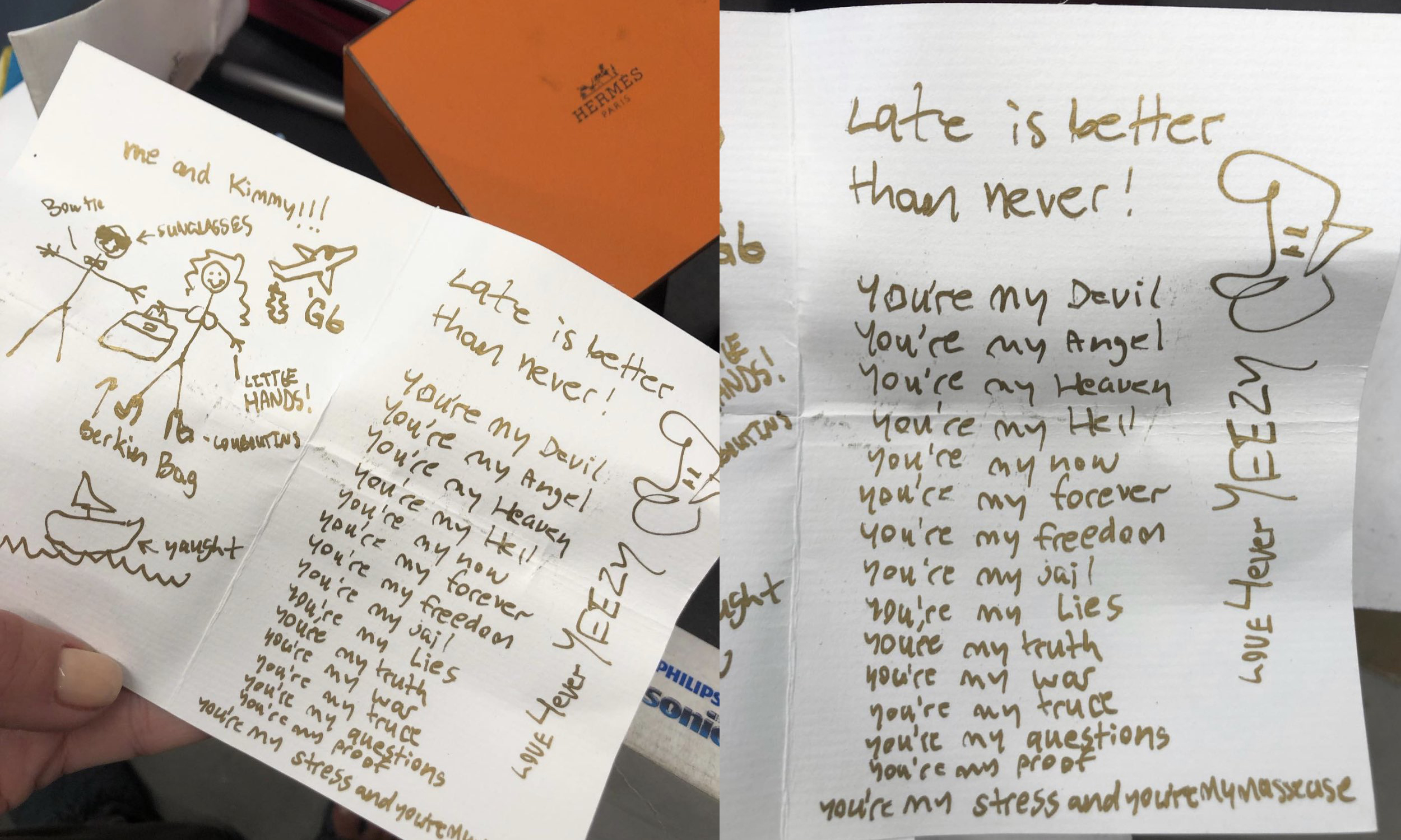 Kim Kardashian 在 Twitter 账号中曝光了当年丈夫送给她的 30 岁生日贺卡,除了亲笔手绘外,还有 Kanye 送给她的诗。并爆料,Kanye 创作《My Beautiful Dark Twisted Fantasy》时,一时灵感枯竭,写不出歌词,突然想到这首诗,于是将其制作成一首歌曲,也正是大众熟知的热门单曲《Lost In The World》。Kim 也深情写道,「我保存着所有东西」。