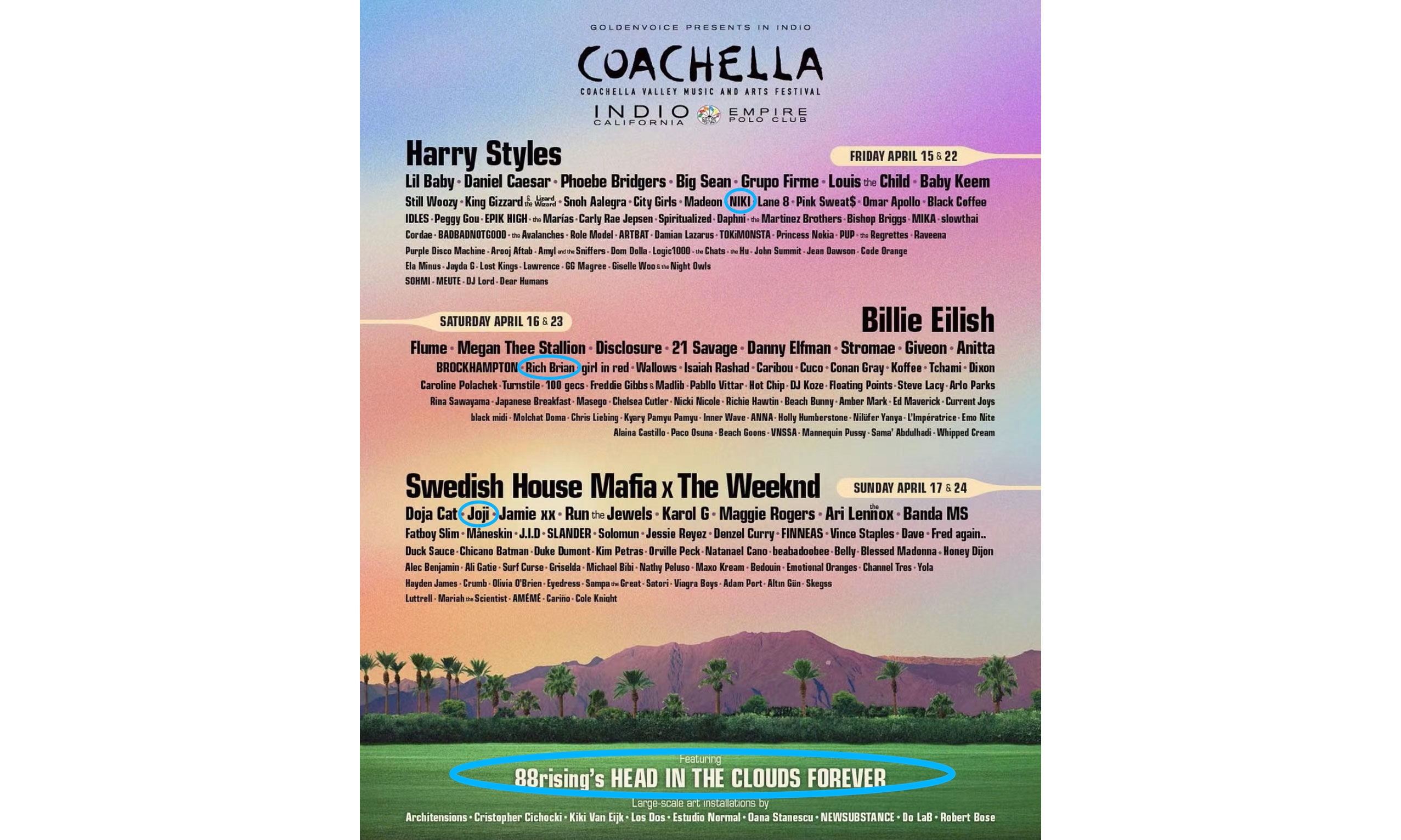 在科罗拉多沙漠的广袤天空下,88rising 将于中国时间 4 月 17 日周日上午 9:45 正式在世界最受瞩目 —— Coachella 音乐节主舞台上开启历史性的「Head In The Clouds Forever」演出。88rising 是 Coachella 音乐节史上第一家在主舞台策划并呈现厂牌专属时段的唱片公司,这场长达 80 分钟的集体演出,将向世界展示最优秀亚洲艺术家们,包括王嘉尔、CL、Rich Brian、NIKI、BIBI、MILLI、Warren Hue 以及 J-Pop 代表人物宇多田光的首次音乐节亮相。