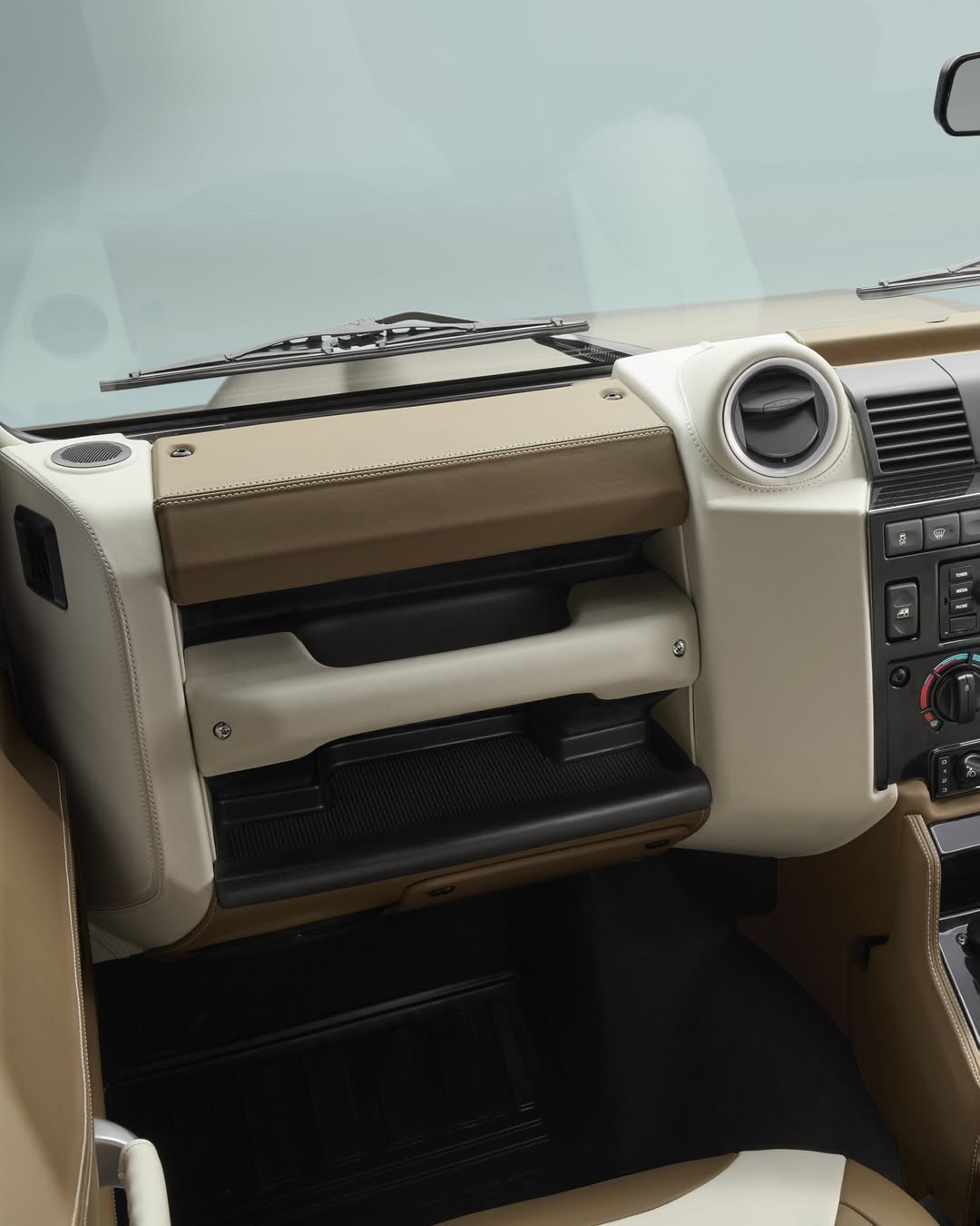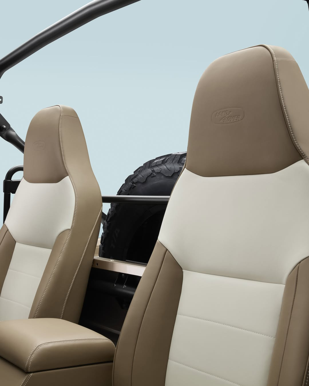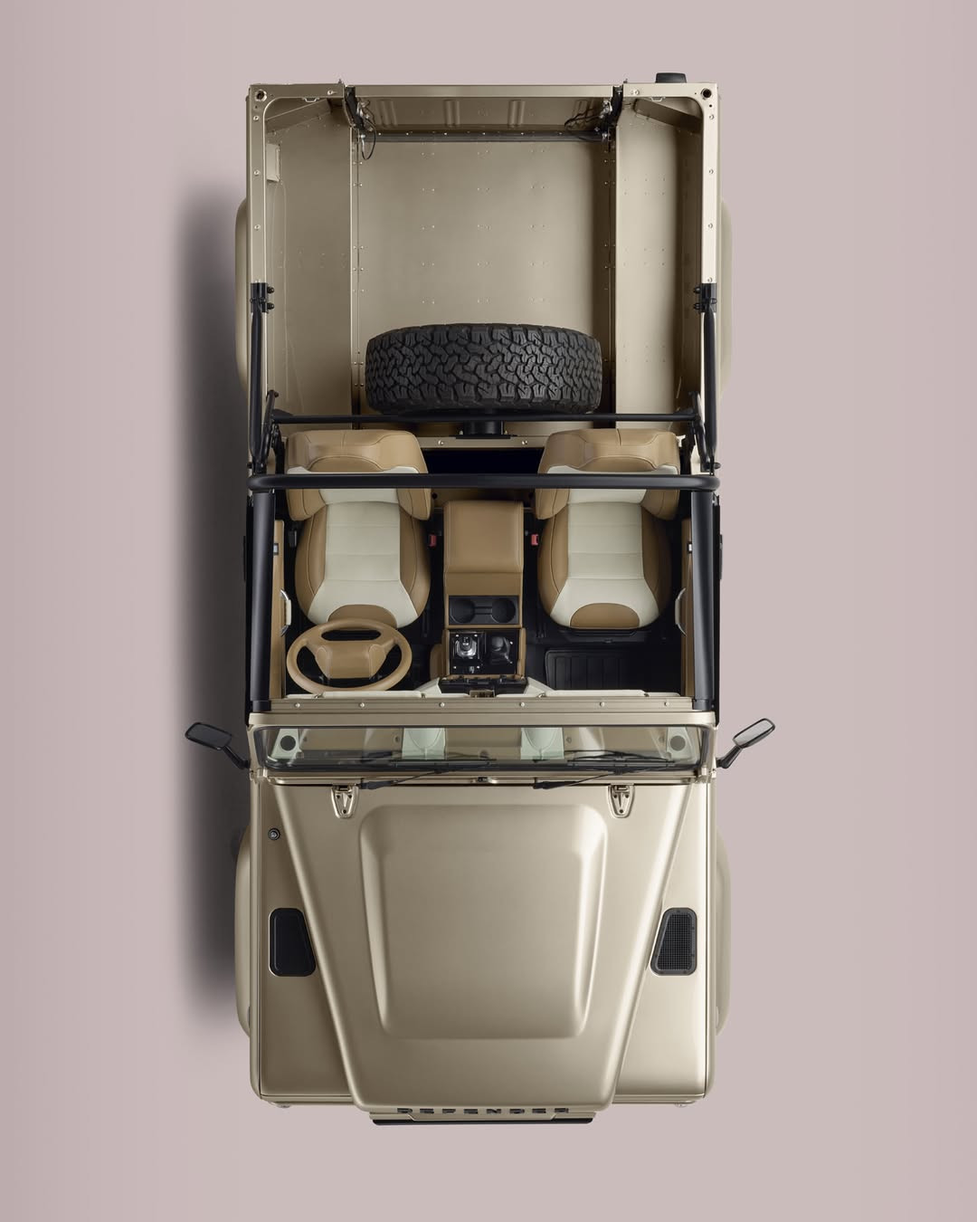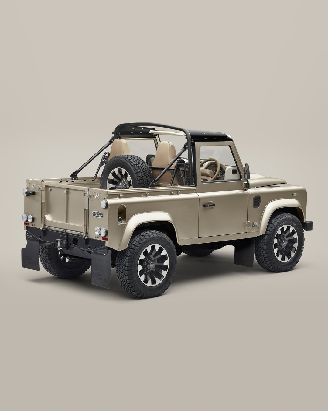 这次推出的短轴 90 版本搭载 5.0 升 V8 引擎,输出达 405 匹马力,并配备八速自动变速箱,在保留经典造型的同时提供强劲动力与上空驾驶体验。新车精选 2012 至 2016 年间的 Defender 车型作为基础,由工匠手工改造升级,包含重新调校的悬吊系统、Alcon 高性能刹车、以及参考 2016 年最终量产版本的复古帆布顶篷。此外还配备经典绳钩锚点及专为北美 NAS 90 设计的车顶支架。