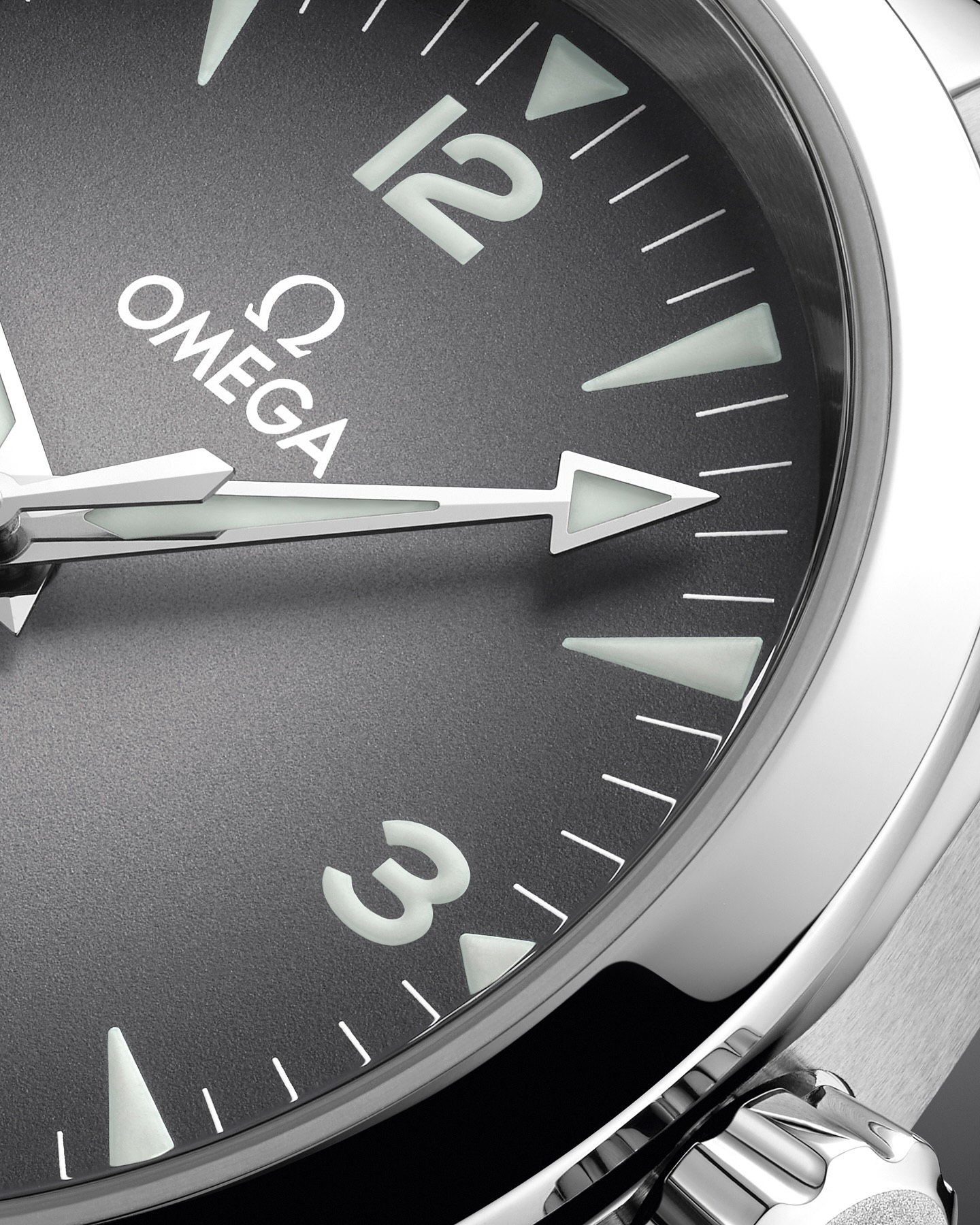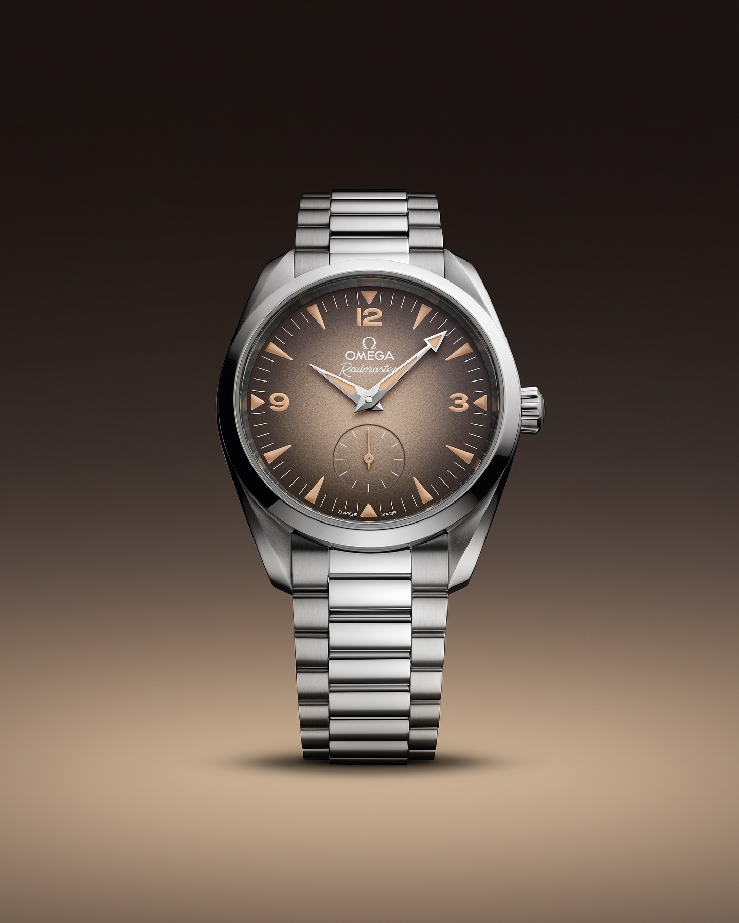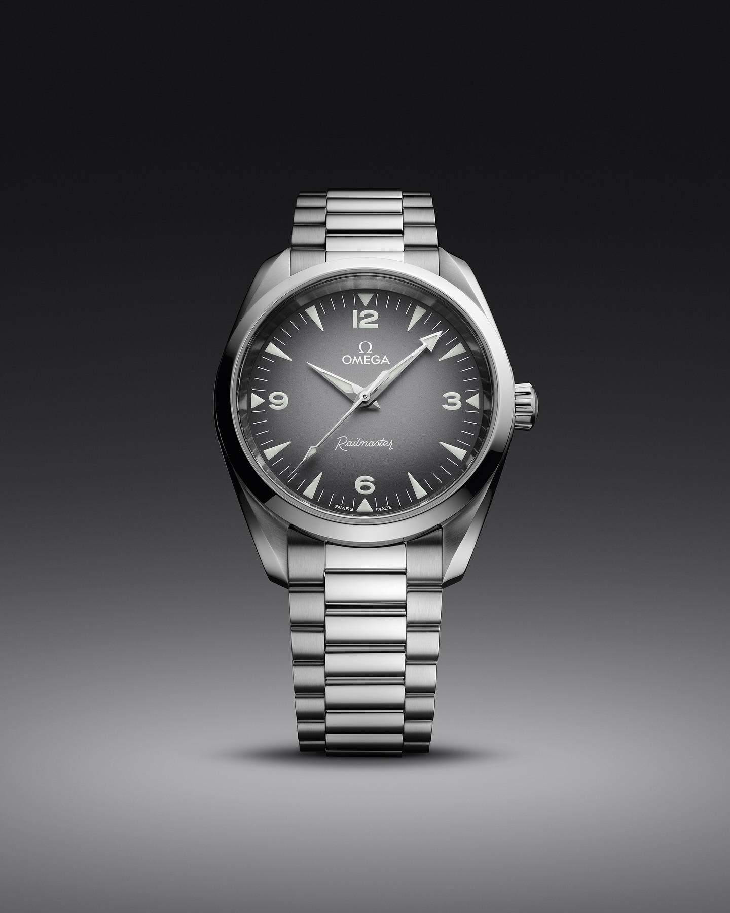 此番推出的全新版本以不锈钢材质打造,38mm 尺寸,共两种款式。其中一款延续初代设计,采用灰色表盘搭配黑色渐变处理,整体风格极为简约,仅保留 OMEGA 标志与「Railmaster」字样,搭配高可视性的白色 Super-LumiNova 夜光刻度,提供皮革表带与金属表链两个版本;另一款则以 2004 年版本为灵感,表盘为米色调配黑色渐变,并搭载小秒针功能,时标则使用复古风格的 Super-LumiNova 夜光材料,同样提供皮质与金属两种表带选择。