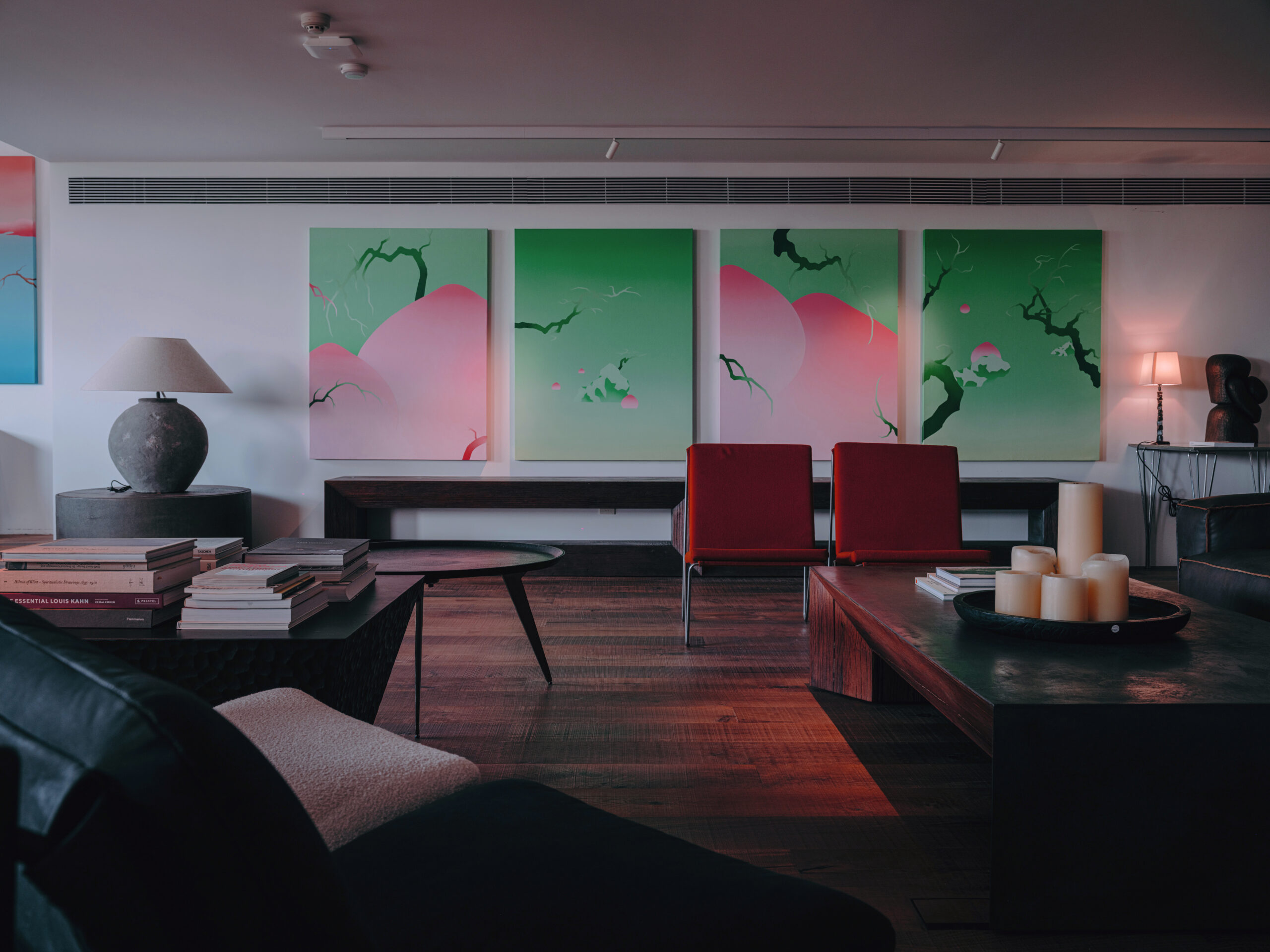 色彩体系的构建也同样具有深意。在《荧山》系列中,桃形山体以超现实姿态悬浮,高纯度色彩经喷枪渐变处理,既保留涂鸦的冲击力,又配合着工笔细腻描画的淡然。这种色彩的「克制狂欢」。在图像符号的选择中,仍然可见潮州文脉以及东方文化对其创作的深刻影响。福桃、红花、果实等吉庆形象,脱胎于宗族祭祀的视觉传统,在林子楠的笔下又获得新的语义:《荧山》中的悬浮桃山,既是长寿福泽的东方隐喻,也是现代性欲望膨胀的超现实映射;《迁 CIÊNG》中的英歌舞元素,将古代傩礼「鸣鞭驱鬼」的仪式感,转化为当下民俗文化中的一场对话。