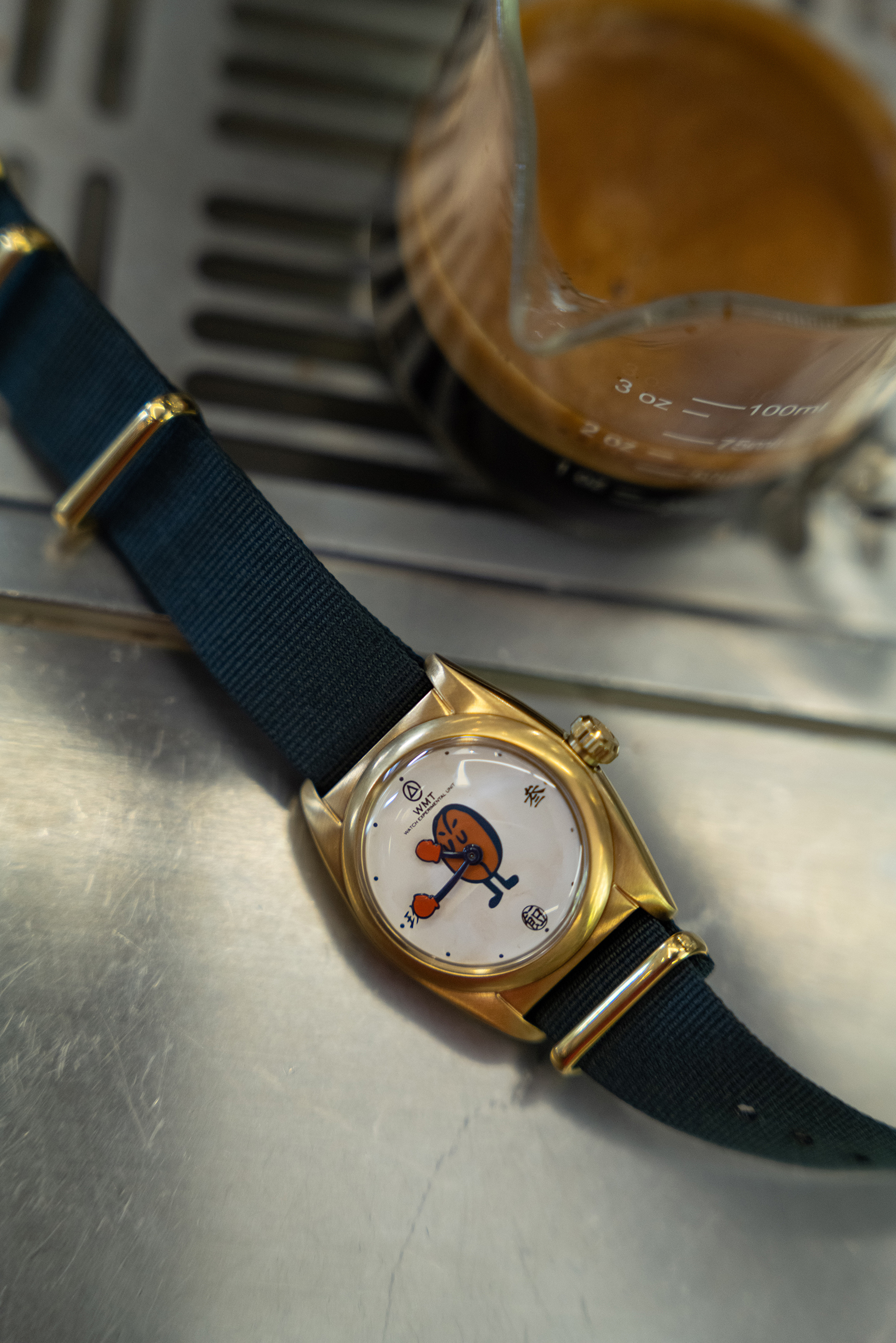 WMT 由 Alan Shum 于 2016 年在香港创立,以「实验精神」重新演绎复古时计。此次除了联名表款,还同步推出主题 T 恤与帽子。T 恤背面印有活泼的餖力士,正面胸口点缀双方联名 logo,黑色帽款饰以双方白色 logo 刺绣。整个系列延续了 WMT 的怀旧美学,以及餖咖啡的独特载体与自我表达风格。
