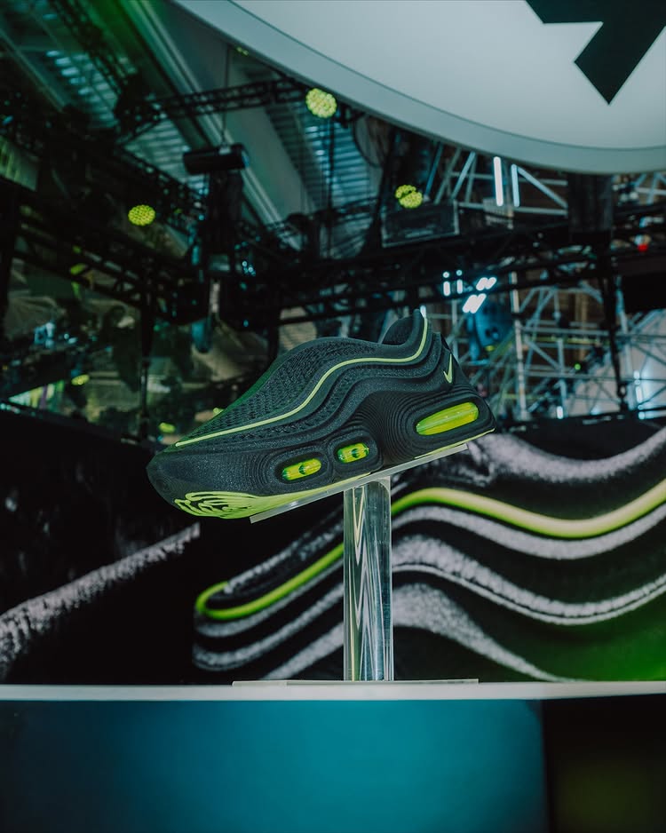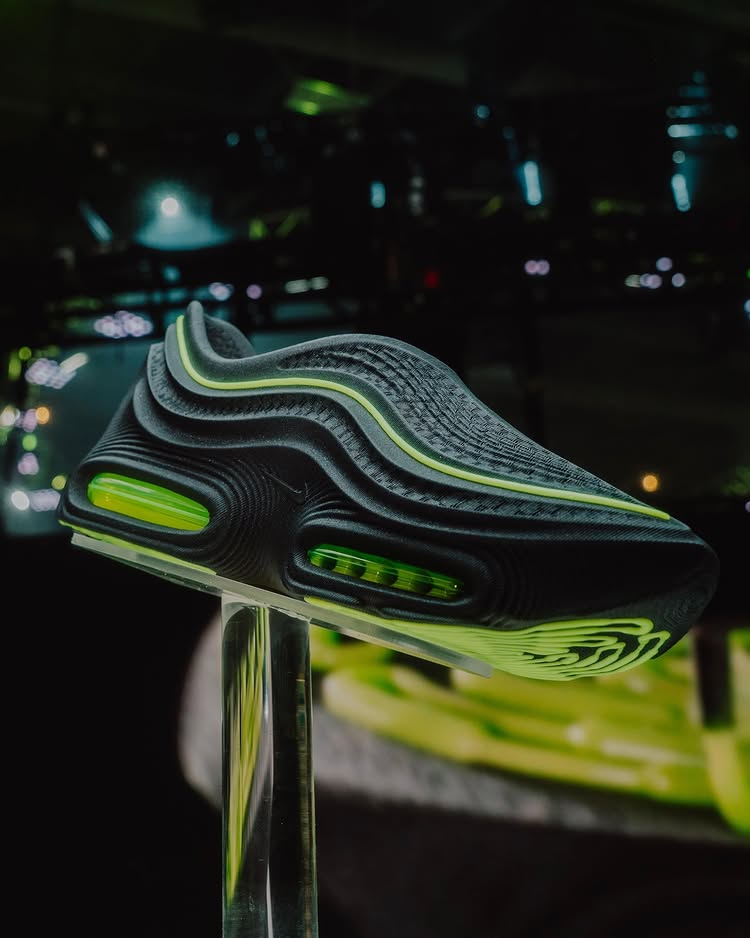 Air Max 95000 采用 Zellerfeld 的 3D 打印技术,鞋面无缝设计、无鞋带,并使用其标志性的网格结构,呈现出动感十足的外观。鞋身配色为亮眼的「Volt」电光绿,象征 Nike 的创新精神,与全黑色的鞋面形成鲜明对比。